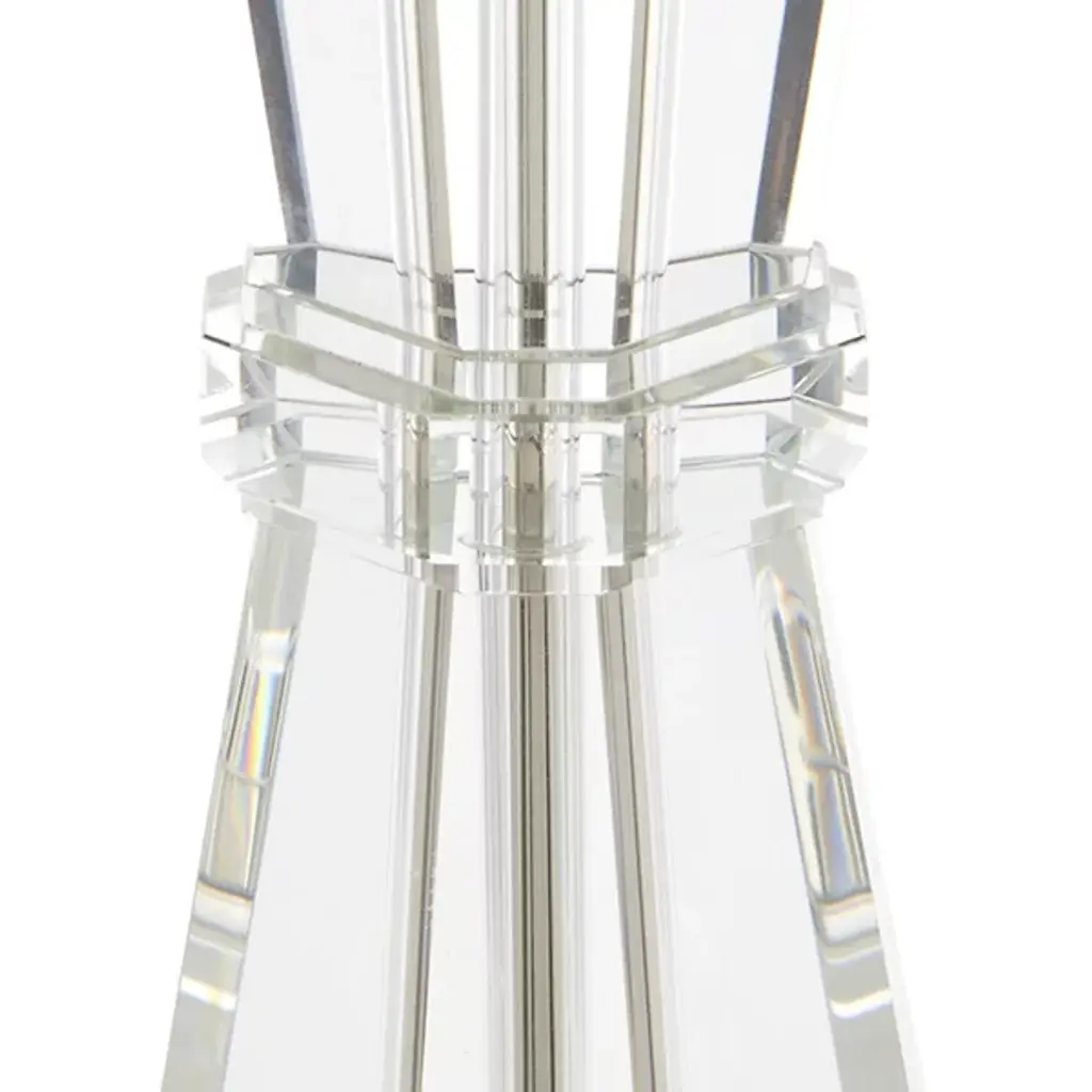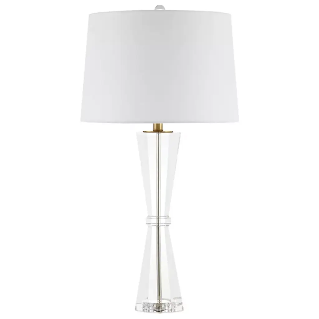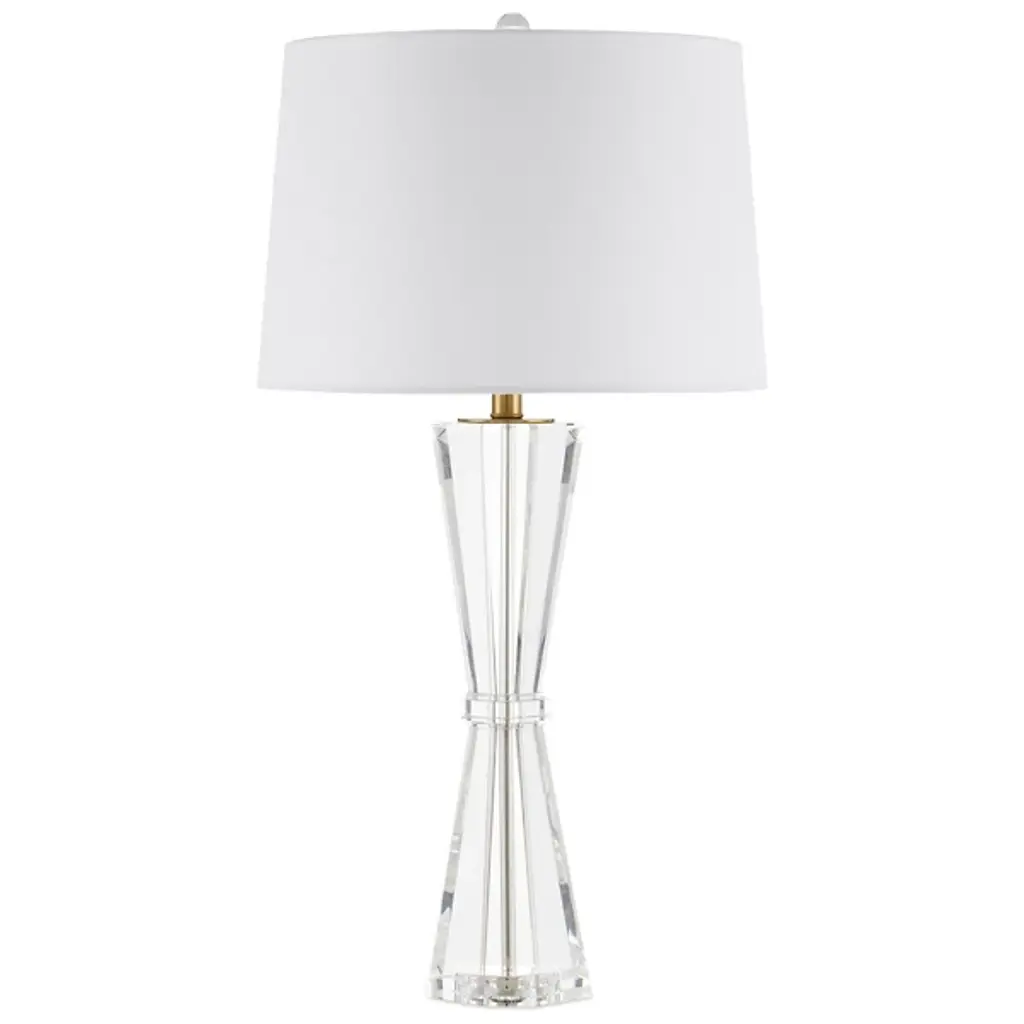The Duveen Table Lamp from Currey & Company shapes optic crystal into a refined hourglass figure. An octagonal band cinches the middle, emphasizing the symmetrical flare at the top and bottom. The crystal construction captures and refracts light throughout the day, creating natural brilliance even when unlit. Polished brass accents complement the crystal's natural luminosity, and a fine linen shade tops this desk lamp. Its handcrafted nature ensures subtle variations in how each piece interacts with illumination.
