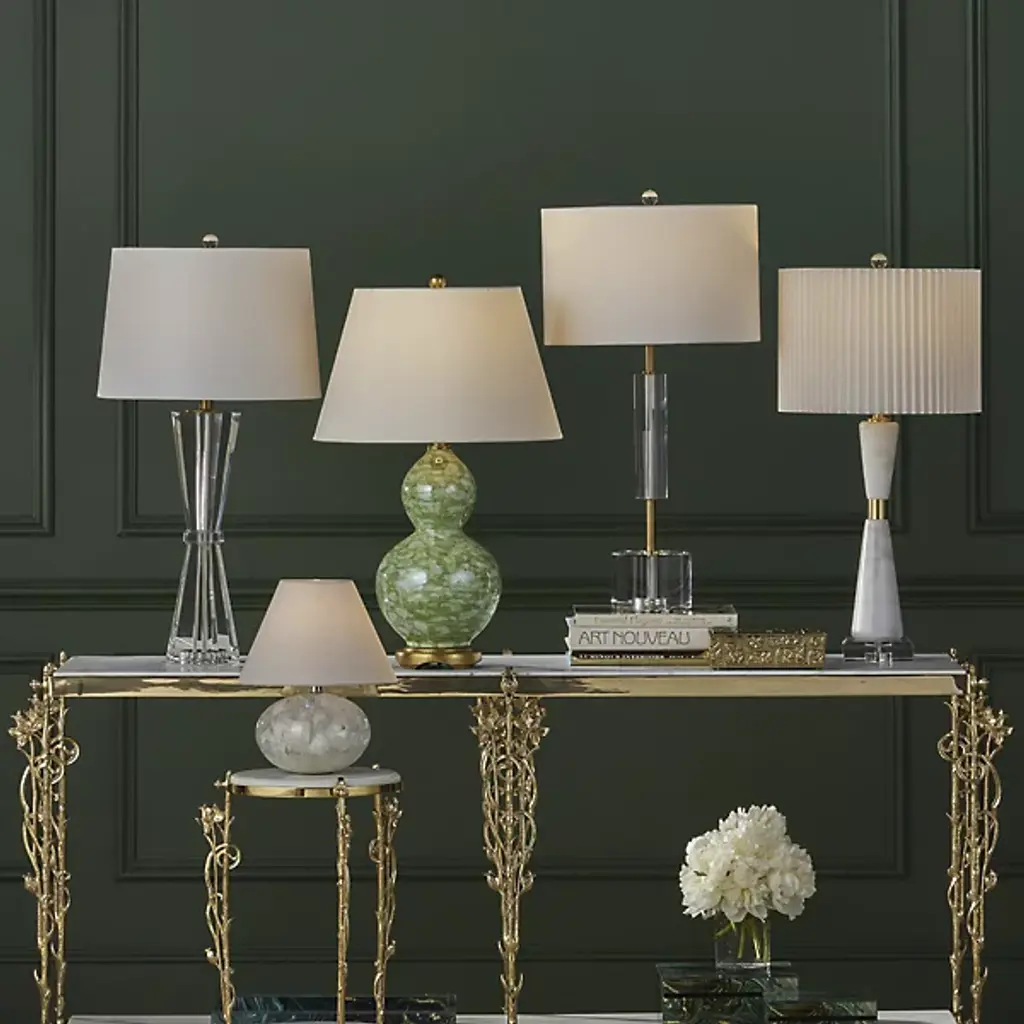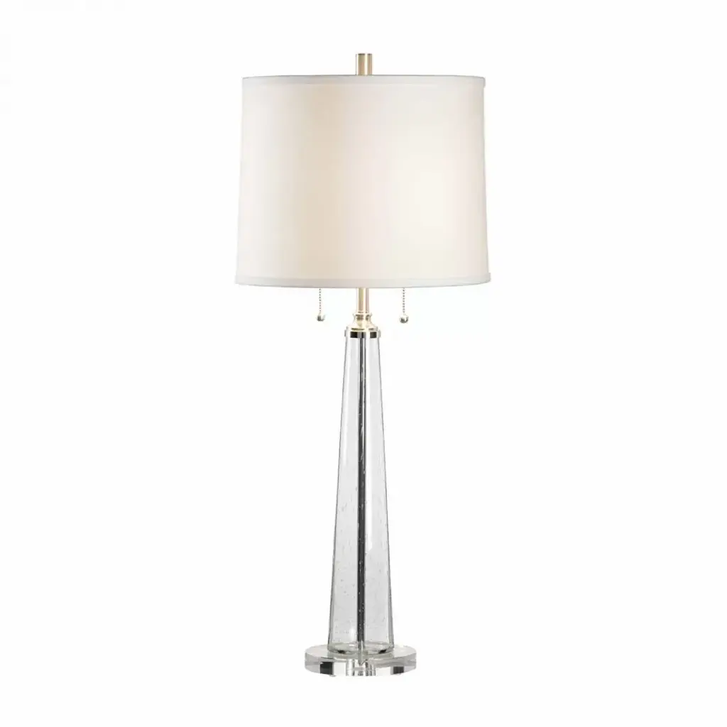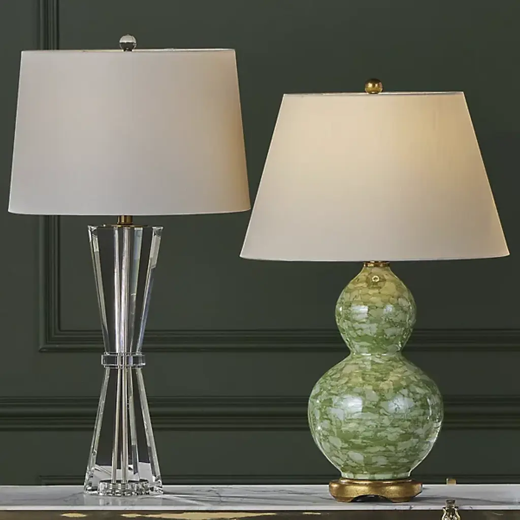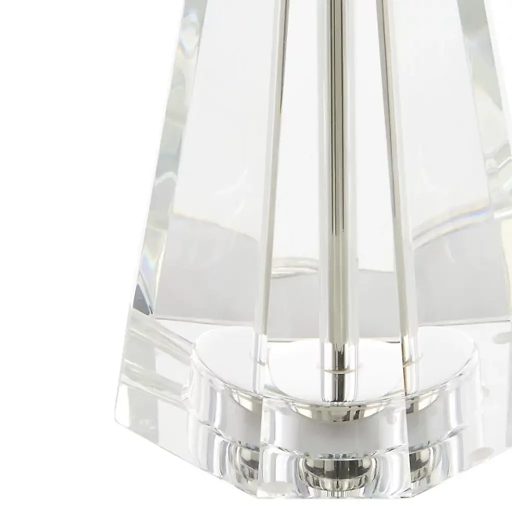The Duveen Table Lamp from Currey & Company shapes optic crystal into a refined hourglass figure. An octagonal band cinches the middle, emphasizing the symmetrical flare at the top and bottom. The crystal construction captures and refracts light throughout the day, creating natural brilliance even when unlit. Polished brass accents complement the crystal's natural luminosity, and a fine linen shade tops this desk lamp. Its handcrafted nature ensures subtle variations in how each piece interacts with illumination.