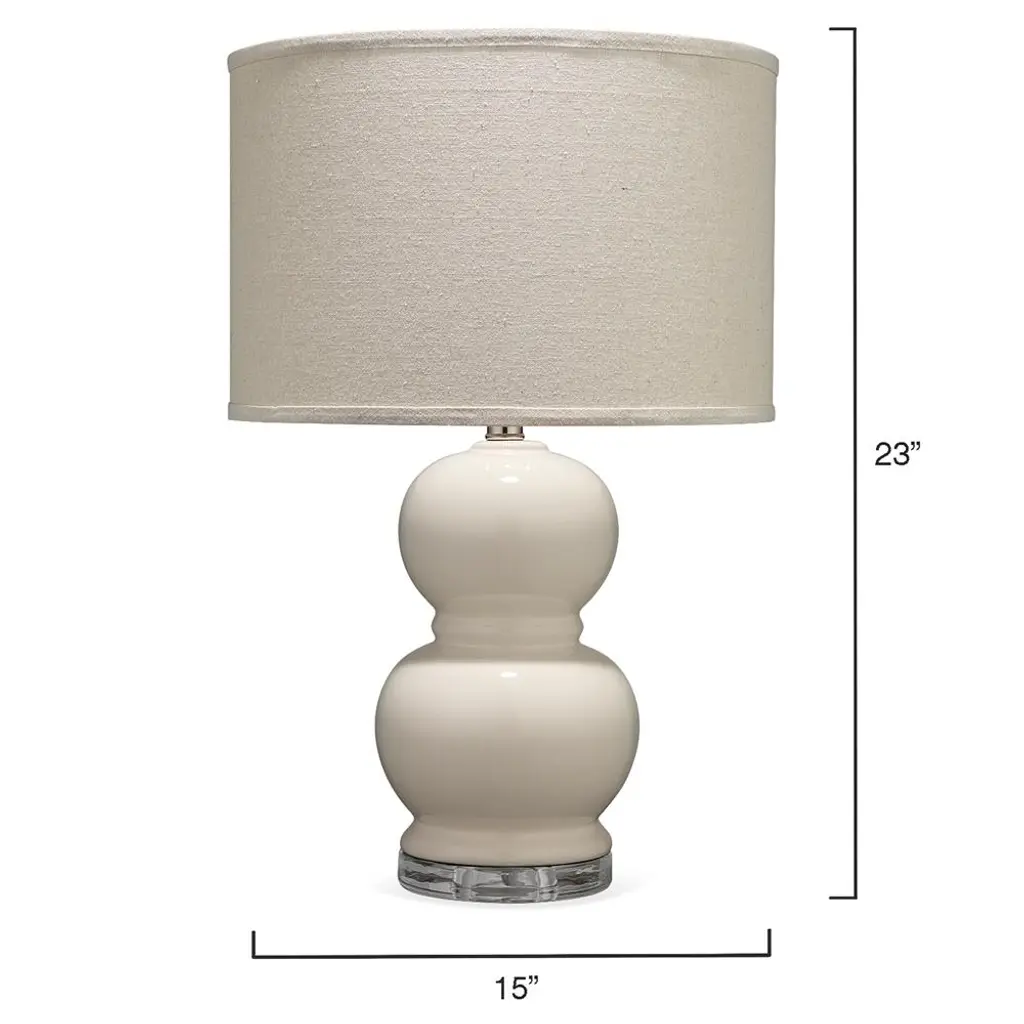 The classic Dwayne table lamp makes an easy complement to most interior design styles. With a glass base and cream ceramic body, its gorgeous curved shape adds dimension to a side table, console table, or nightstand. The pebble linen drum shade is lightly textured, bringing a warm, diffused glow to any room.