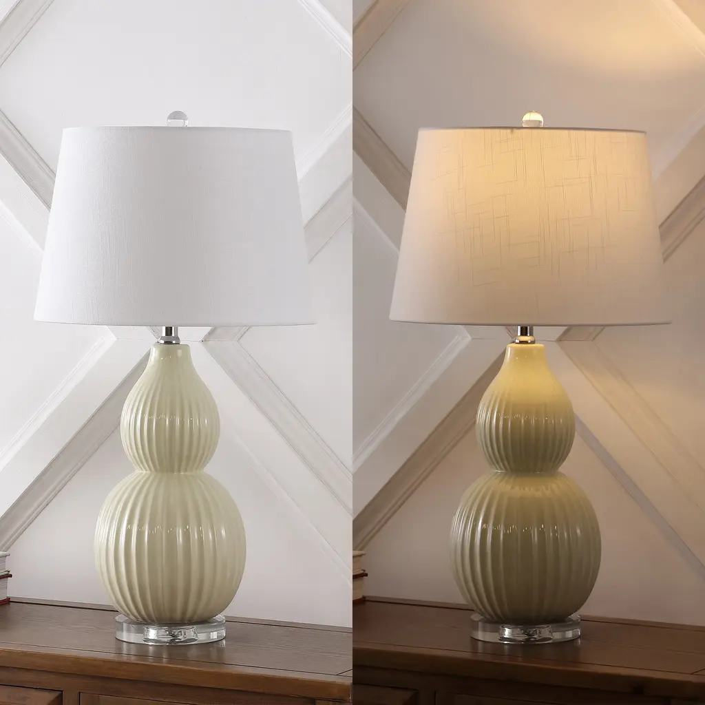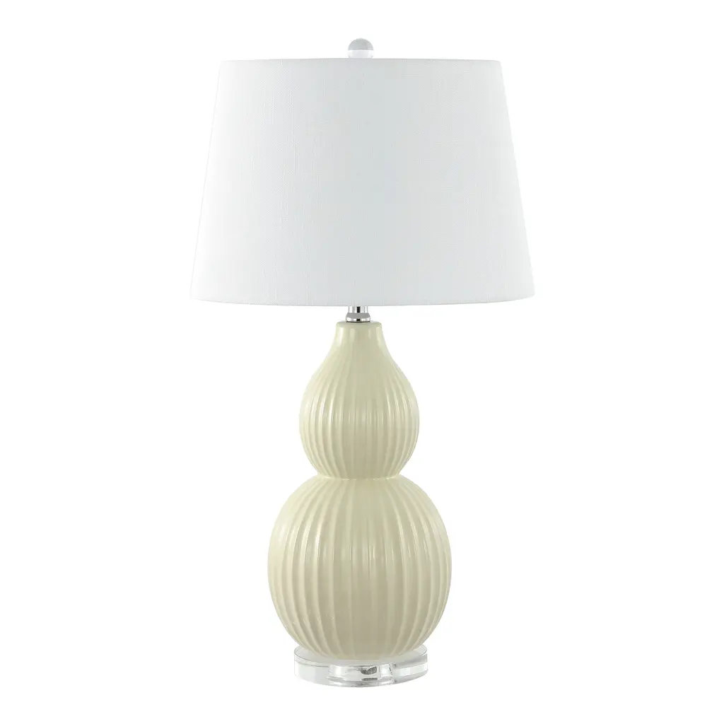 The classic double gourd lamp gets an elegant update with the addition of narrow fluting on this beautiful base. Beautifully made from ceramic, glossy cream glaze will brighten your favorite hideaway. A classic, white cotton drum shade adds an elegant finishing touch. Features:Dimensions:About us:You see a lamp.We see a decorative work of art.A perfectly curved shade casts a dramatic shadow on a floor. A silk cord you never want to hide. Compatible with LED lightbulbs: as easy on the environment as they are on the eyes. The JONATHAN Y Lighting collection considers every detail from impeccably sourced materials to designer styling. And our prices are so attractive, we've transformed a functional necessity into a fashion accessory.JONATHAN Y Lighting - a fashion revolution in home decor.