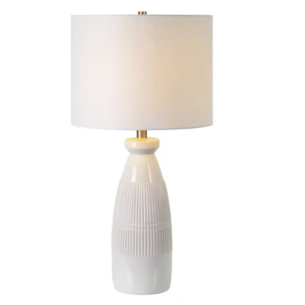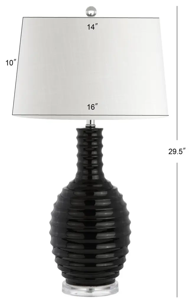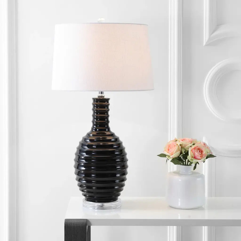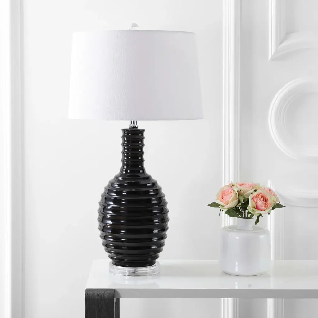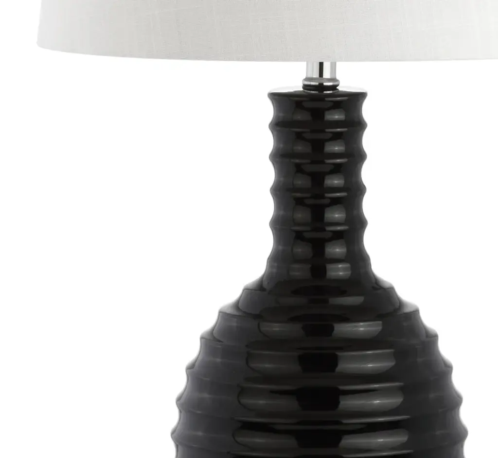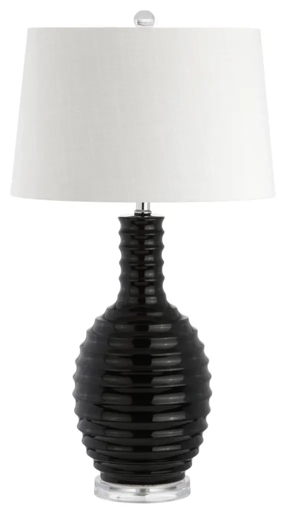 Boasting a spiraling, ribbed base made from a black glaze on ceramic, this lamp offers stylish acrylic detailing that includes a base plate and finial. The shade adorning this lamp is a subtly textured ivory linen hardback drum and the cord is silk-wrapped in a matching black color. We love the sculptural simplicity of the classic vessel shape, and the perfectly proportioned height.-Spiraling, ribbed texture delivers chic movement and elegance to this contemporary black table lamp -100% cotton hardback drum shade in white-Beautiful to display or easy to conceal: the 60" cord is silk-wrapped-On-off rotary switch on socket-Takes one bulb and compatible with any 9W LED or 60W Type "A" or 13W CFL-Eco-friendly 9W LED bulb included-UL Listed-Color: Black with white shade-Body Material: Ceramic / Acrylic-Base Material: Clear-Finial Material: Crystal-Finial Color: Clear-Harp Color: Silver-Includes: One (1) lamp(s)-Minor Assembly Required-Lamp: 29.5 inches high x 16 inches wide x 16 inches deep-Shade: 10 inches high x 16 inches wide x 16 inches deepYou see a lamp.We see a decorative work of art.A perfectly curved shade casts a dramatic shadow on a floor. A silk cord you never want to hide. LED lightbulbs: as easy on the environment as they are on the eyes. The JONATHAN Y Lighting collection considers every detail from impeccably sourced materials to designer styling. And our prices are so attractive, we''ve transformed a functional necessity into a fashion accessory.JONATHAN Y Lighting - a fashion revolution in home decor.