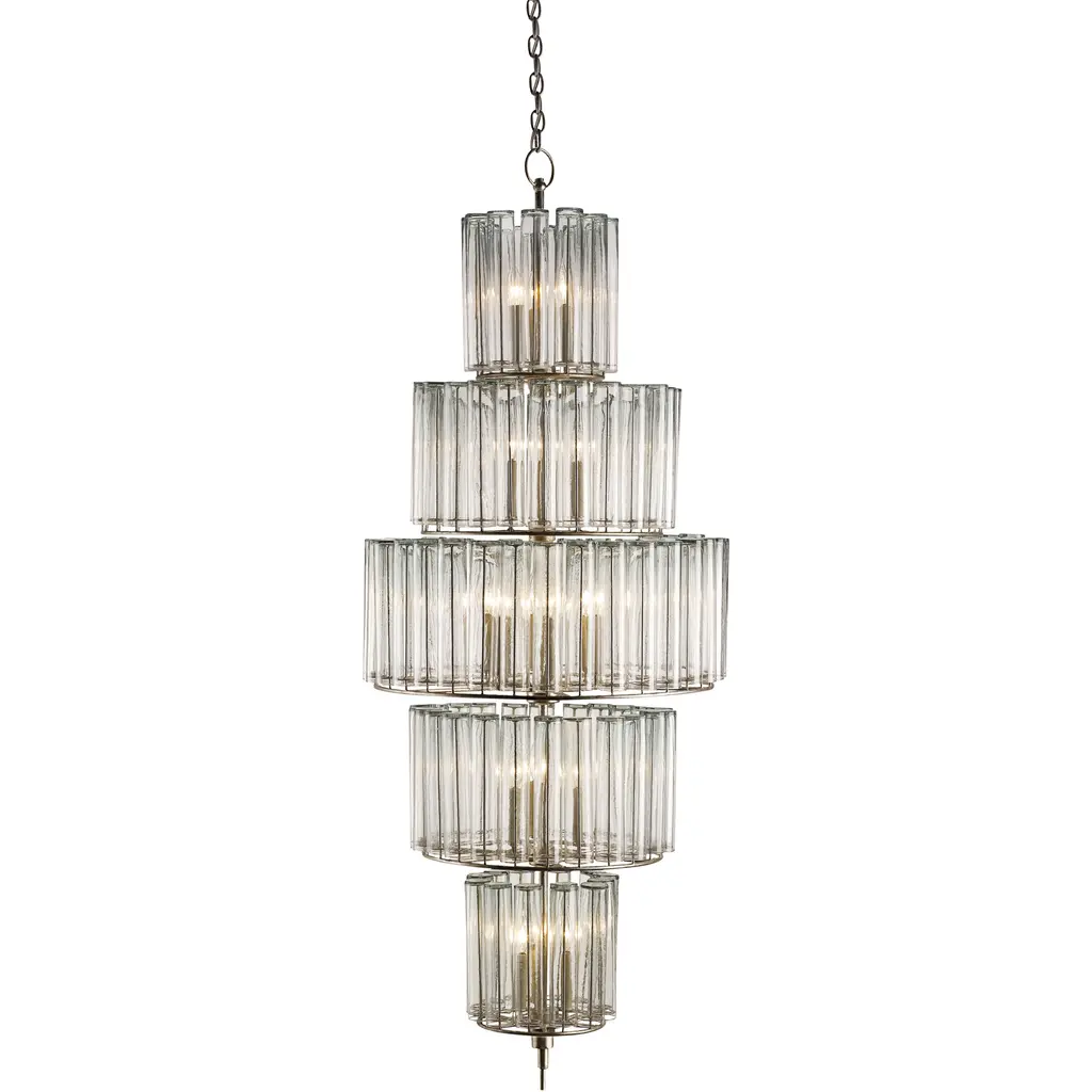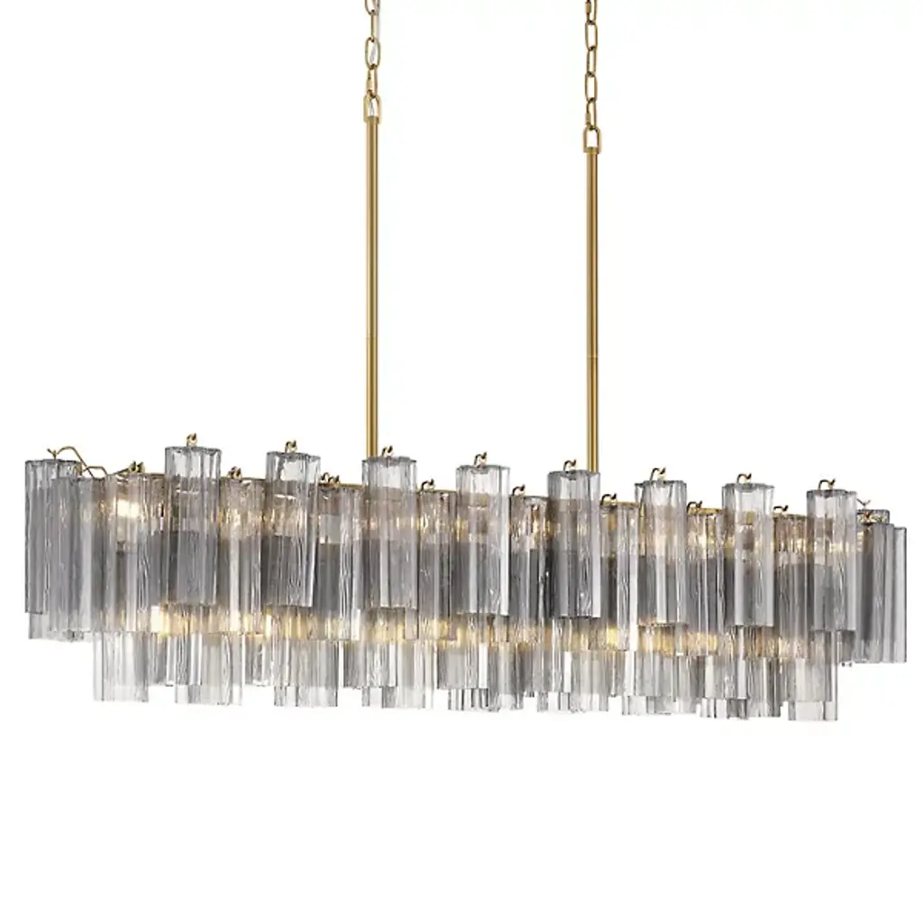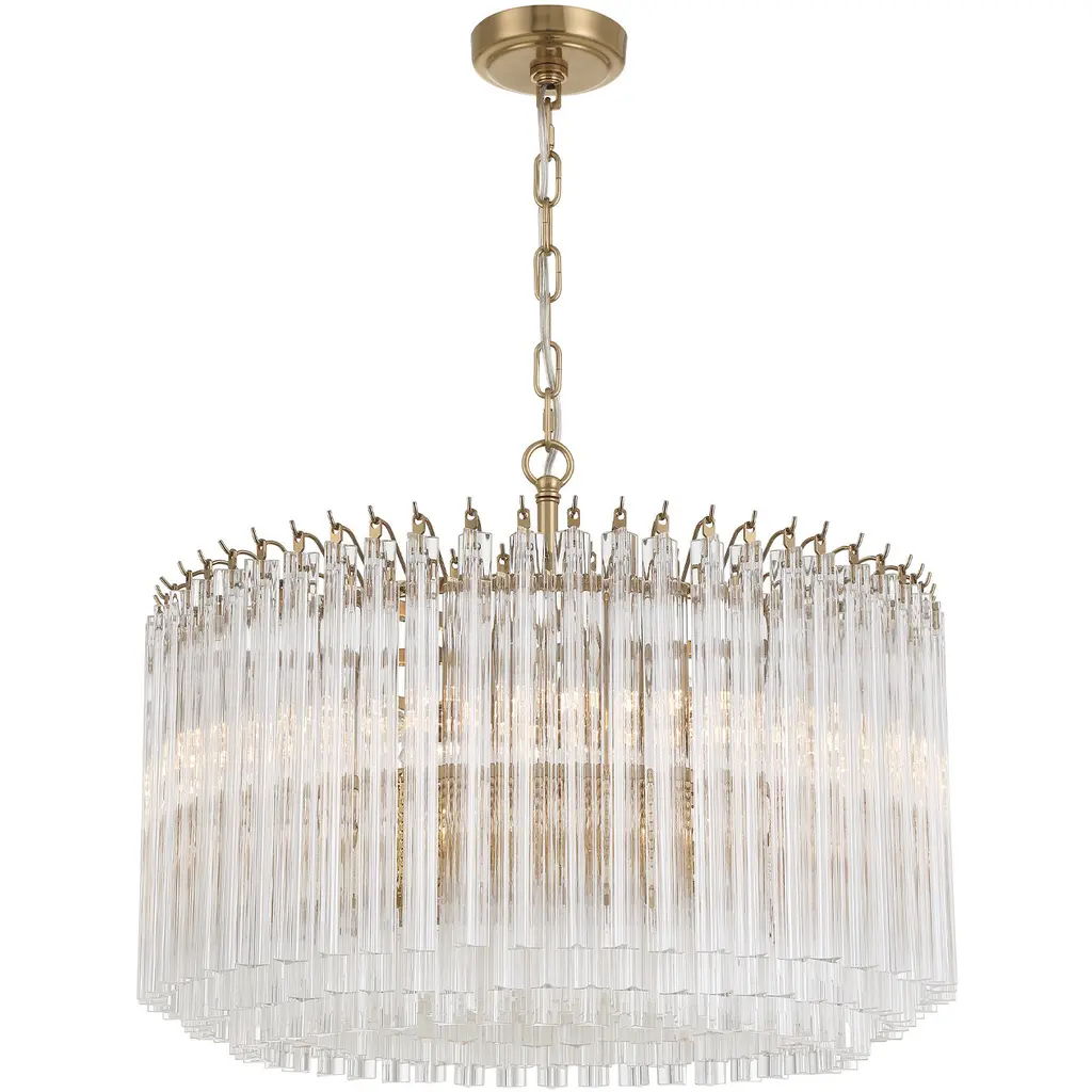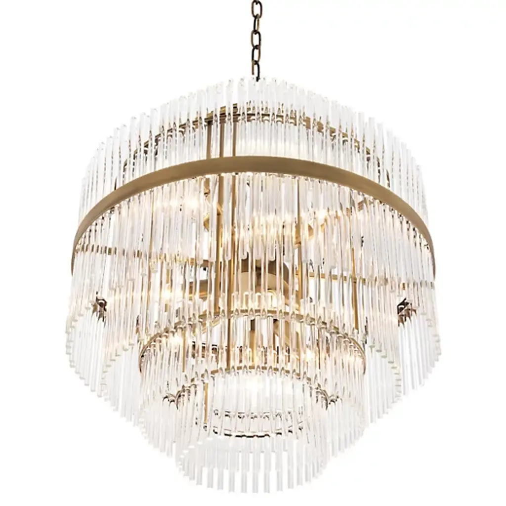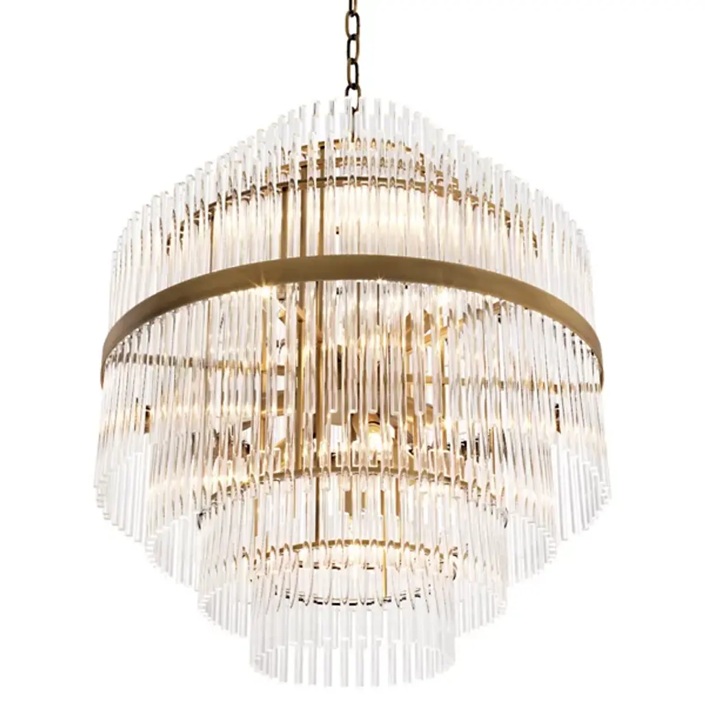 Give your interiors a glorious glam lift with the airy and elegant lines of the East Chandelier from Eichholtz. A tasteful reproduction of Art Deco style descending from a central chain link to a rounded hub surrounded by several tiers of rings, it extends an evenly-spaced arrangement of sockets out within each ring. The lamping is then surrounded by clear glass rods extending through each small ring that take on a sparkling gleam from the reflected light, creating an enduring and elegant character suited to high-ceilinged spaces.