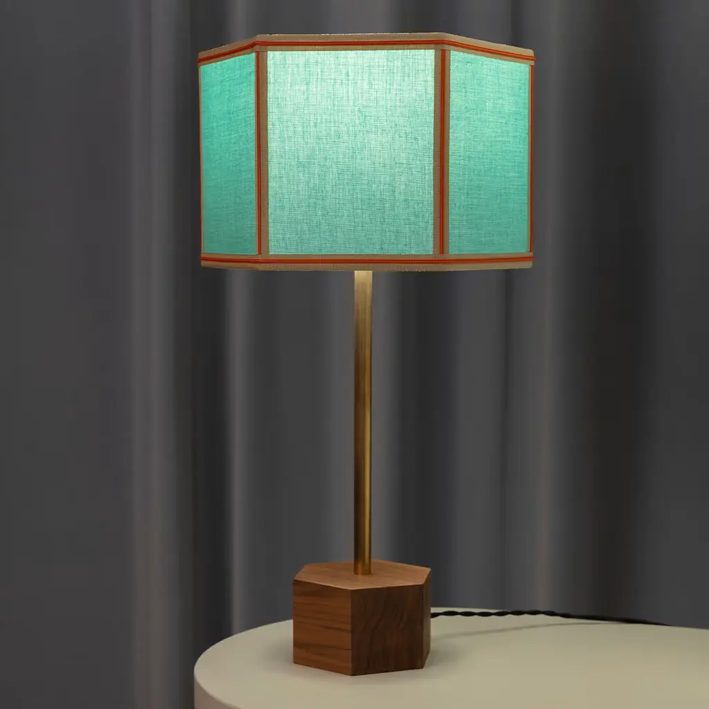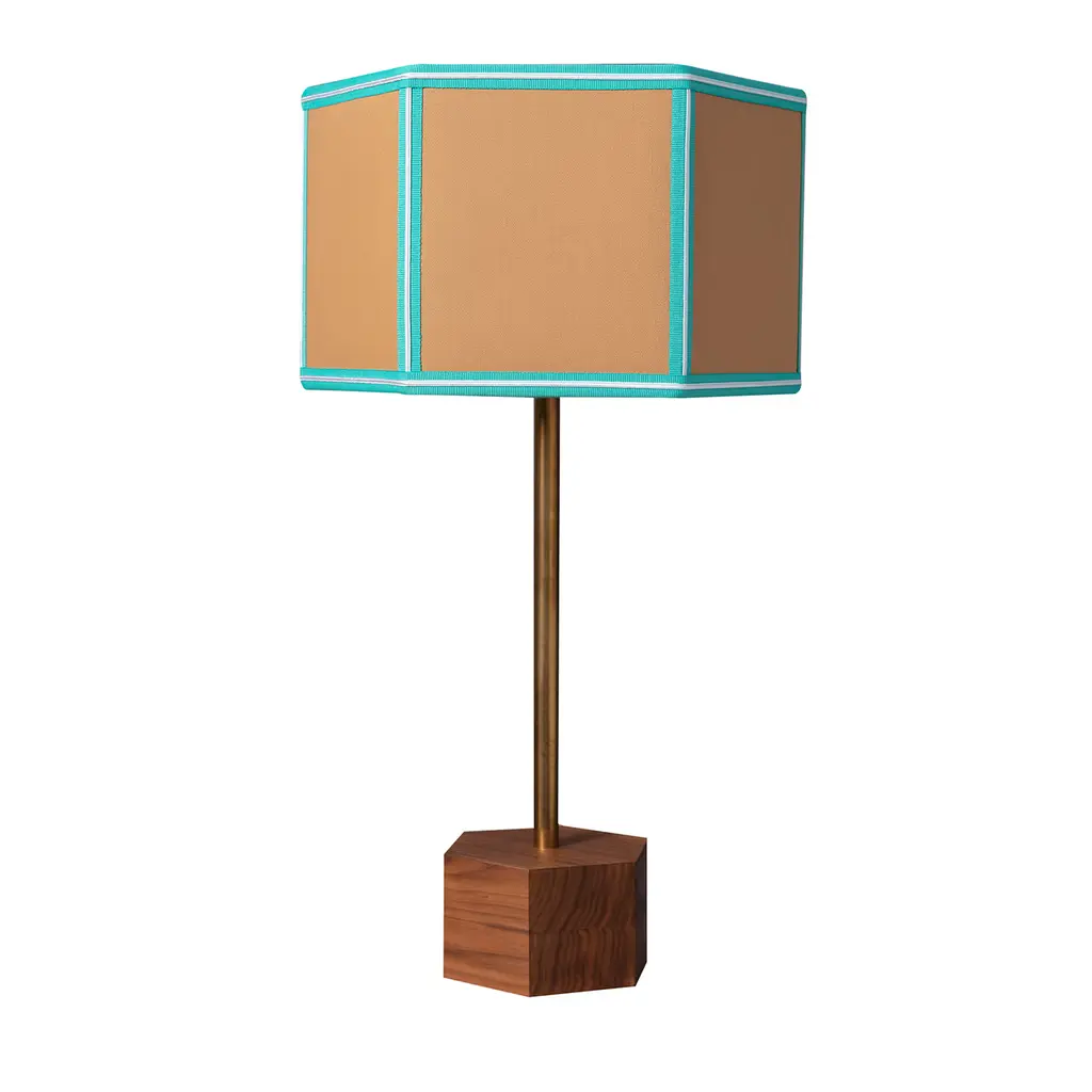 The Easy Floor Lamp is all about simple classic geometry, masterfully revisited through various color combinations. The lampshade cotton fabric is presented in block colors with contrasted trimmings and fringing around the bottom rim. The hexagonal base is made from Canaletto walnut wood and the stem from antique brass with a particular central white varnishing which adds weightlessness to the lamp. Suitable also for LED bulbs. Ask the Concierge for customization. This item is sold with an adapter.