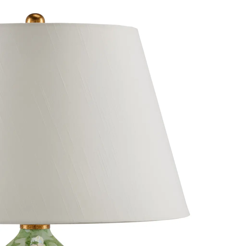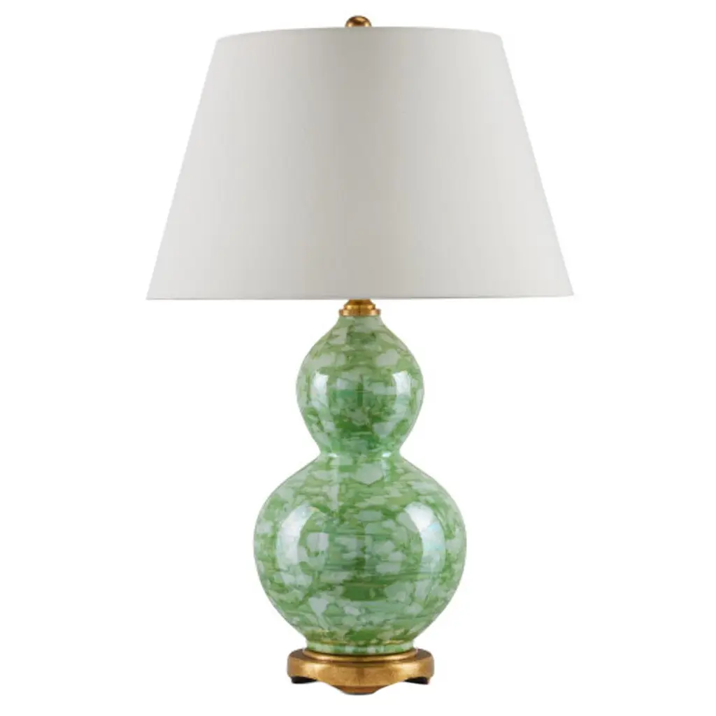 The Eau de Nil Table Lamp features a design as graceful as its name. Crafted from porcelain, the patterned double-gourd shaped body appears to float with clouds. The textured antique gold leaf on the metal and wood base adds warmth to the overall design. An empire shade is secured by a matching gold finial.