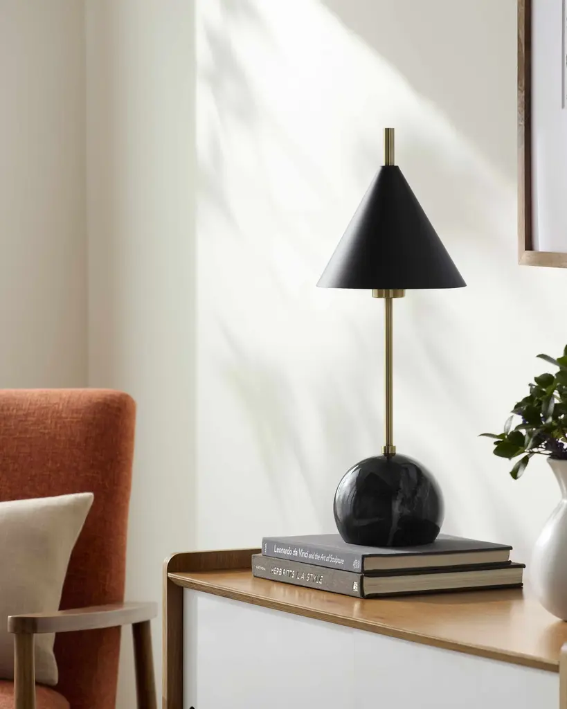 Collection: Echallens Colors: Black, White, Metallic Gold, Translucent Material: Body: Iron / Base: Iron / Shade (Outside): Metal / Shade (Inside): Plastic / Finial: Iron Styles: Southwestern Made In: China Lighting Type: Accent Table Lighting Base: Iron Shade Material: Metal, Plastic Shade Color: White, Black Cord Length: 6' Switch Type: On/Off Number of Bulbs: 1 Socket Type: E-26 Bulb Wattage: 60W