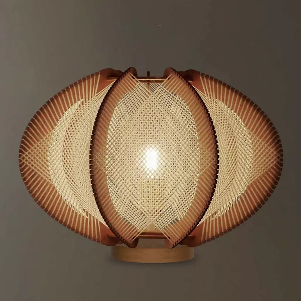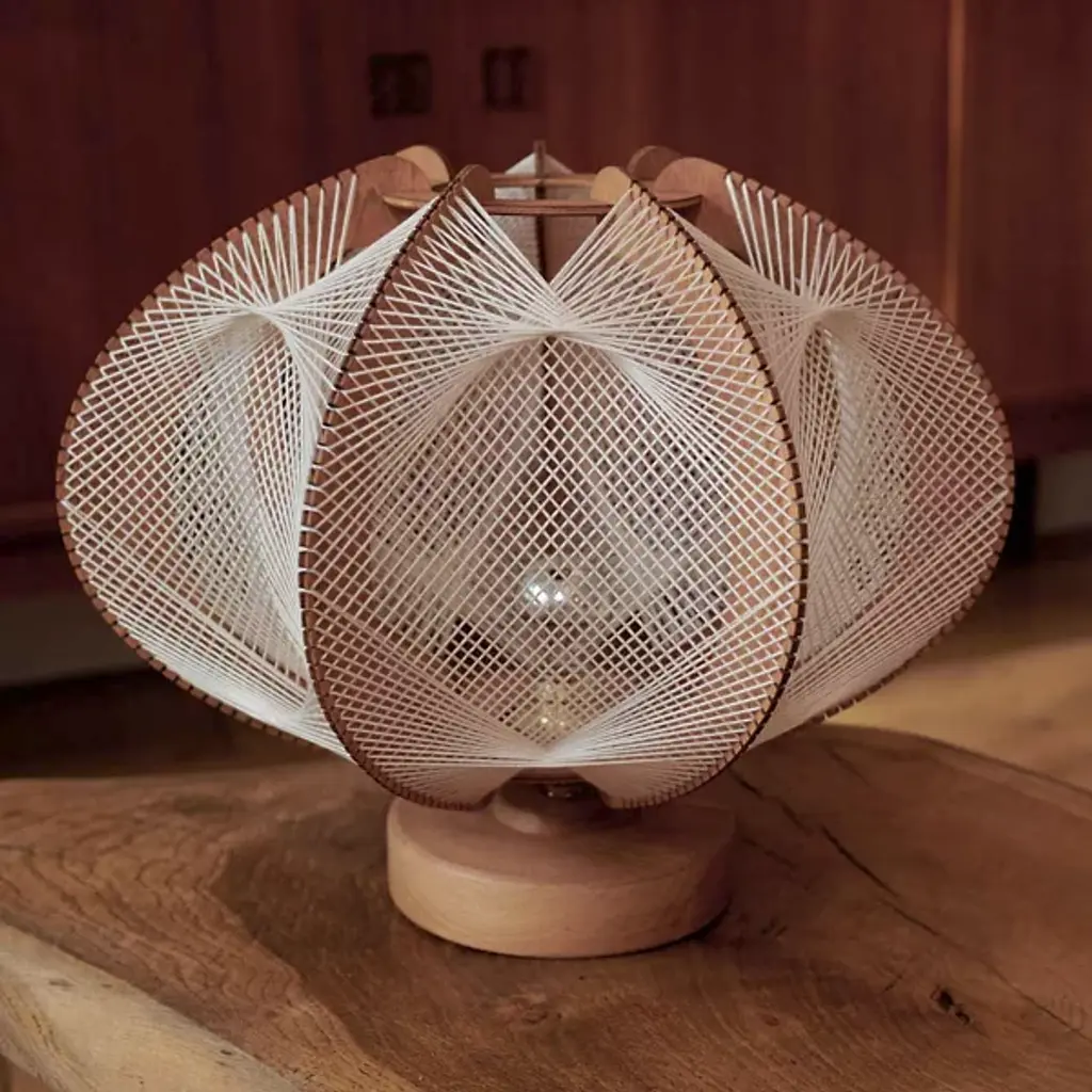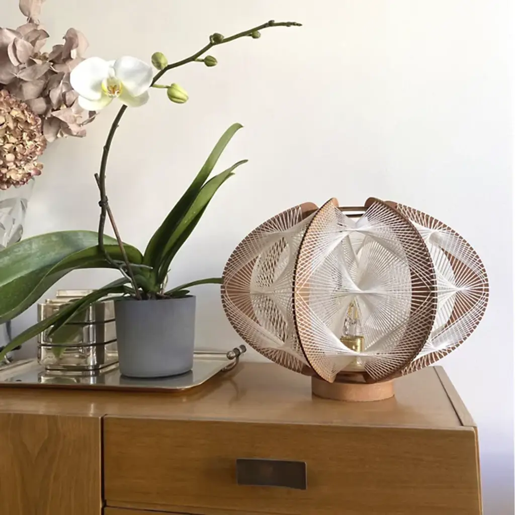 The Echino Base Table Lamp from LaFabLight adds an unforgettable artisanal character to indoor tables by using gossamer Ecru Cotton threads to wrap around vertically held, slender wooden ribs. Each fixture is made to order in France, starting with a wooden base that anchors the ribs around central lamping. An open weave of cotton thread stretches over the arcing wood, casting an even ambiance when lit, and creating a weblike array of shadows that accent the light, drawing the eye in while illuminating outward.