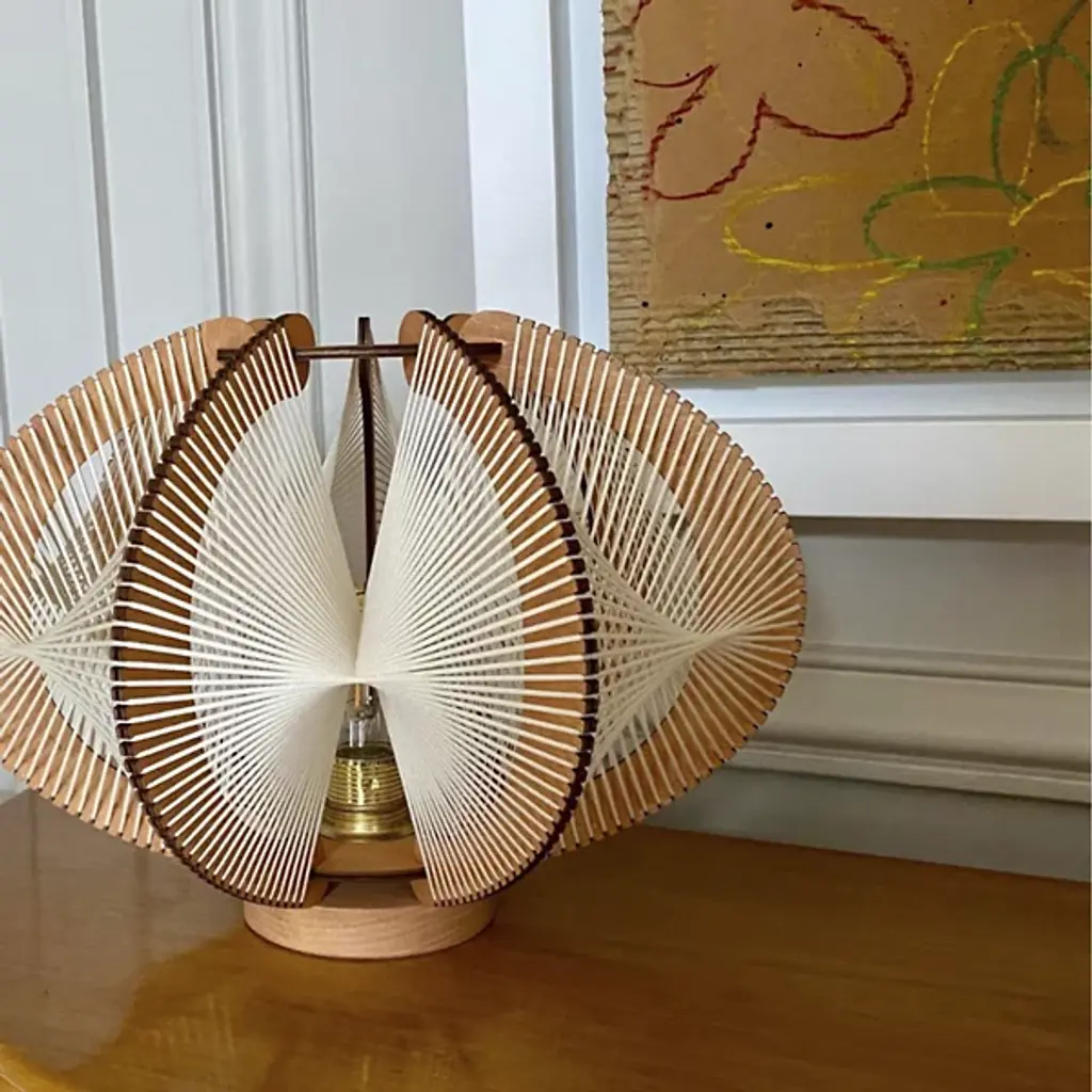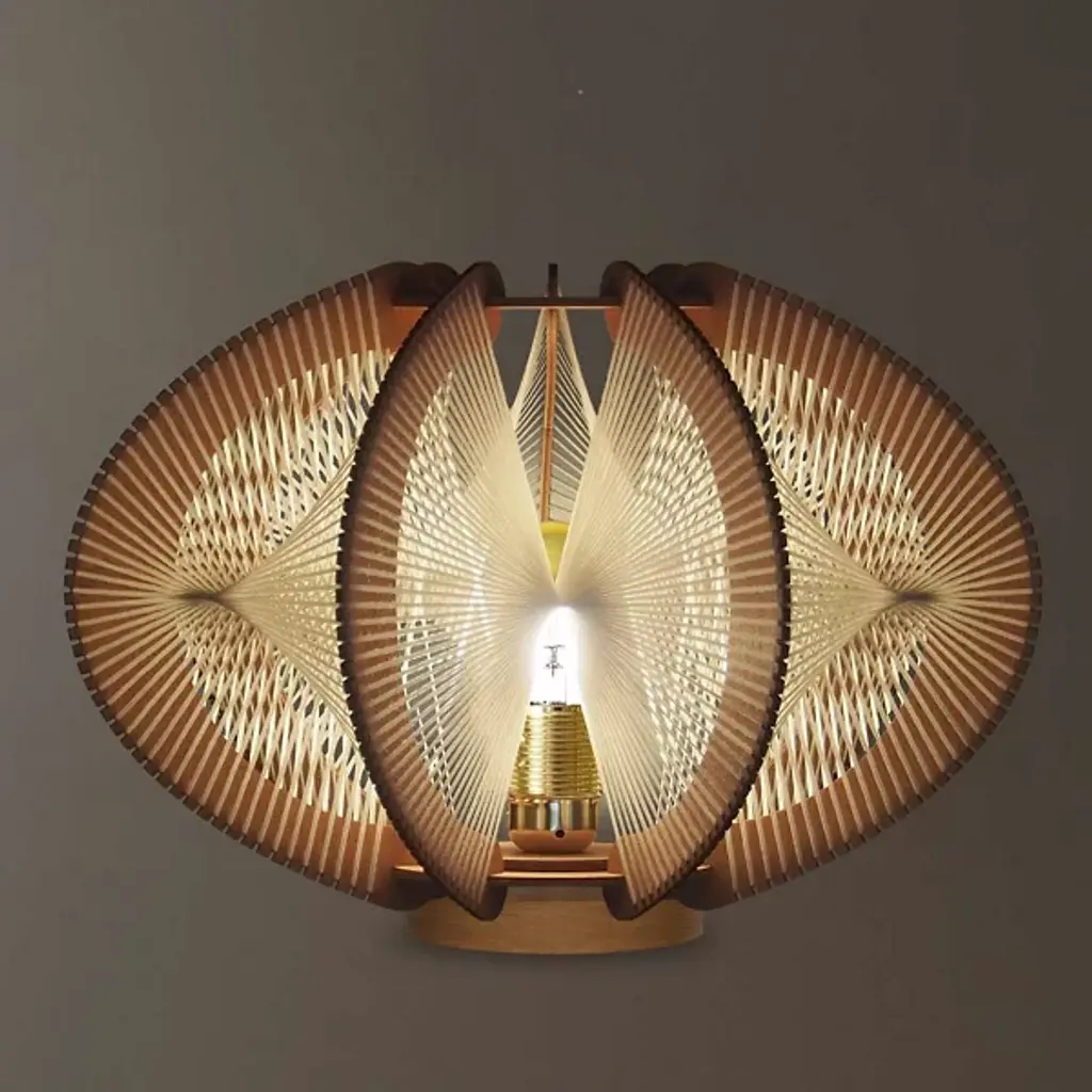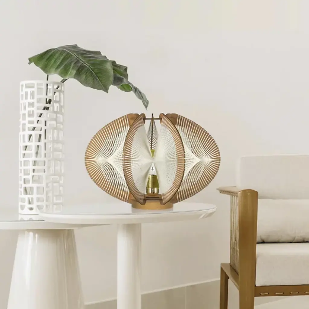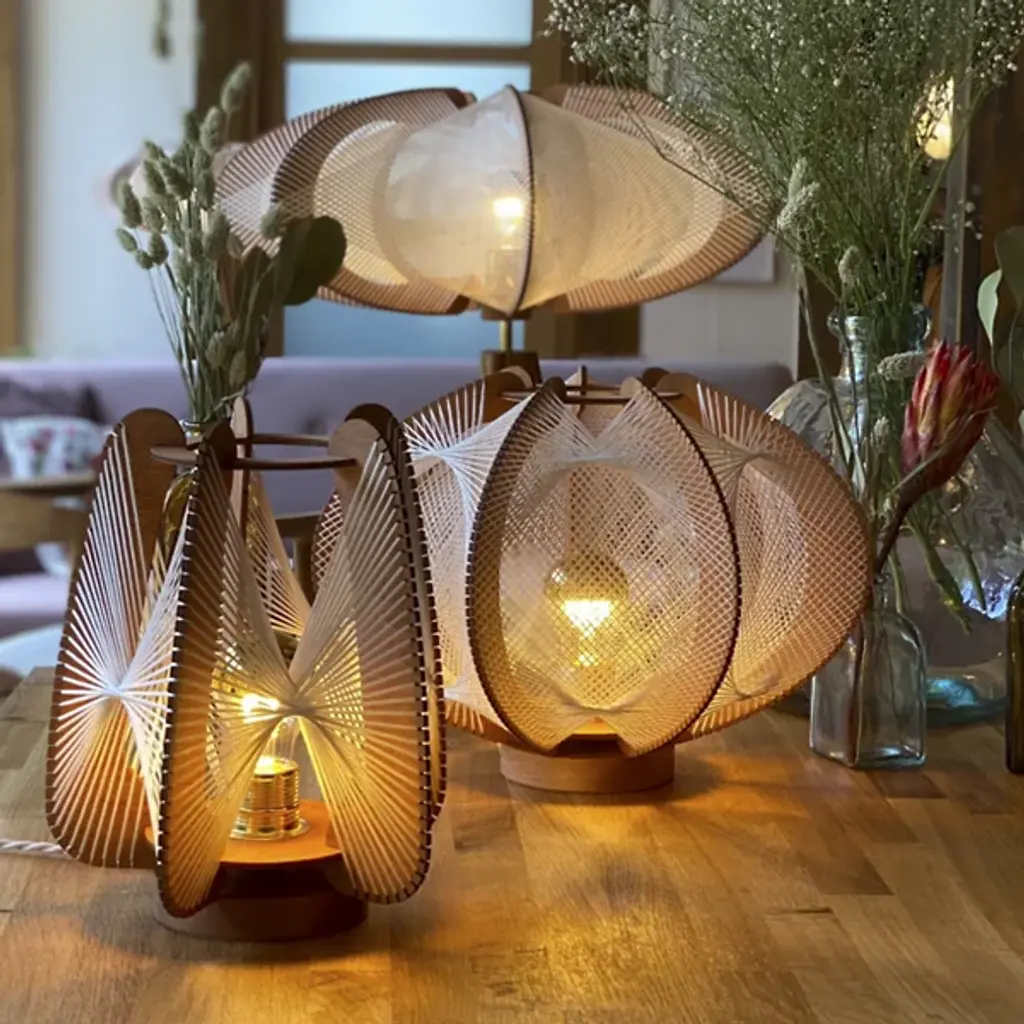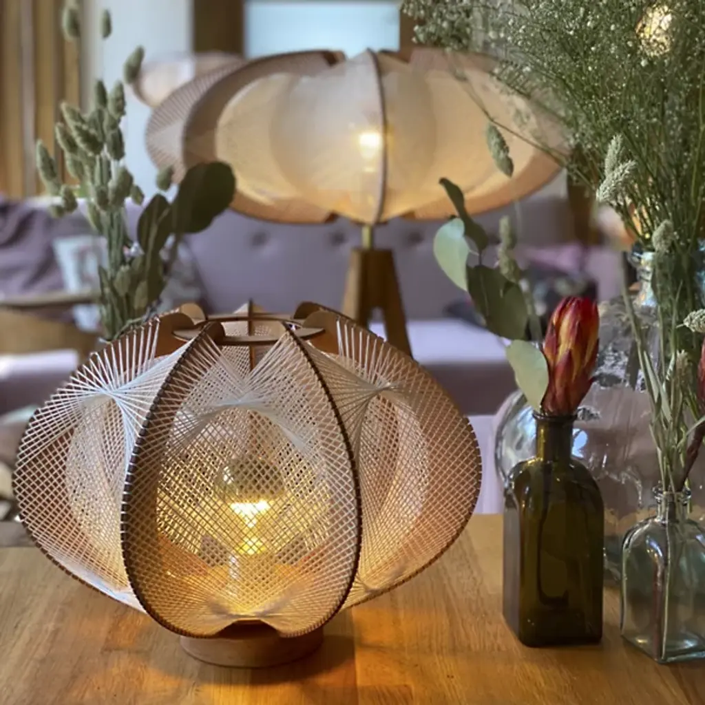 The Echino Base Table Lamp from LaFabLight adds an unforgettable artisanal character to indoor tables by using gossamer Ecru Cotton threads to wrap around vertically held, slender wooden ribs. Each fixture is made to order in France, starting with a wooden base that anchors the ribs around central lamping. An open weave of cotton thread stretches over the arcing wood, casting an even ambiance when lit, and creating a weblike array of shadows that accent the light, drawing the eye in while illuminating outward.