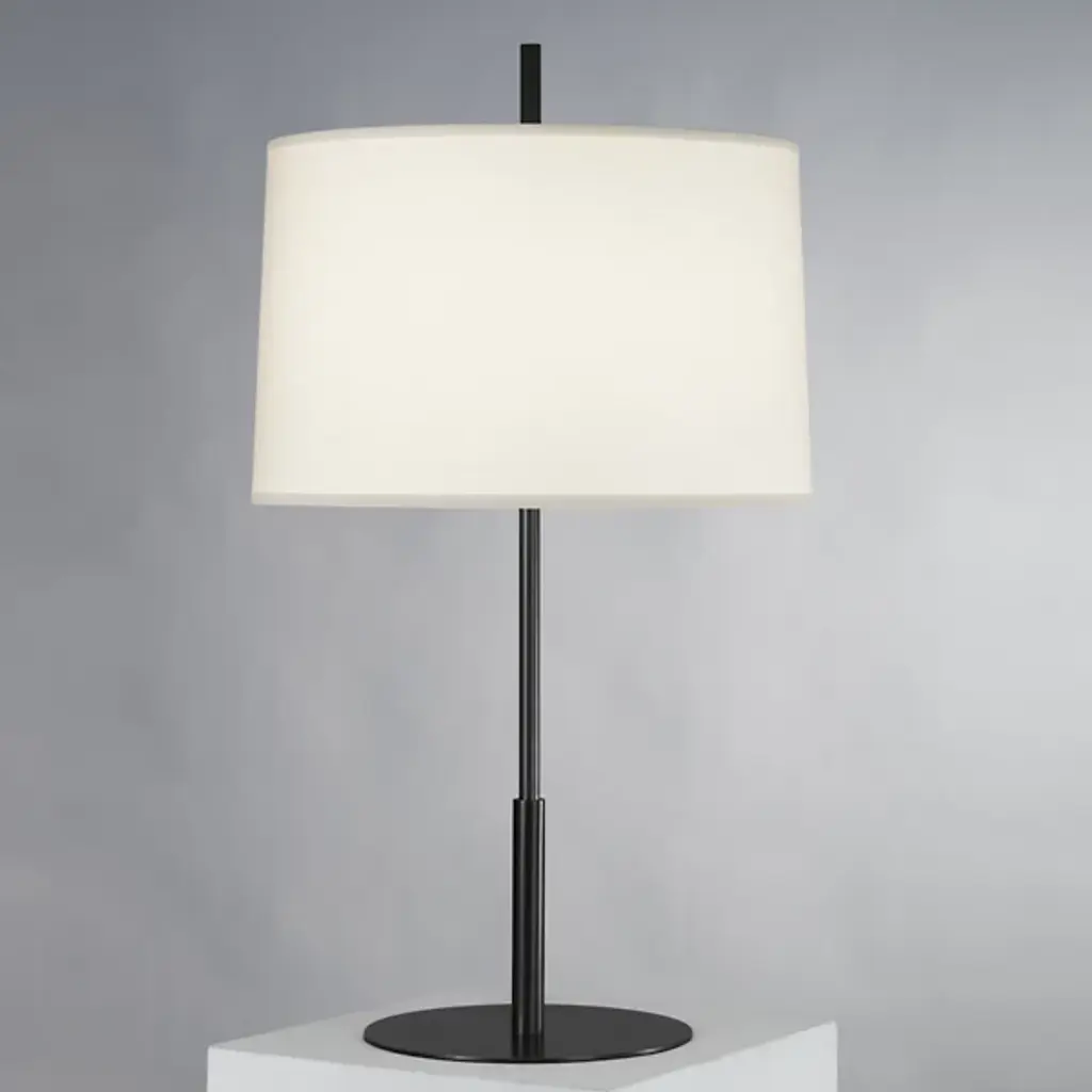 The Robert Abbey Echo Z2170 Table Lamp features a drum-shaped Fondine fabric shade, the pale off-white tone of which is offset beautifully by the Deep Patina Bronze finish on the base. Together, the clean lines of both components create an overall sophisticated look that will complement any transitional space. Available separately in a Stainless Steel finish (the Echo Table Lamp).