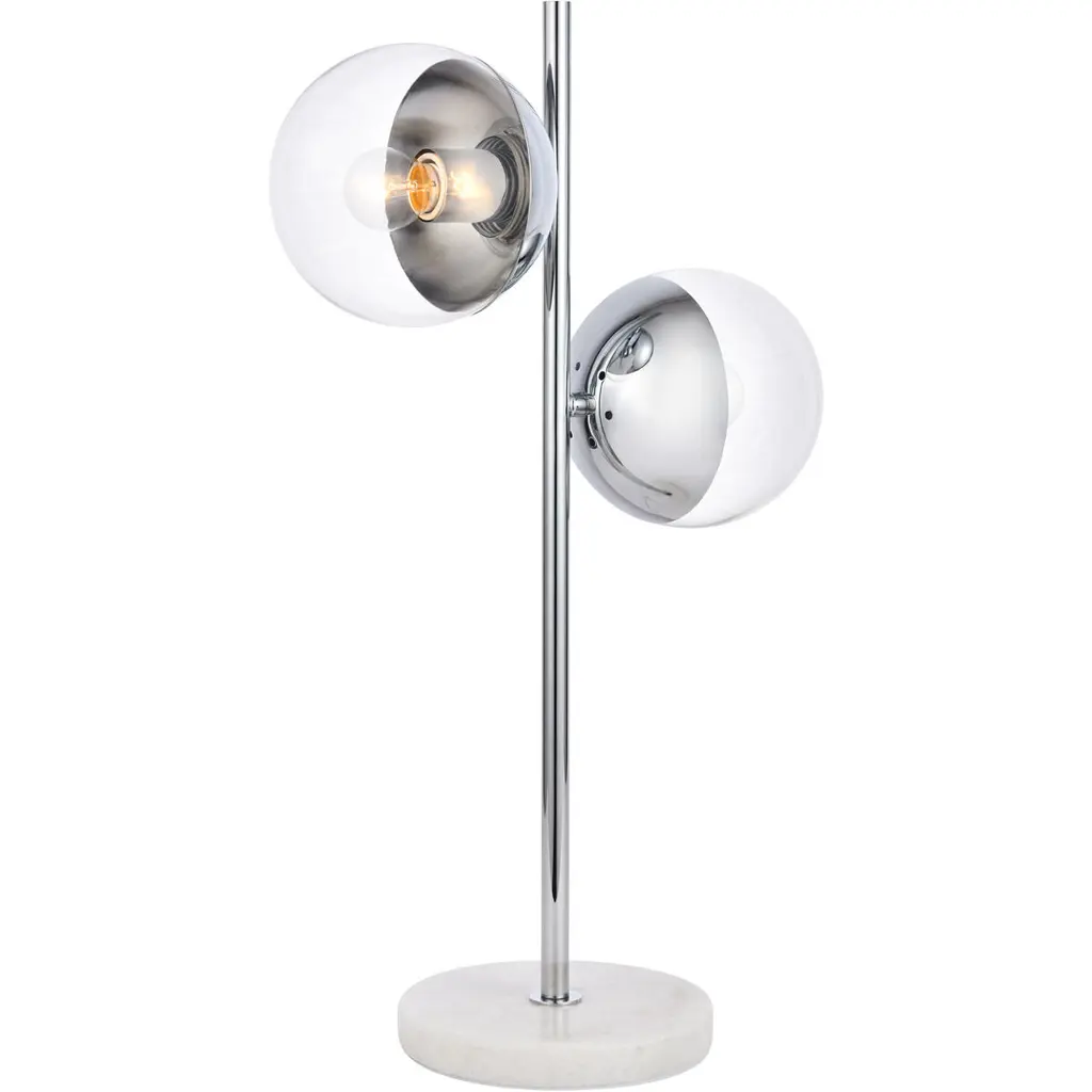 Refined style with a practical design, Eclipse Table Lamp bring cosmopolitan sophistication anywhere, especially to an entryway, office, bathroom, bedroom, or kitchen. The smooth marble base anchors the table lamp and comes in a chrome finish. A touch of color on top of the clear spherical glass shade brings character to this classic style. Living in the big city has never been this easy.