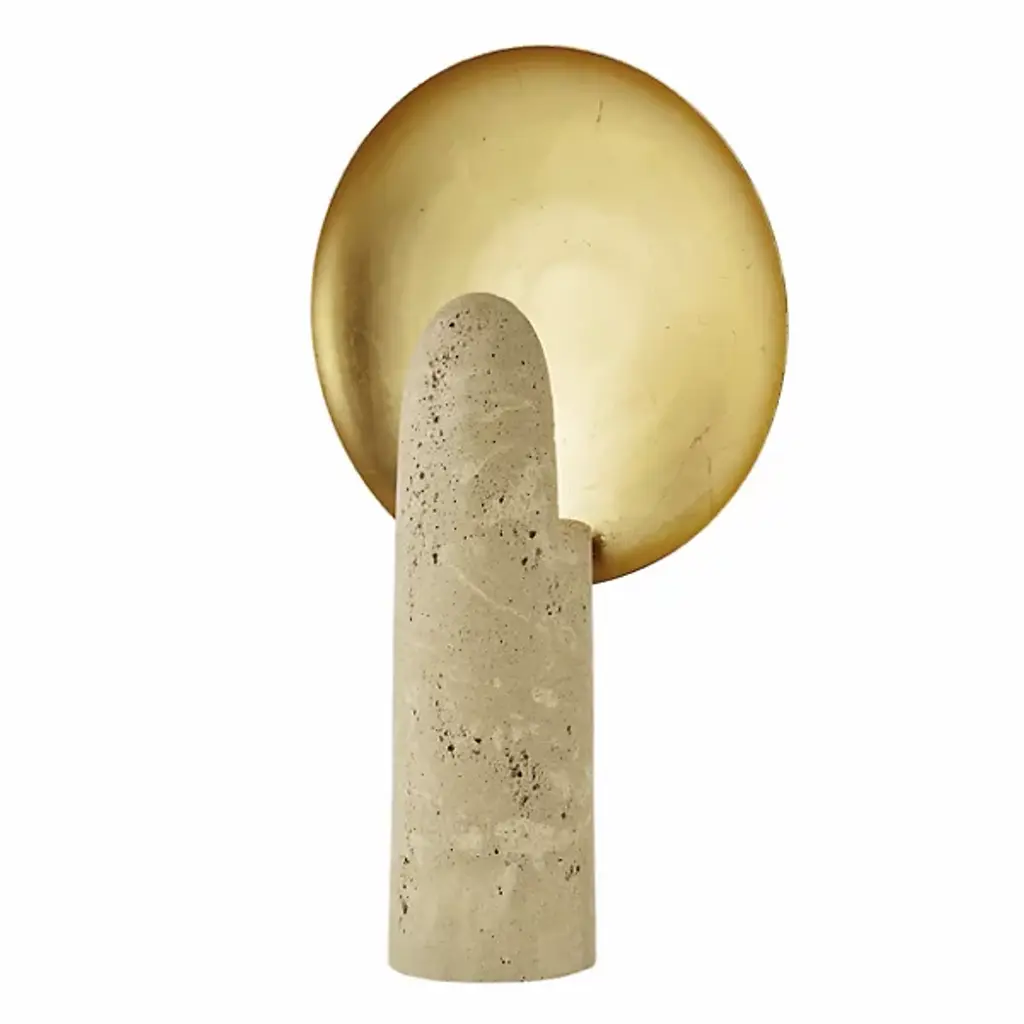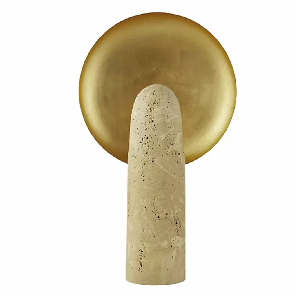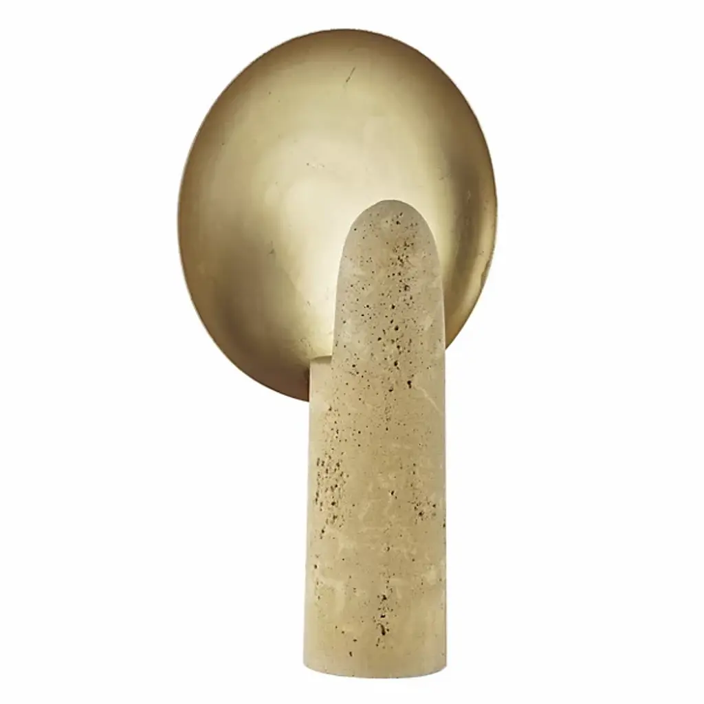 The Eclipse Table Lamp from Arteriors blends retro, nature-inspired style with mid-century modern appeal. The luminous shimmer of antique brass creates a halo effect behind its rounded base of sand faux travertine. This intersection of pillar body and rounded shade is soothing and captivating, with natural bubbles, veining, and color variations in the stone, making each lamp unique. The distinct combination of materials and design elements ensures that this lamp becomes an artistic sculpture, adding rustic elegance and refined sophistication to any space.