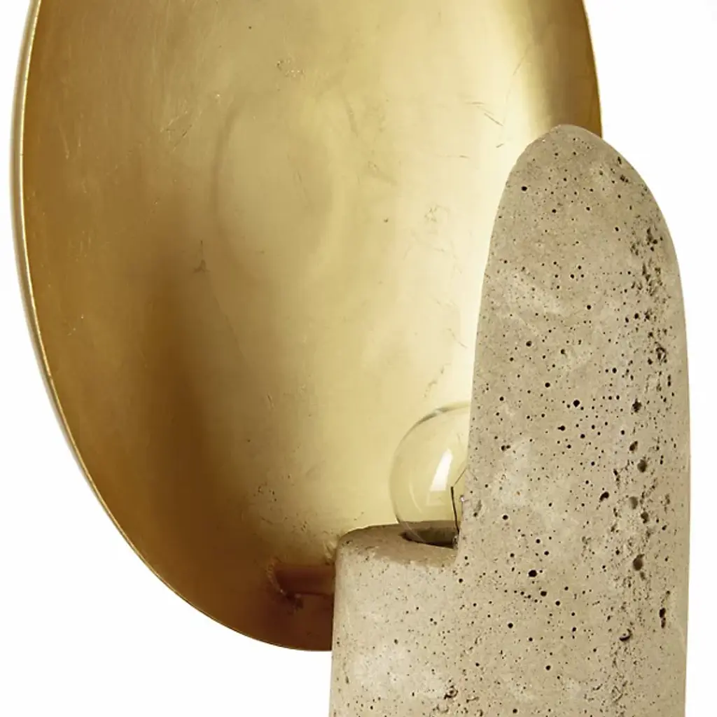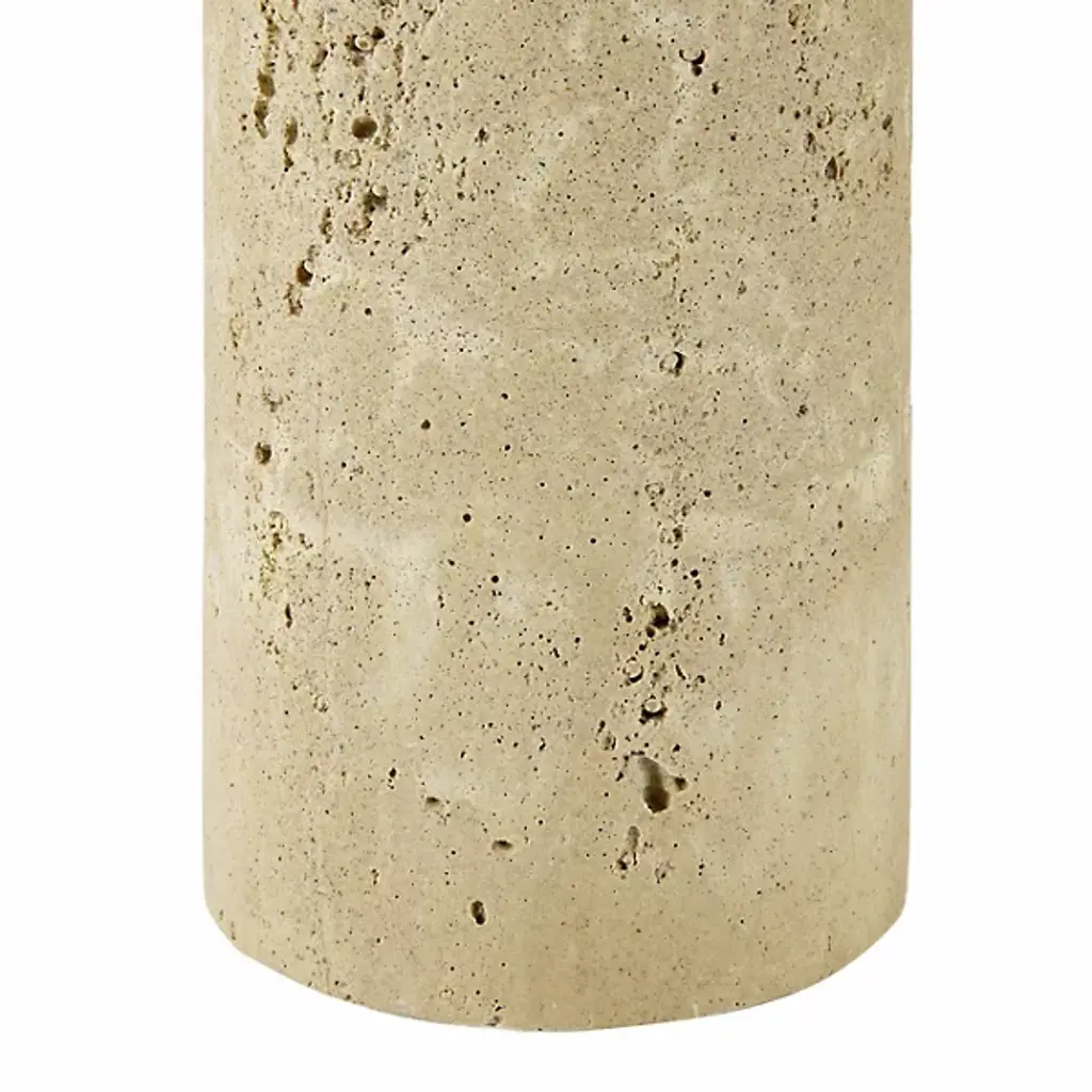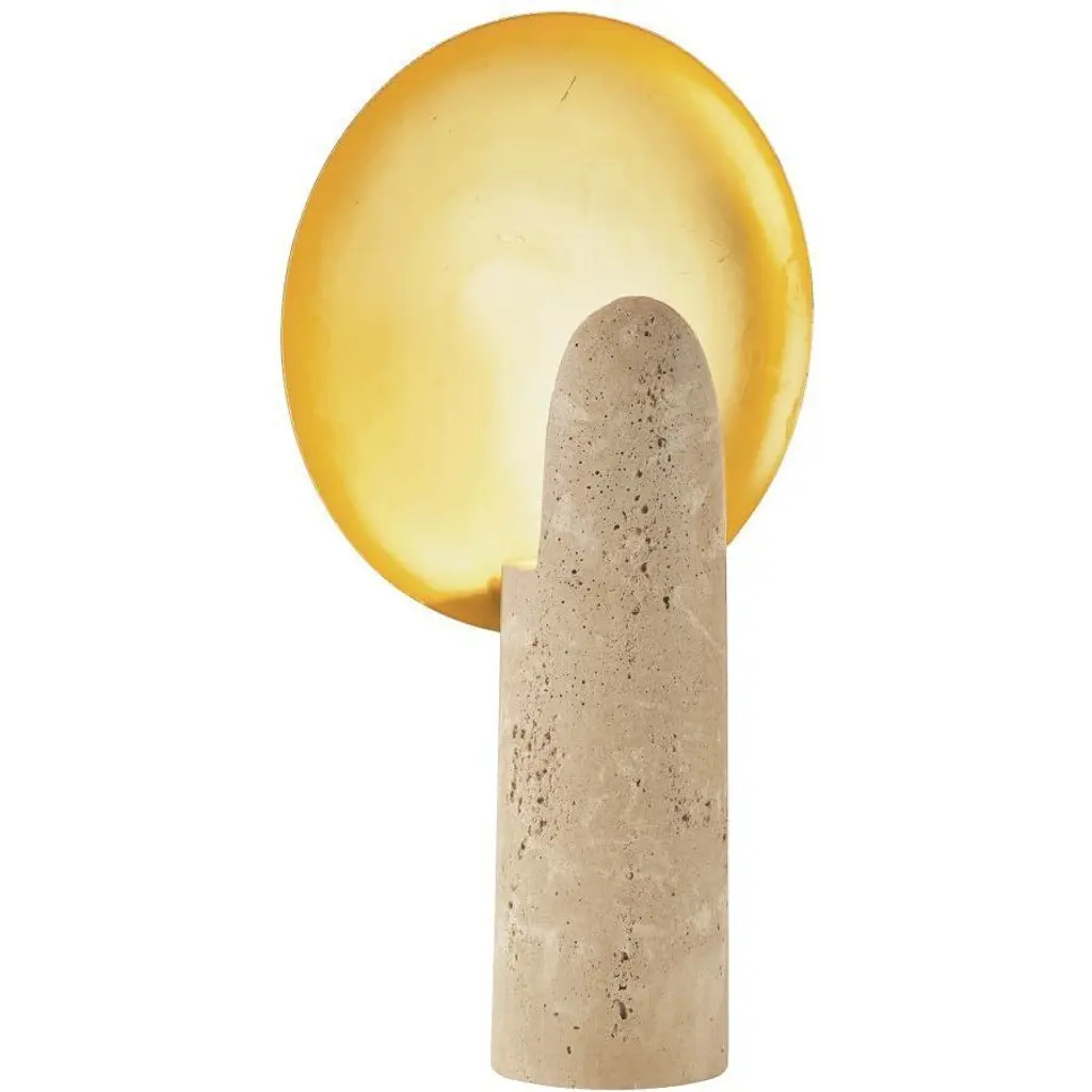 The Eclipse Table Lamp from Arteriors blends retro, nature-inspired style with mid-century modern appeal. The luminous shimmer of antique brass creates a halo effect behind its rounded base of sand faux travertine. This intersection of pillar body and rounded shade is soothing and captivating, with natural bubbles, veining, and color variations in the stone, making each lamp unique. The distinct combination of materials and design elements ensures that this lamp becomes an artistic sculpture, adding rustic elegance and refined sophistication to any space.
