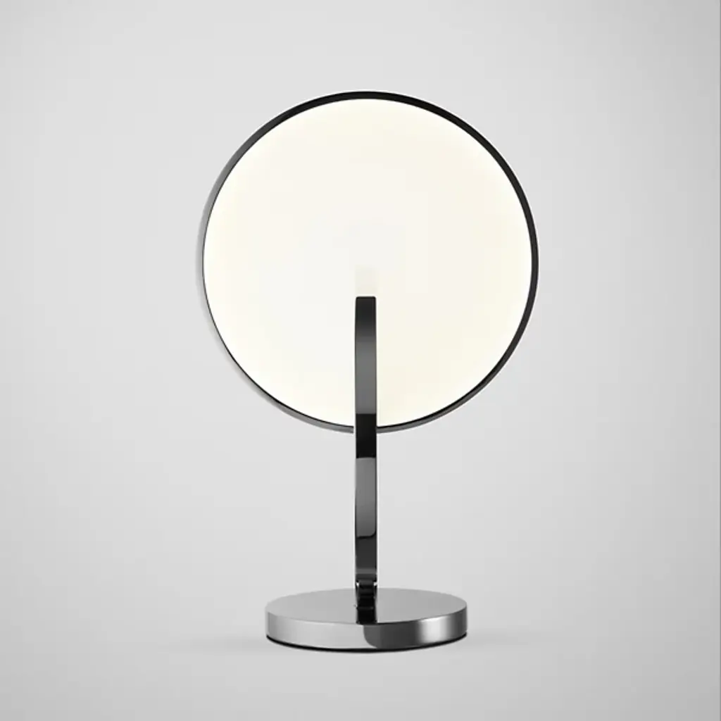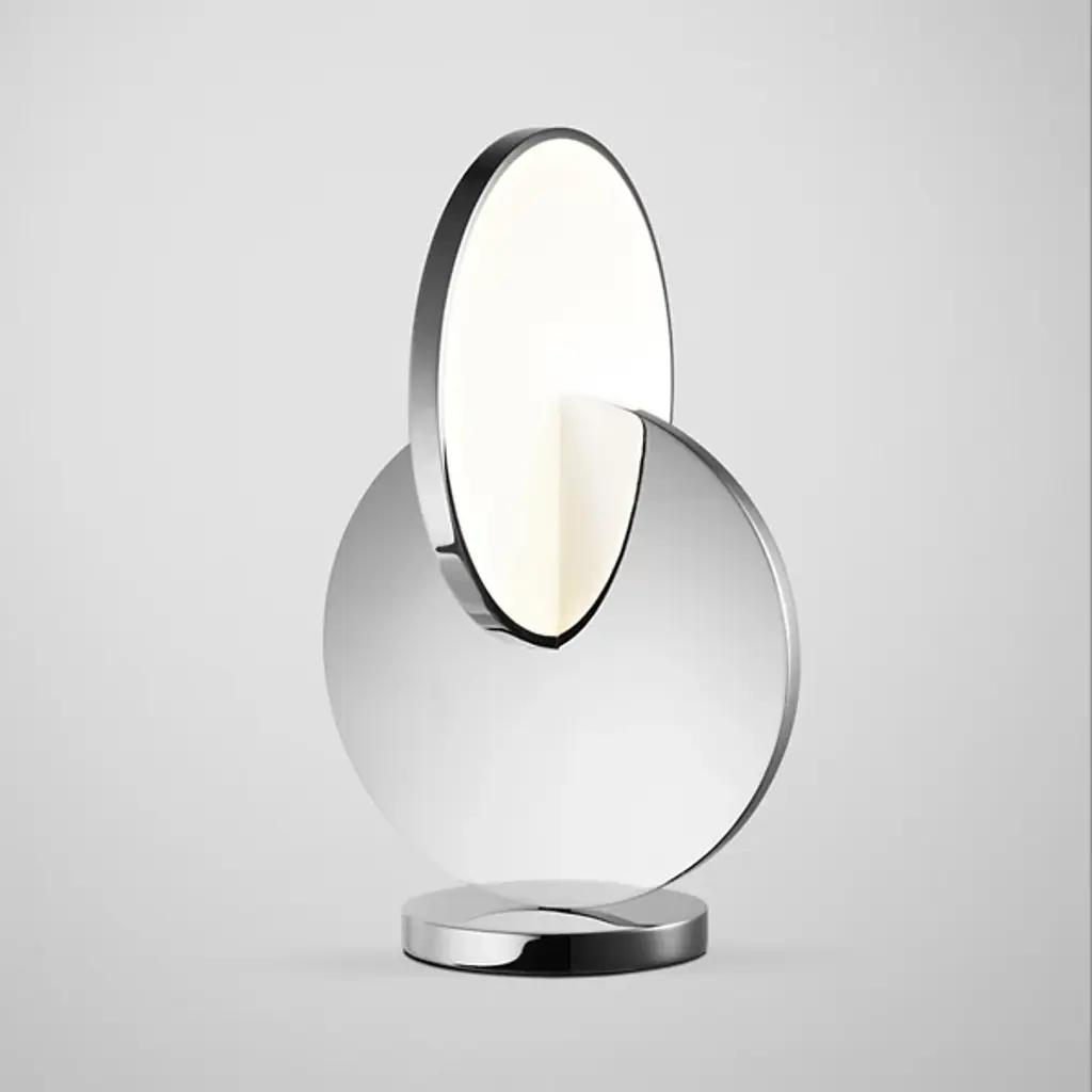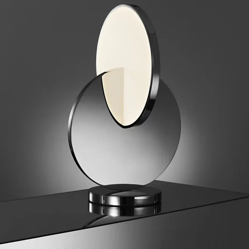 Give your living space a decorative, modern look with the Eclipse Table Lamp by Lee Broom. Its design features two stacked perpendicular discs made of Chrome and Acrylic that stand atop a polished mirror base. Once lit, integrated LEDs permeate through the Acrylic disc, creating a soft ambient glow that is both pleasant and useful. Together, the discs can rotate 90°, helping you position the light where it is most needed.