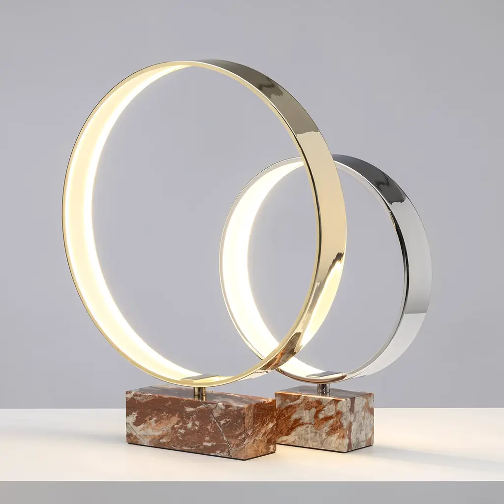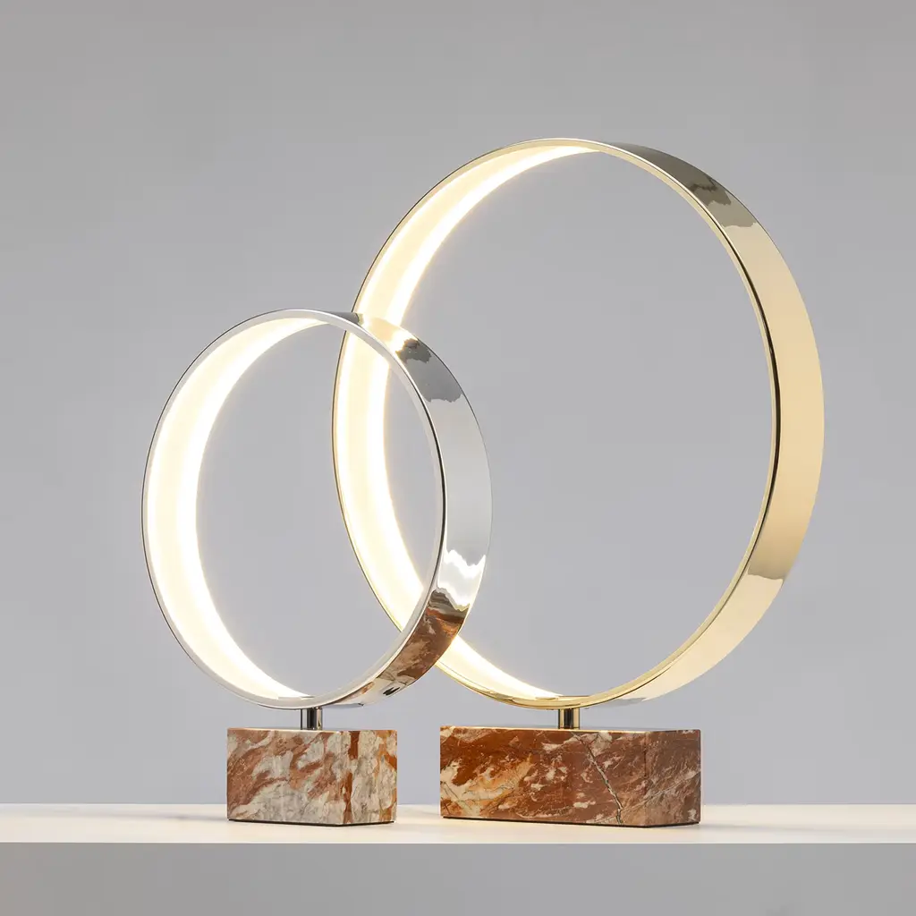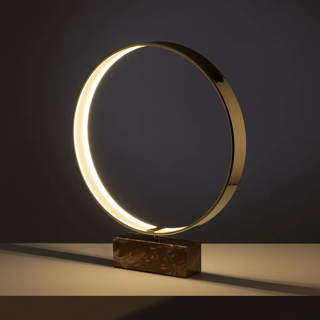 This table lamp's sculptural silhouette is an ode to pure geometry. It seduces with its precious materials and harmonious proportions. A red marble parallelepiped serves as the opulent base for the glistening polished brass ring (Ø 65 cm), which features an integrated LED strip (30 W—3000K) adhering to its inner side for a homogenous and refined light output. Please contact the Concierge for available customization options.