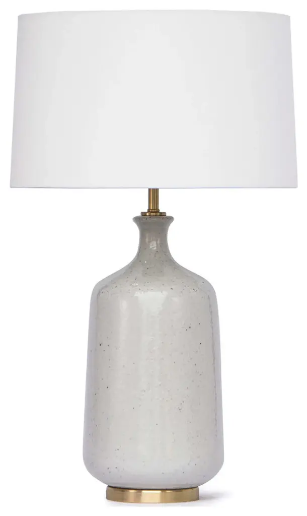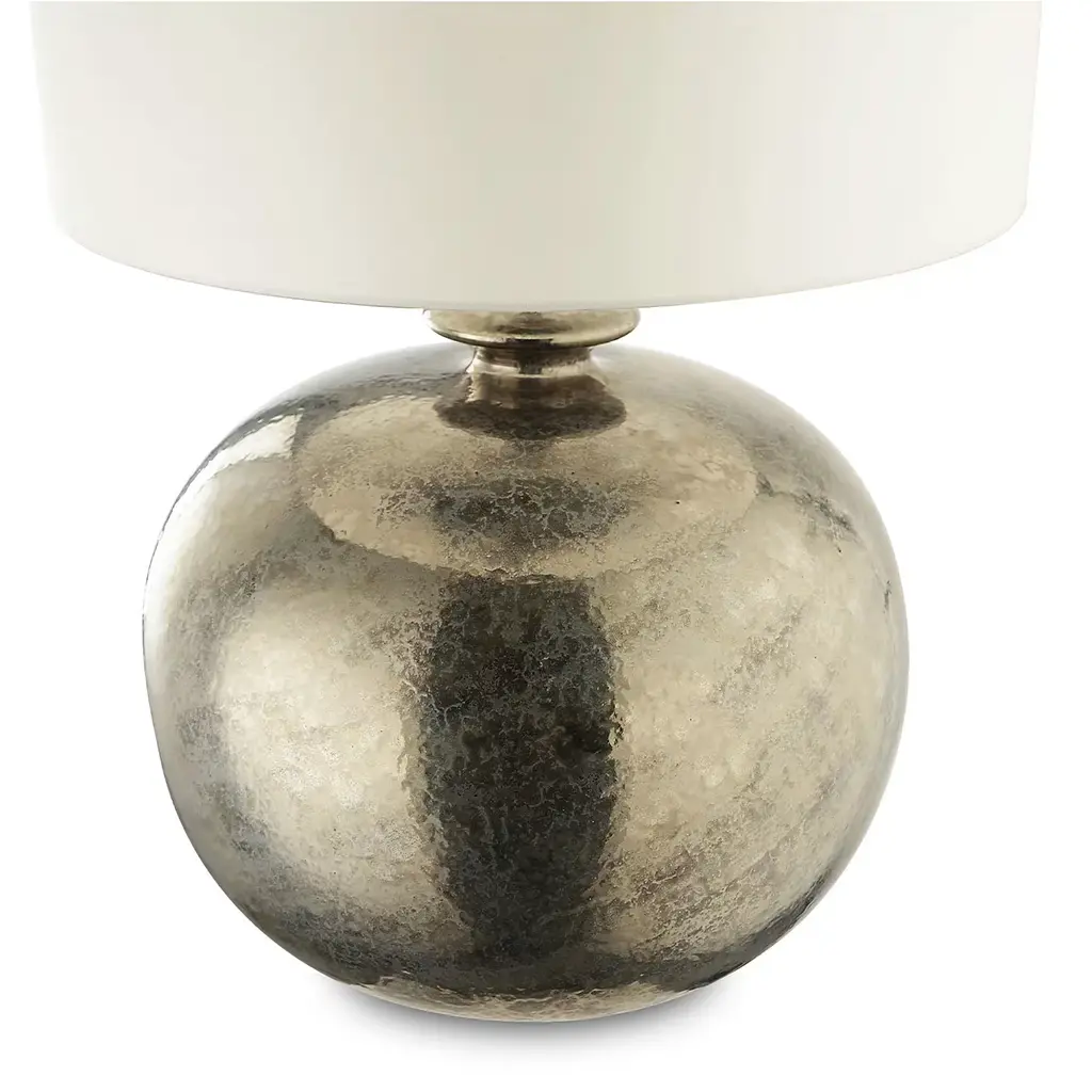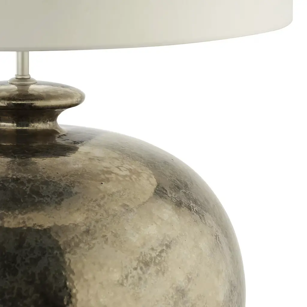 This lovely table lamp in glazed ceramic will be sure to add a touch of sophistication to any room it illuminates. The round body of the lamp is enamelled with a platinum finish that is brushed onto the glazed ceramic surface. The piece is completed with a tall white fabric lampshade in a cylindrical shape.