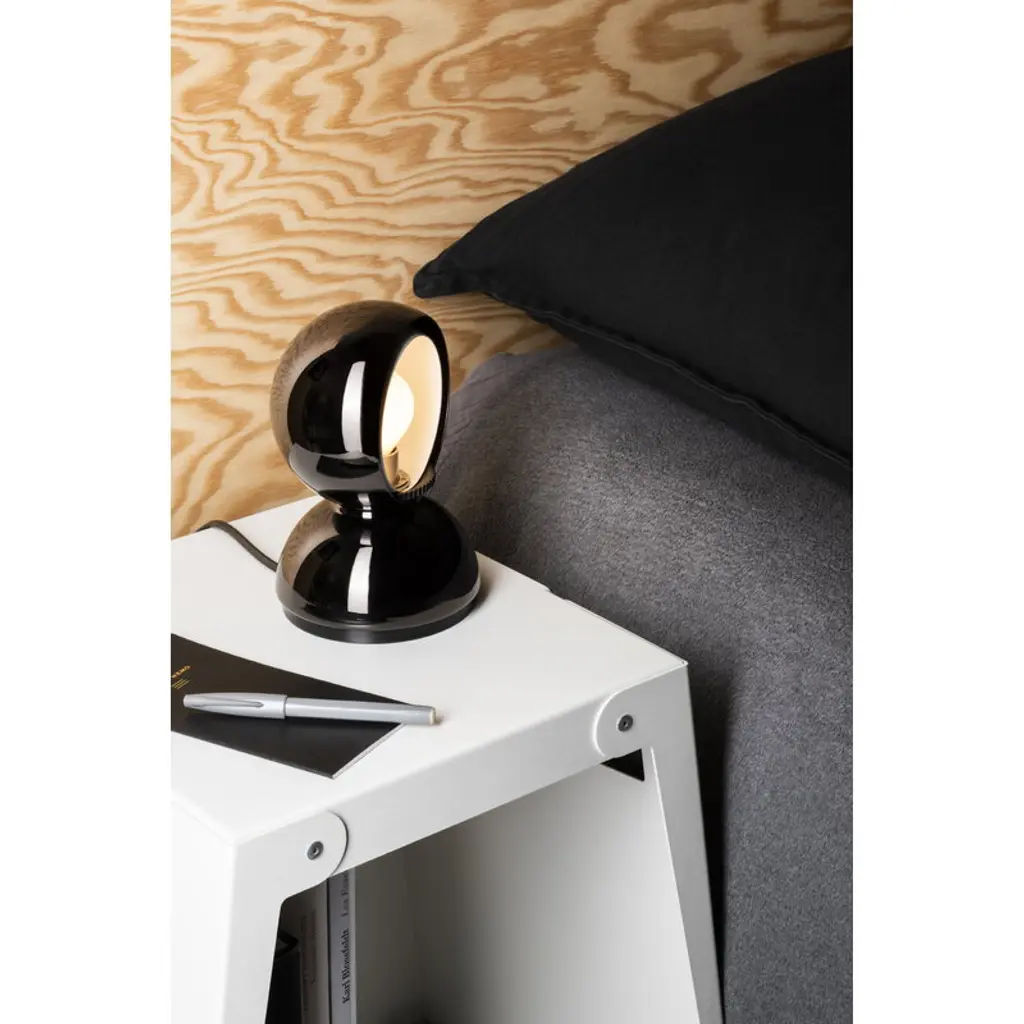 Designed by Vico Magistretti for the Italian lighting company Artemide in 1967, the Eclisse lamp is a delightful combination of round shapes, simple surfaces and 1960s spirit. The soul of the lamp is its mechanical dimmer: a curved, rotating shutter makes it possible to control the direction and intensity of the light. By closing the shutter completely, the lamp creates a beautiful corona – the name Eclisse is an Italian word for eclipse. Eclisse was awarded in 1967 a Compasso d'Oro design award and it influenced the futuristic design of the 1970s. Made of lacquered steel, Eclisse makes a characteristic table lamp for example in the bedroom or the office, and it can also be mounted on the wall.