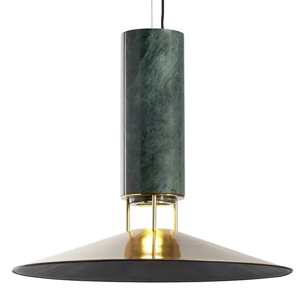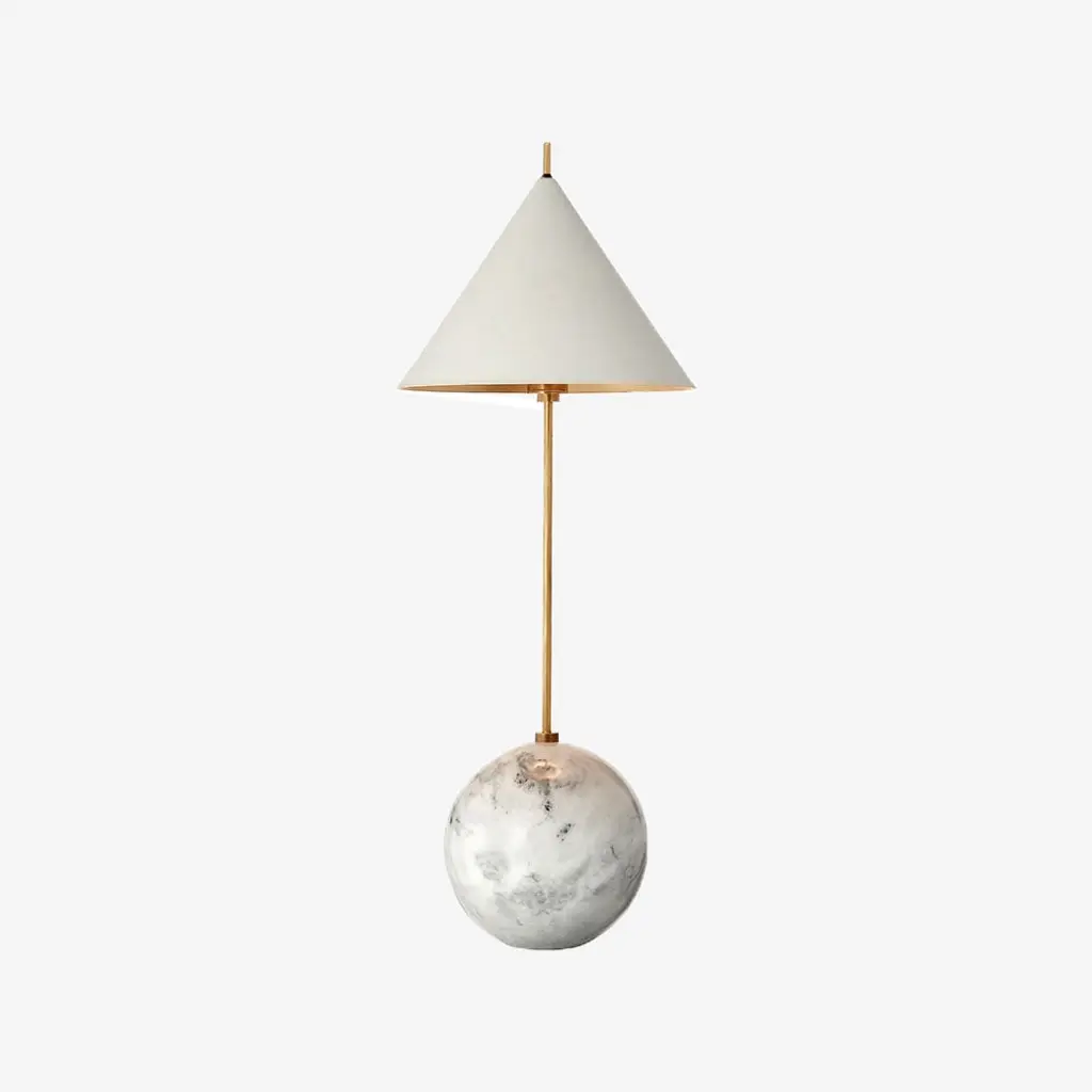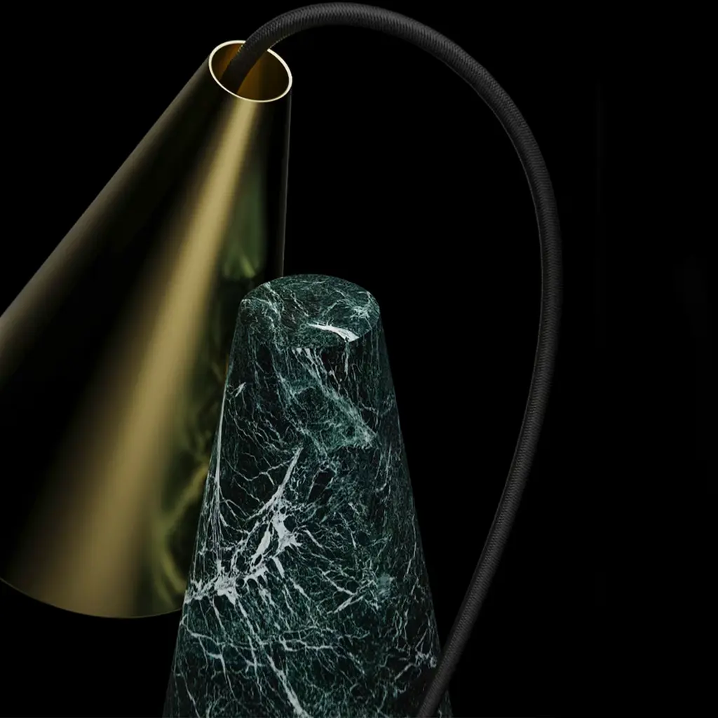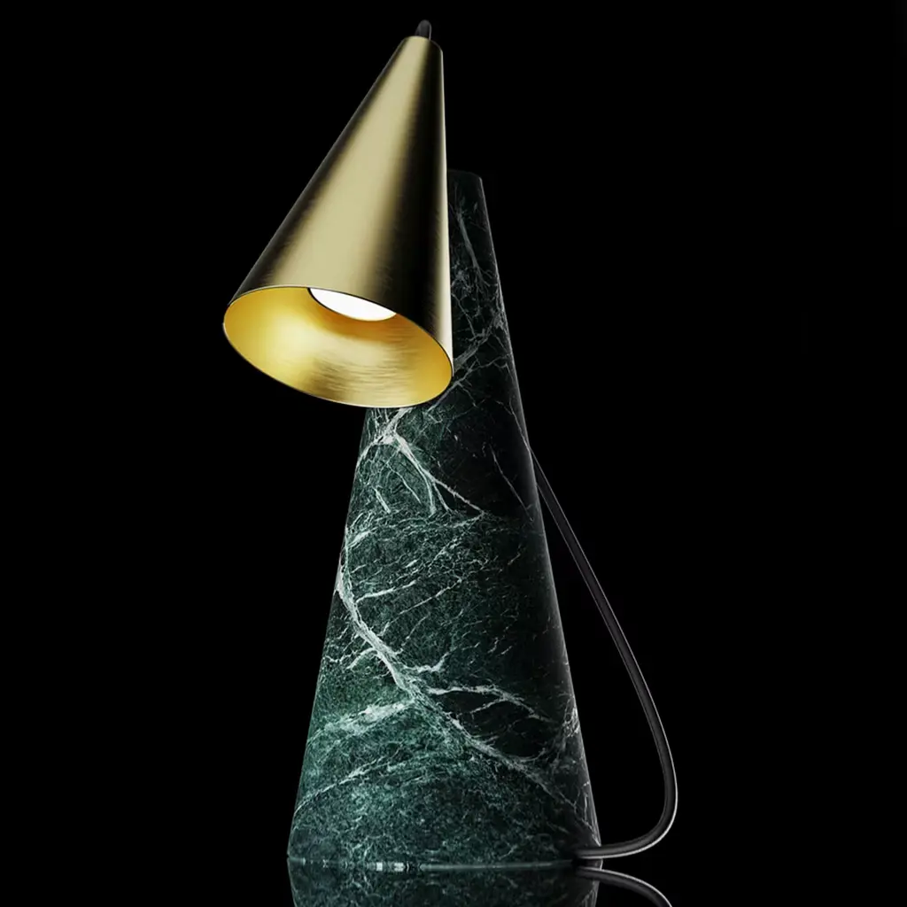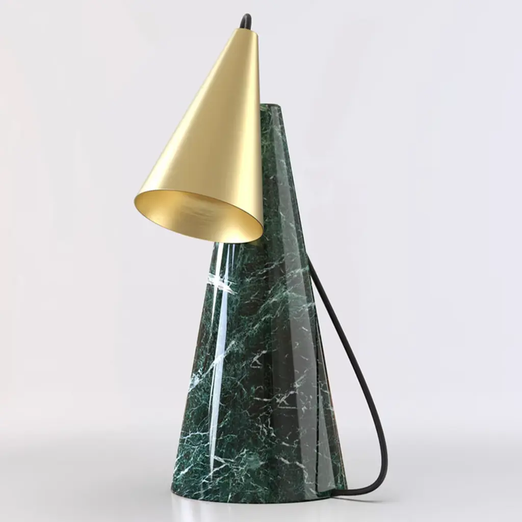 This one-of-a-kind, elegant table lamp features a solid marble cone carved from a single stone that supports a brass conic shade.