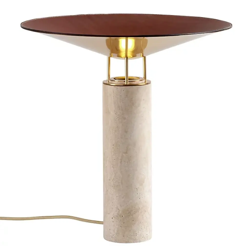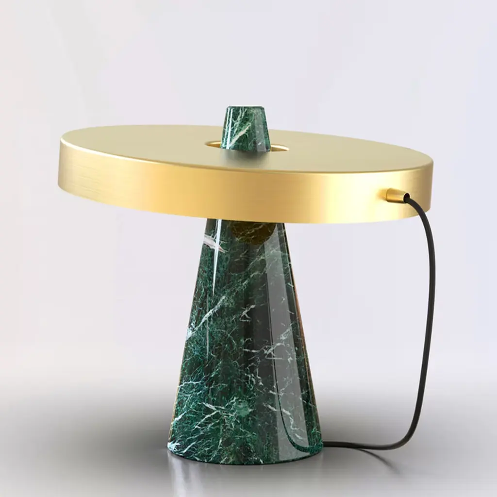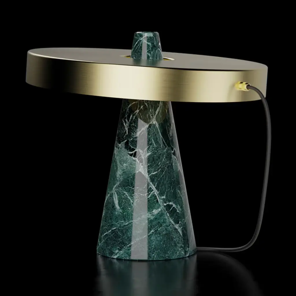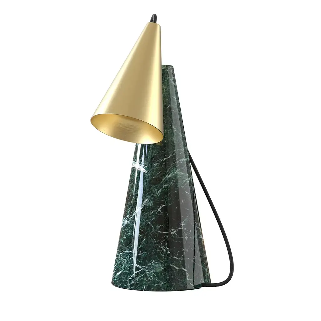 This one-of-a-kind table lamp features a solid marble cone carved from a single stone that supports a brass round shade for LED lightbulb, elegantly resting at the top of its marble base.