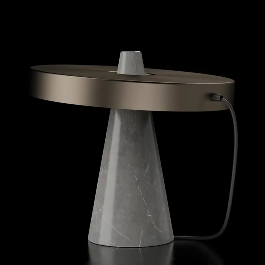 This one-of-a-kind table lamp features a solid white marble cone carved from a single stone that supports a copper round shade for LED lightbulb, elegantly resting at the top of its marble base.