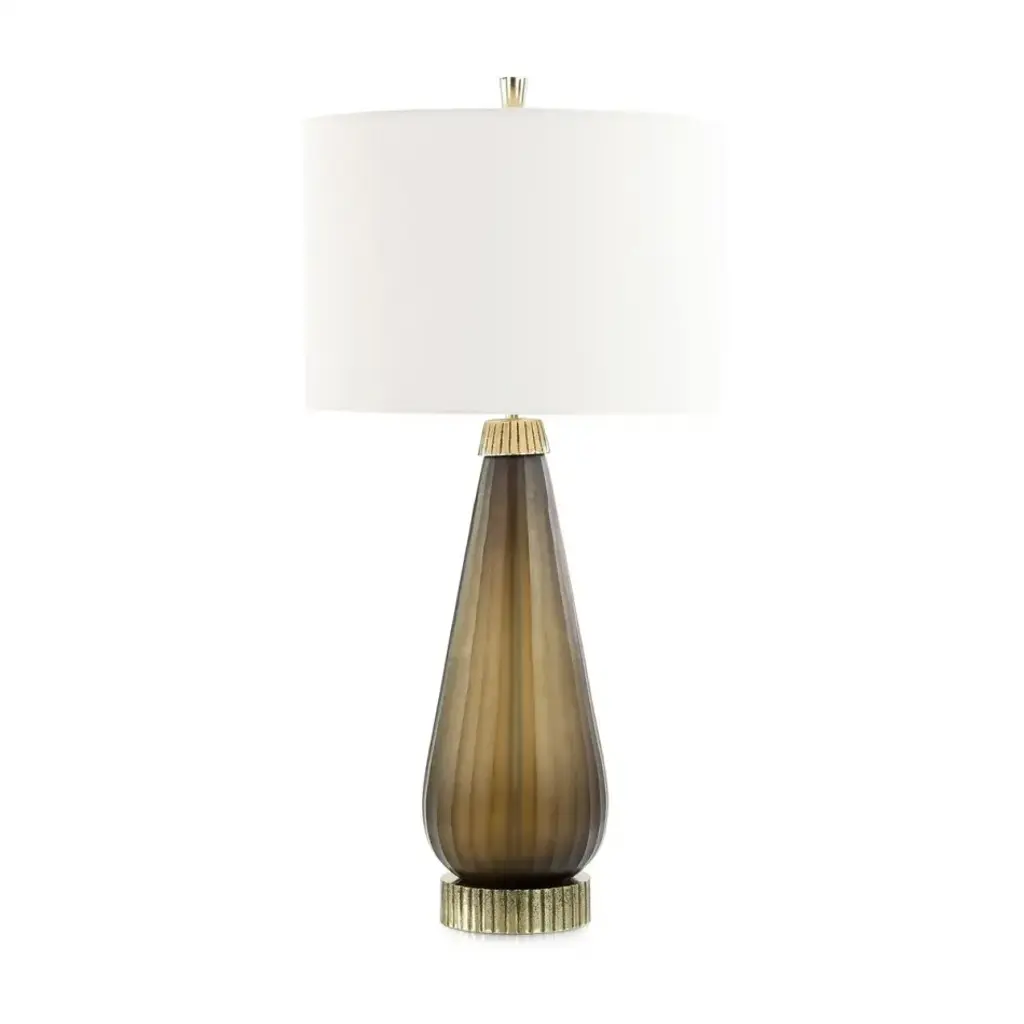 The Edel Table Lamp is a sophisticated design statement with rich textural depth. This glass piece with a brown tone showcases a faceted look, elevated by grooved aluminum accents in a Champagne finish at the base and neck.