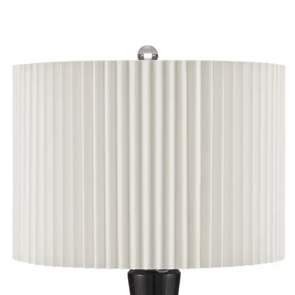 The Edelmar Table Lamp from Currey & Company combines luxury materials and sophisticated design. Your table lamp is expertly crafted from black marble, metal, and optic crystal, showcasing a tapered form that exudes elegance. Crowned with an off-white shantung shade, this table lamp emanates a soft and inviting glow, creating a pleasant ambiance in your space. Edelmar is illuminated by a candelabra base LED controlled by a convenient 3-way socket switch. The eye is drawn to the beautiful banding at the lamp’s center.