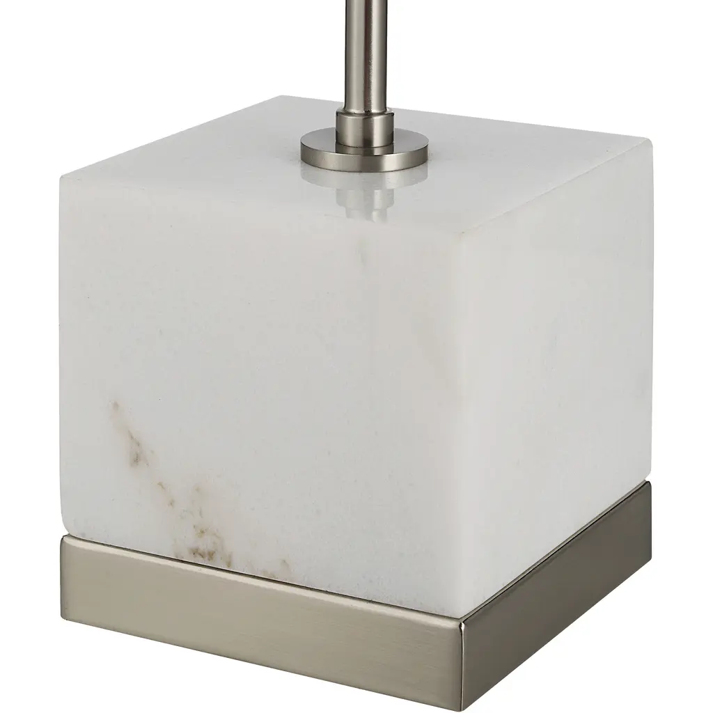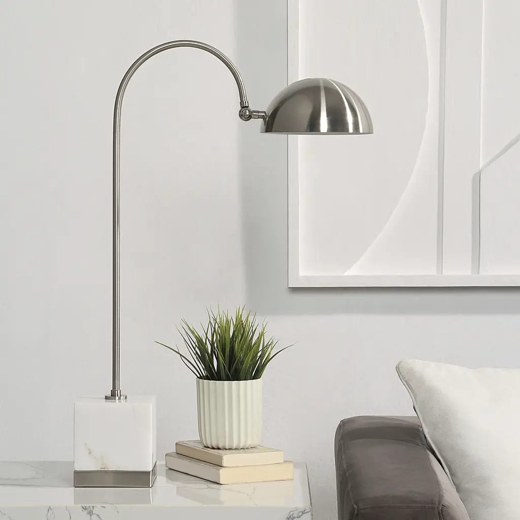 Put the finishing touch on any space with this stunning Edessa table lamp. Combining timeless materials with updated silhouettes, it features a honed white marble base topped off with a brushed nickel plated shade to shed light and luxury throughout a room. Adding to its lighting perfection is a moveable arm and a white inner finish on its domed shade for ultimate ambient light thats never harsh. A great pick as a living room table lamp, on a console table, a bedside table or anywhere else, Edessa will shine the spotlight on great style.