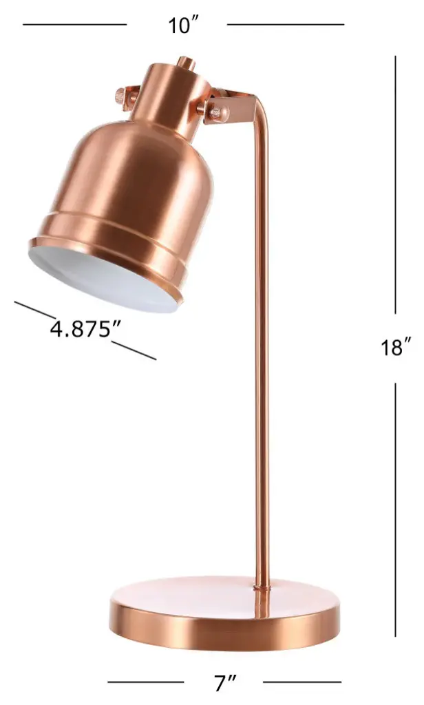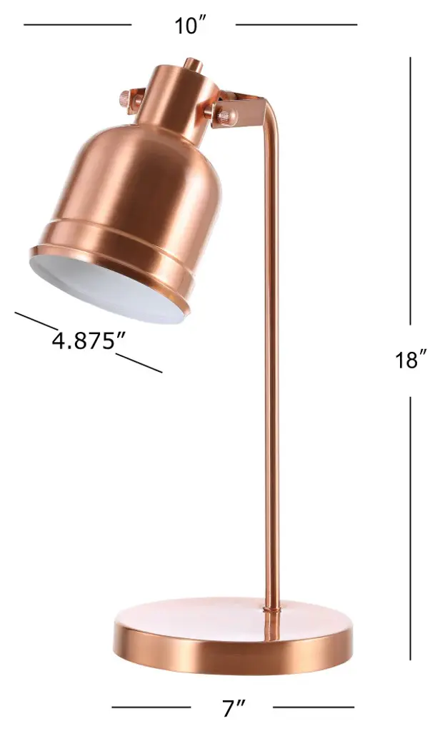 Copper, a stalwart of kitchen decor, is the foundation of this attractive table lamp which is designed for the other workhorse of that room -- the kitchen desk. With a swinging shade and in-line switch, the alchemy of function and form make this piece a must-have for any industrial workspace. At 18" high, the scale is ideal for any size desk, though the finish makes it eye catching on any surface. Features:A copper task lamp is the perfect addition to any office space The cord is 60" in length and constructed in plastic On-off in-line switchEco-friendly 9W LED bulb includedTakes one bulb and compatible with any 9W LED or 40W TYPE "A" or 13W CFLUL Listed 0Color: CopperBody Material: MetalBase Material: MetalFinial Material: Finial Color: Harp Color: Includes: One (1) lamp(s)Minor Assembly RequiredDimensions:Lamp: 18 inches high x 10 inches wide x 7 inches deepShade: 6.75 inches high x 4.875 inches wide x 4.875 inches deepAbout us:You see a lamp.We see a decorative work of art.A perfectly curved shade casts a dramatic shadow on a floor. A silk cord you never want to hide. LED lightbulbs: as easy on the environment as they are on the eyes. The JONATHAN Y Lighting collection considers every detail from impeccably sourced materials to designer styling. And our prices are so attractive, we''ve transformed a functional necessity into a fashion accessory.JONATHAN Y Lighting - a fashion revolution in home decor.