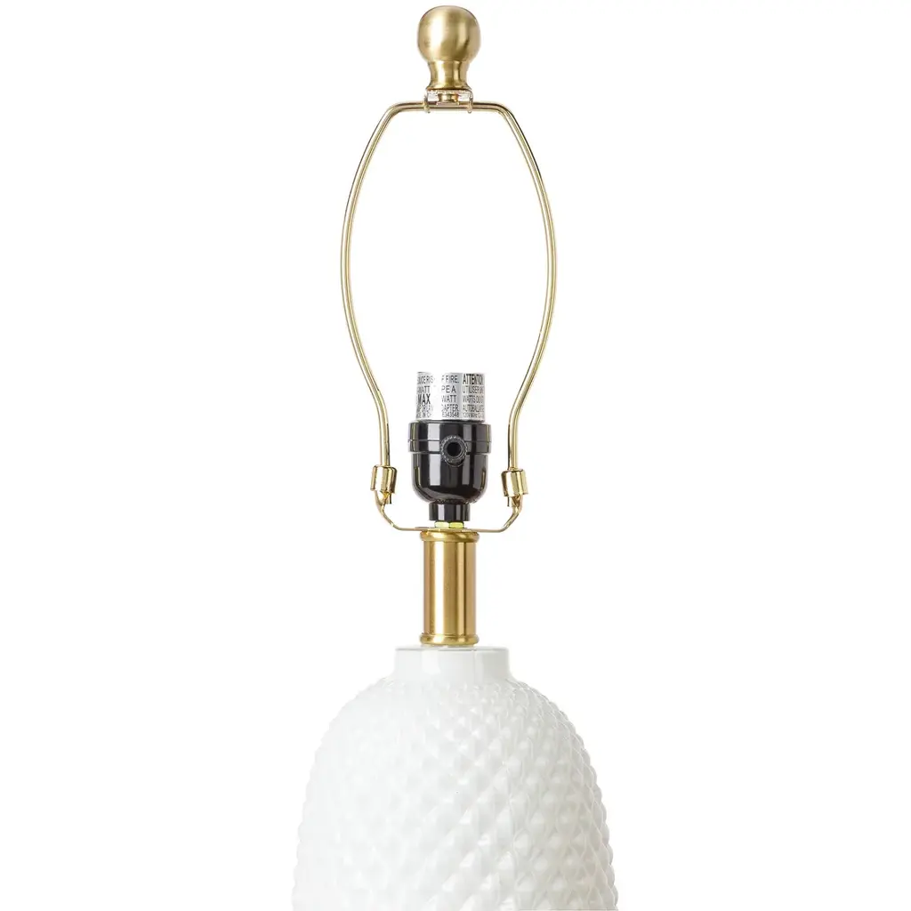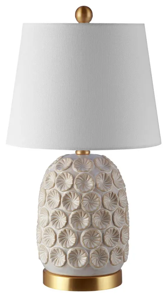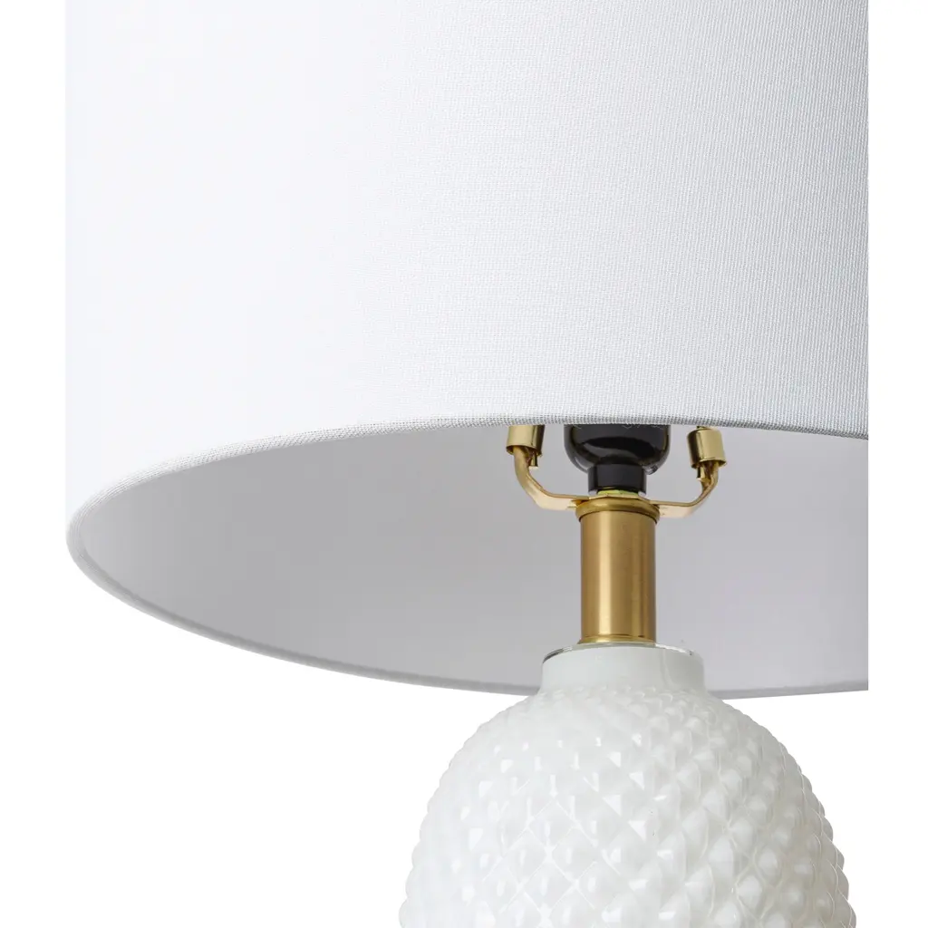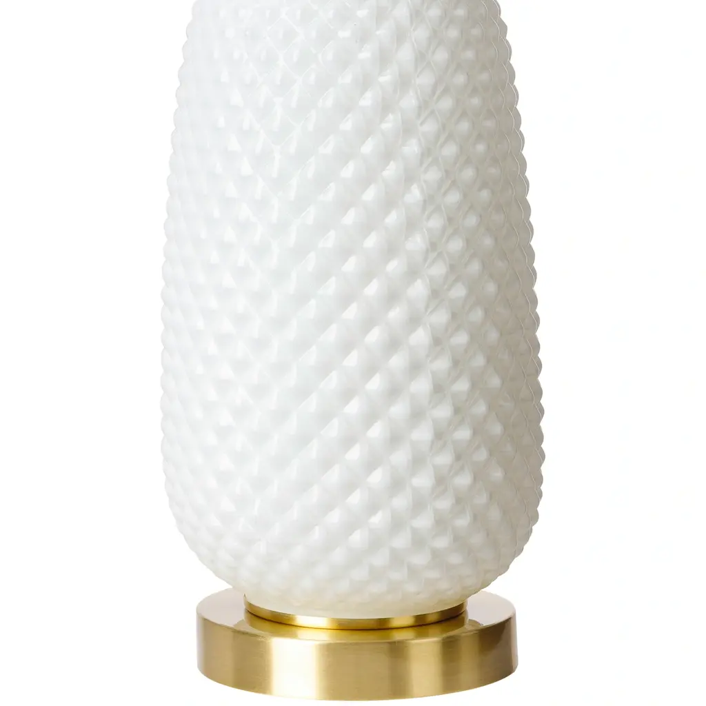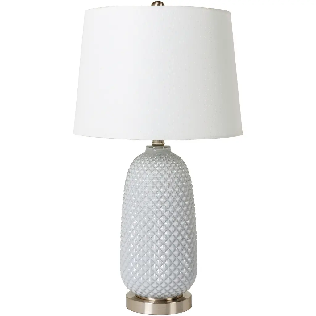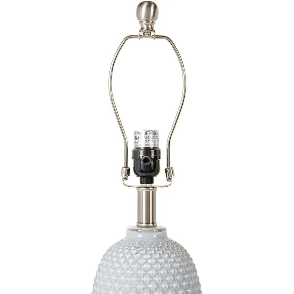 Classy and fun, this versatile lamp offers panache to spaces designed in a modern, traditional, glam, or transitional aesthetic. The glass body, painted gray, features a geometric diamond pattern, and the white linen shade blends with various color palettes. The brushed metal base and metal finial complete the design. This lamp is made in China, requires one E-26/100W bulb, and is UL CUL Certified. The dimensions are 14"W x 14"D x 26"H with a 6' cord, and an on/off switch.
