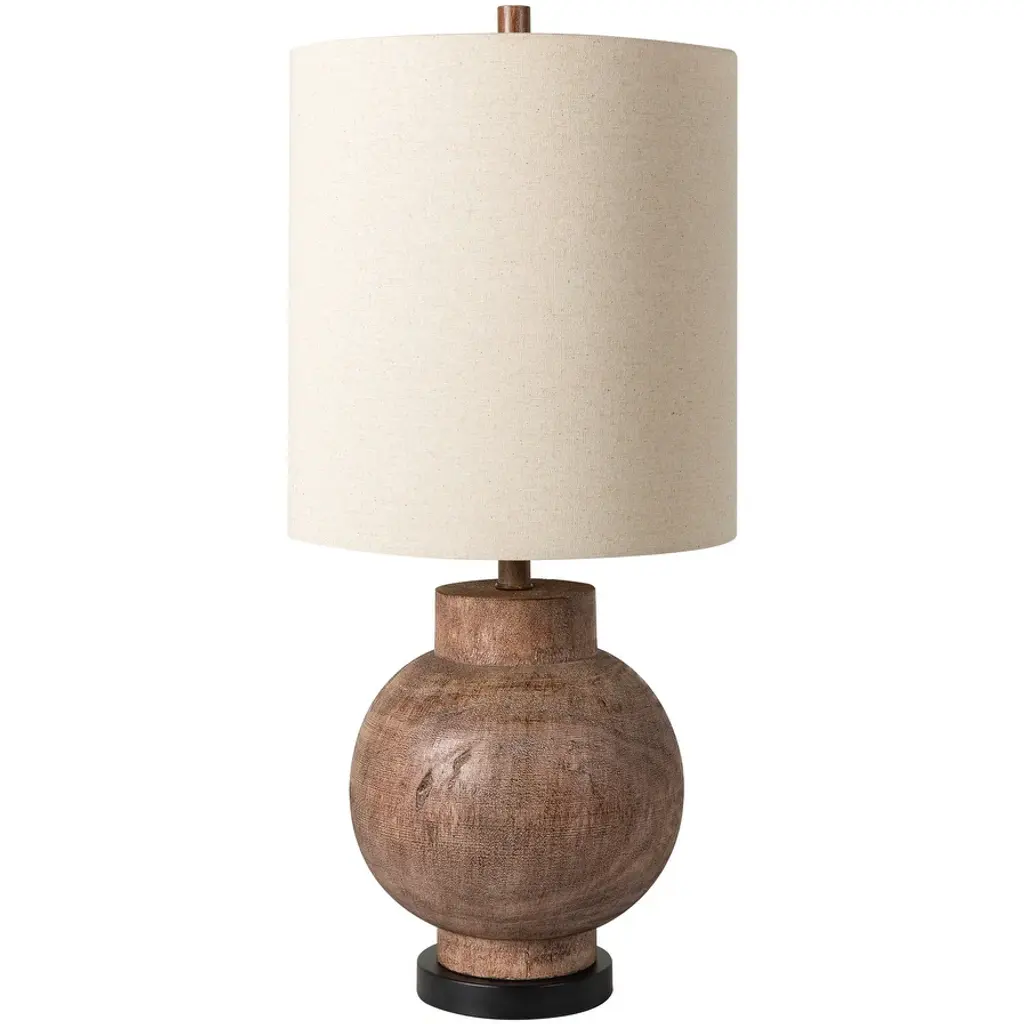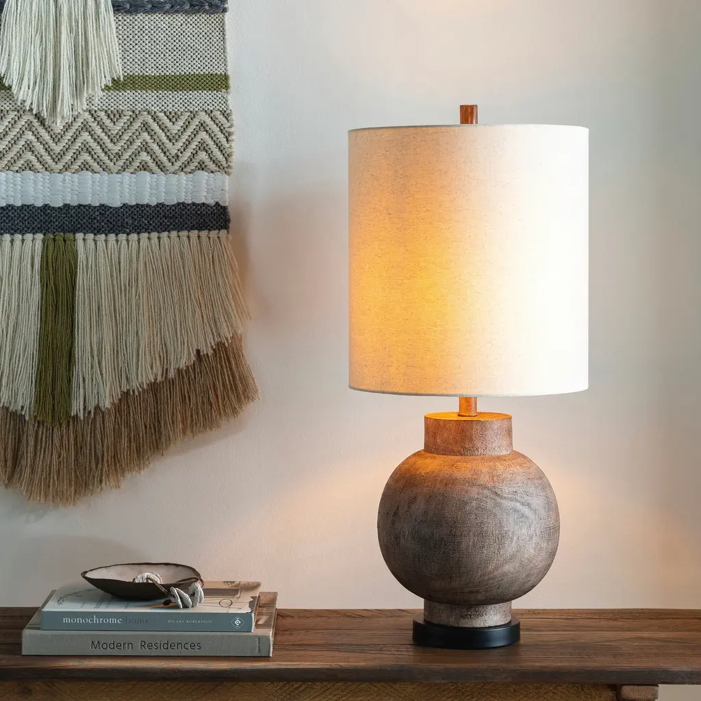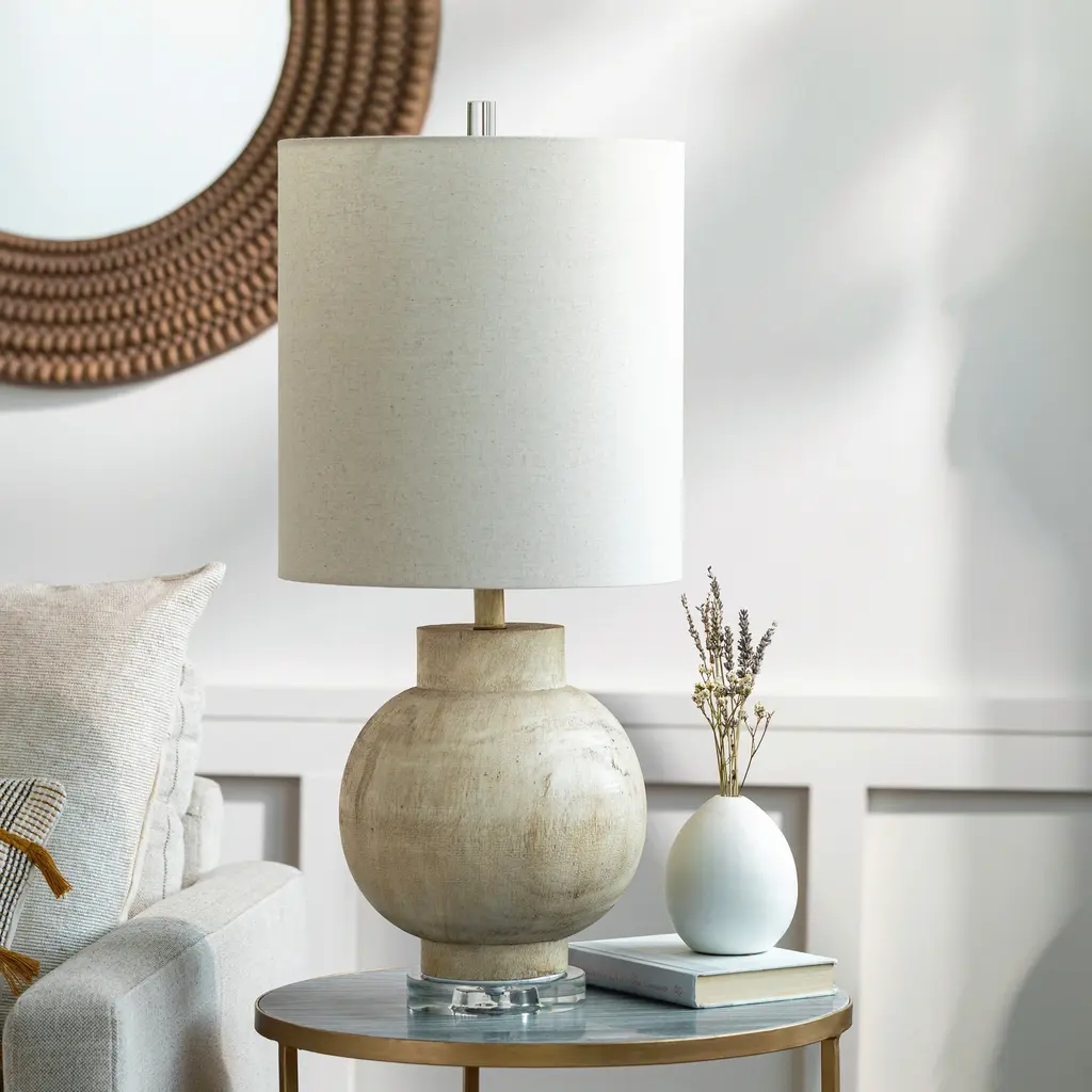 Filled with texture and charm, this table lamp showcases a rotund composition body. A tall linen shade contrasts the portly base for an alluring accent that pairs well with any decor style. Place bedside, couch side, or in your study or home office for a warm glow. This table lamp is UL/CUL certified with a 3-way switch. For optimal product care, wipe clean with a soft cloth.