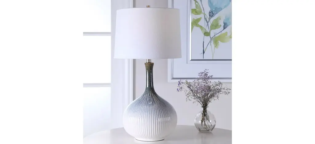 Mid-century inspired table lamp has a fluted ceramic base with noticeable ribbed texture and is finished in a cream, light blue, indigo, and dark brown ombre glaze with brushed nickel plated accents. The lamp is paired with a tapered round hardback shade in an off-white linen fabric with light slubbing.