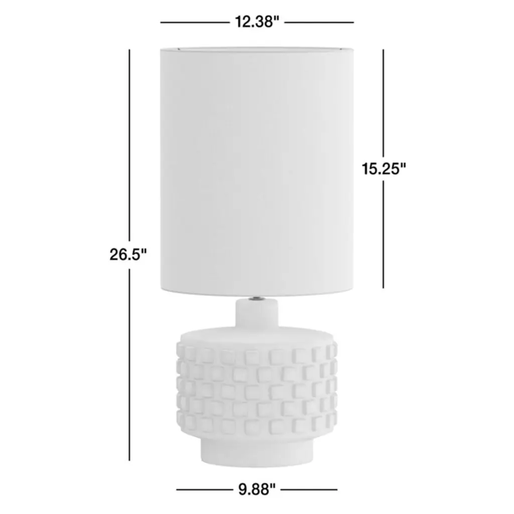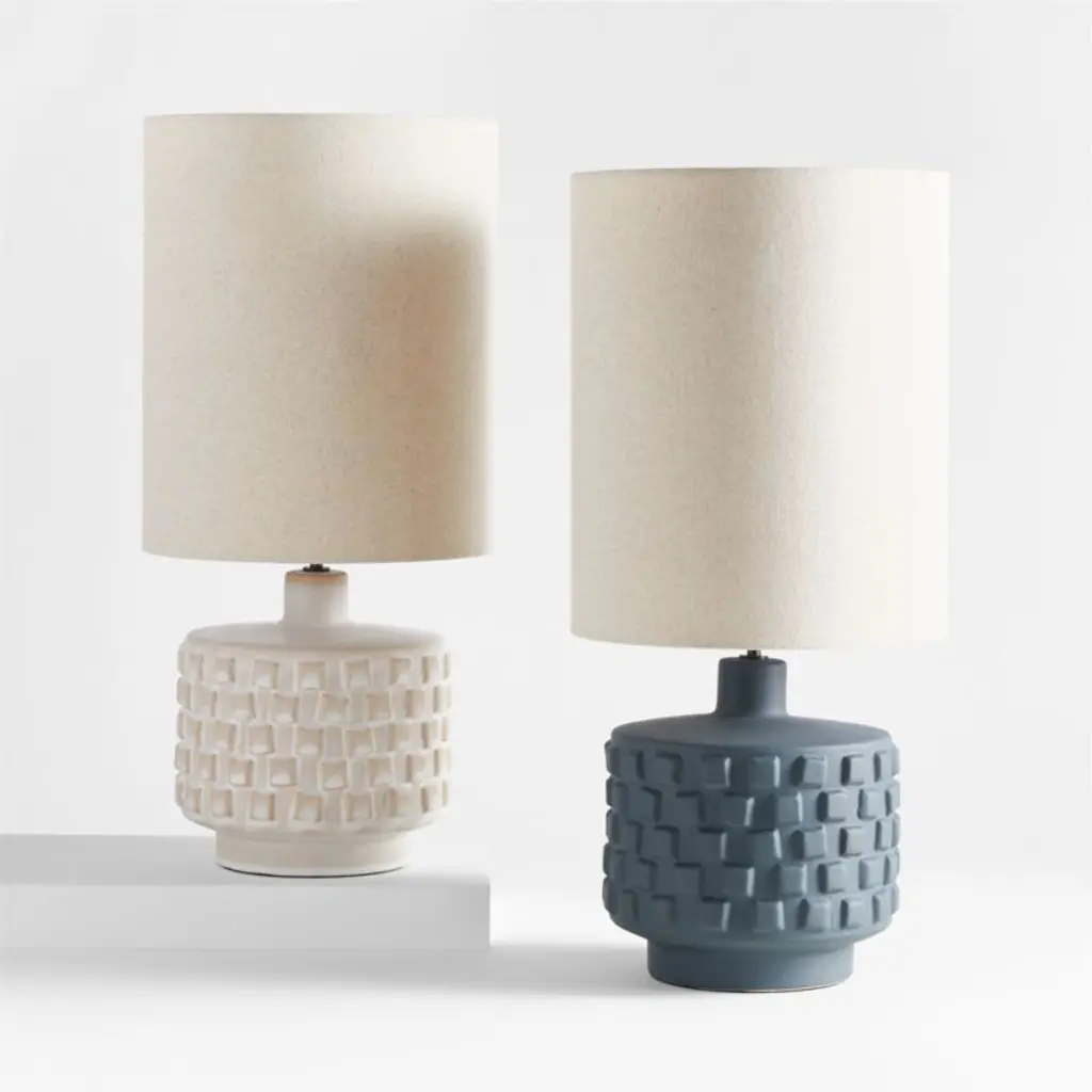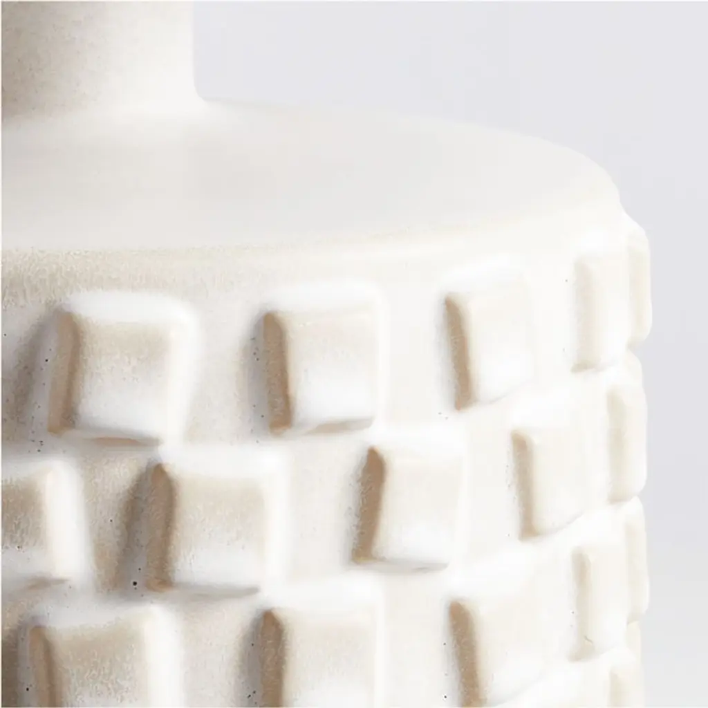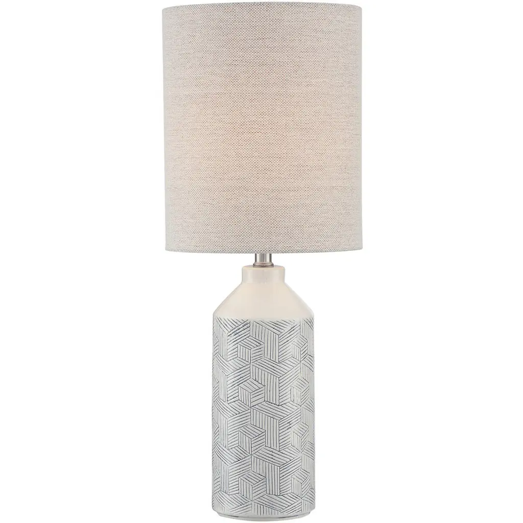 Charmingly off-kilter checks texture our Eino table lamp with an organic pattern and playful feel. Glazed translucent ivory, the cylindrical ceramic base rests upon a subtle pedestal and is topped with a tall linen shade that continues the natural, artisanal look. We especially love placing our exclusive Eino ceramic lamp where its unique surface can be admired.