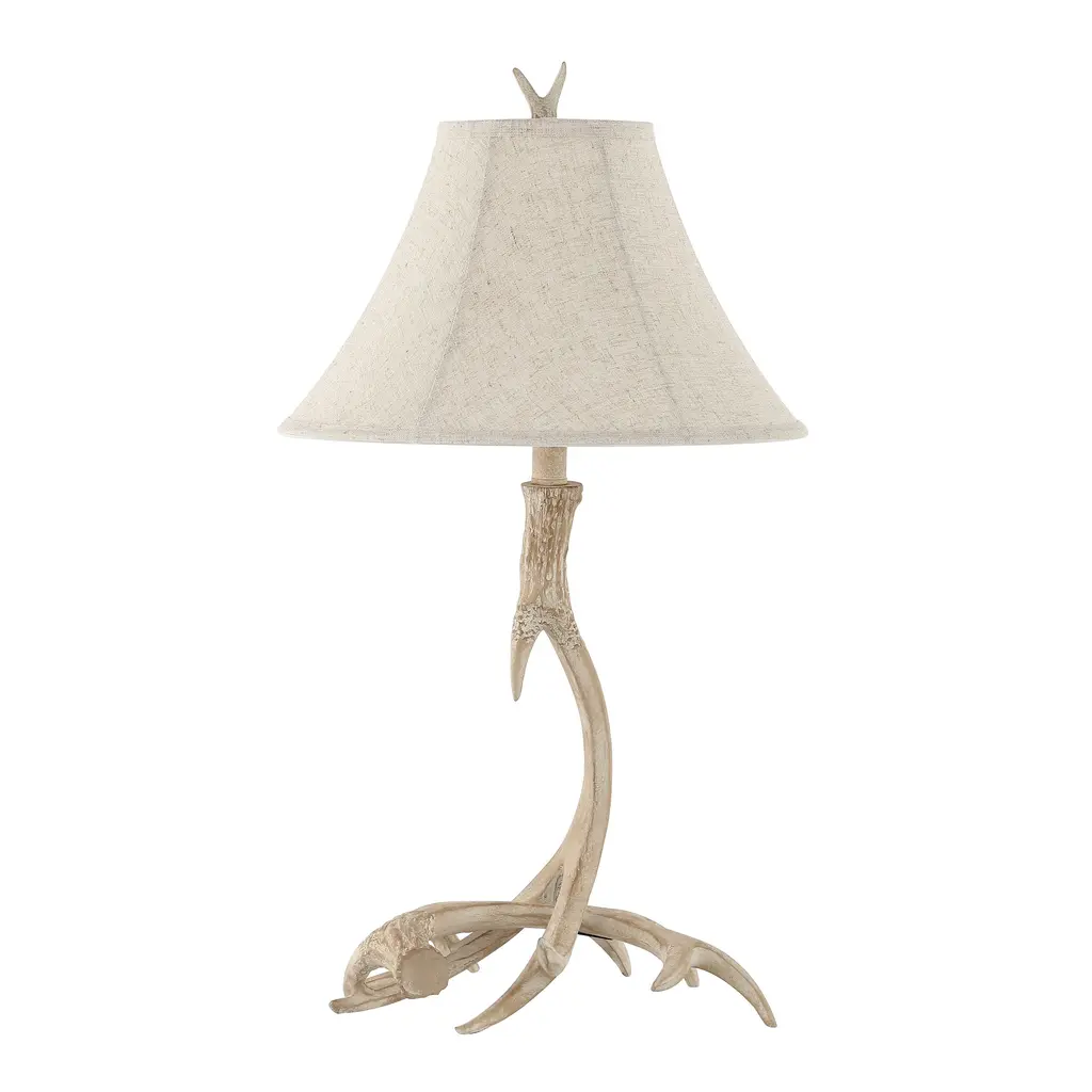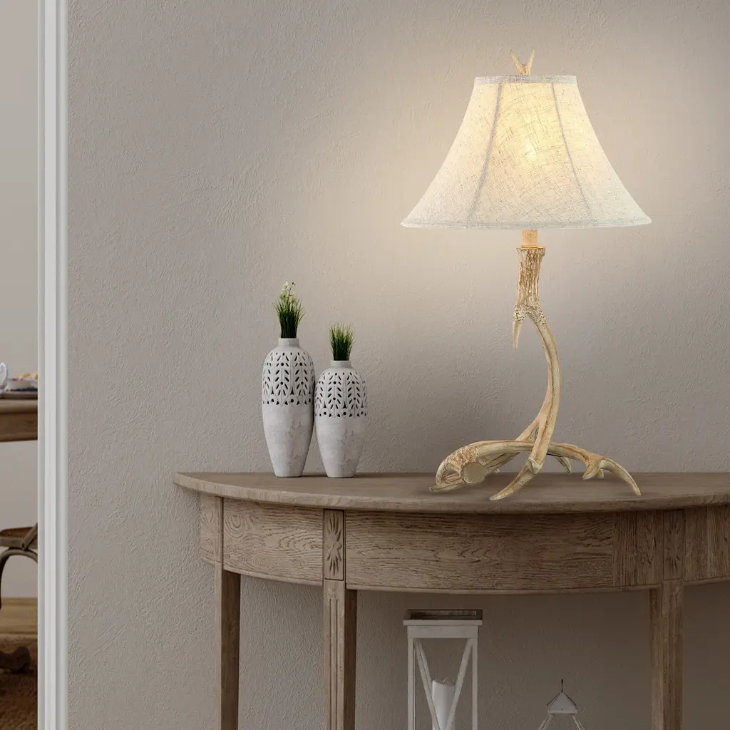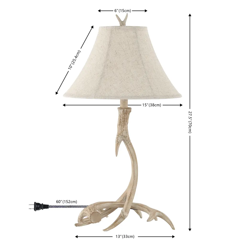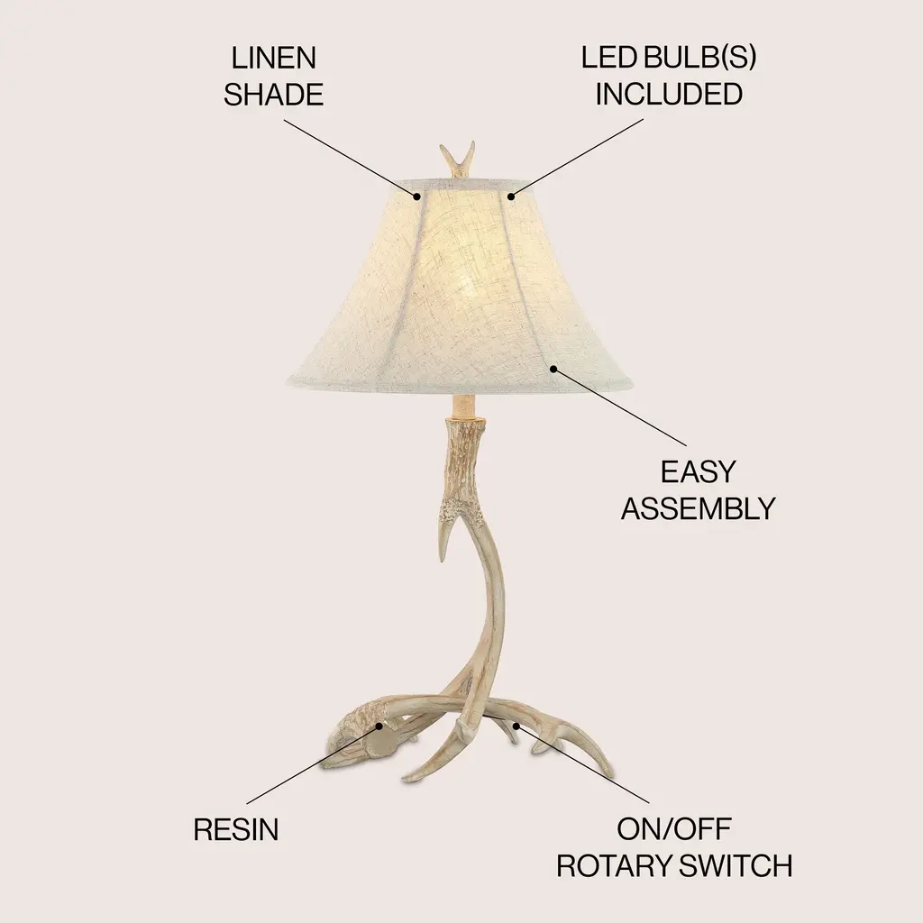 Create a classic lodge feel in your home with this rustic table lamp. Featuring a faux antler base, this nature-inspired lamp is beautifully rugged and artistic. The natural linen drum shade diffuses the light for a soft, warm cabin glow.Features:Dimensions:About us:You see a lamp.We see a decorative work of art.A perfectly curved shade casts a dramatic shadow on a floor. A silk cord you never want to hide. LED lightbulbs: as easy on the environment as they are on the eyes. The JONATHAN Y Lighting collection considers every detail from impeccably sourced materials to designer styling. And our prices are so attractive, we've transformed a functional necessity into a fashion accessory.JONATHAN Y Lighting - a fashion revolution in home decor.