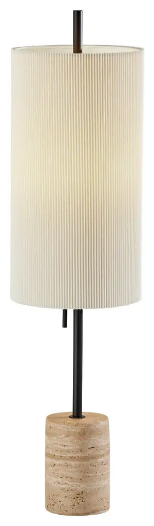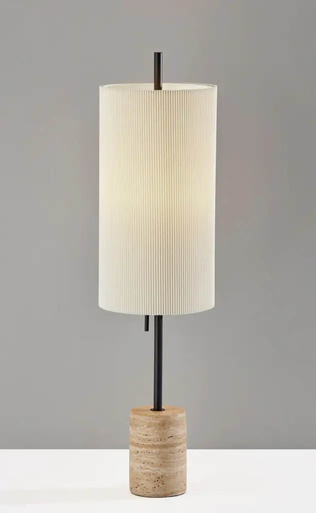 Introducing the 3961-01 Eleanor Table Lamp, a perfect blend of classic elegance and modern design. This table lamp showcases a sleek black finish that adds a touch of sophistication to any room. Its tall drum-shaped off-white knife pleated fabric shade exudes timeless charm. Standing at a height of 30 inches, the Eleanor Table Lamp becomes a stylish focal point, supported by a substantial chunky travertine stone base. With an on/off pull chain switch, it offers easy and convenient control over your lighting, making it a versatile addition to your home decor.Elevate your space with the 3961-01 Eleanor Table Lamp, where classic meets contemporary in perfect harmony.Timeless Elegance: The 3961-01 Eleanor Table Lamp features a sleek black finish that adds a touch of timeless elegance to your decor, making it a versatile piece for various design styles.Tall Drum Shade: Showcasing a tall drum-shaped off-white knife pleated fabric shade, this lamp exudes classic charm while delivering ample illumination.Substantial Stone Base: Supported by a chunky travertine stone base, the lamp stands with presence, adding visual weight and stability to your living space.Effortless Control: Equipped with an on/off pull chain switch, this lamp offers straightforward and convenient control over your lighting, ensuring a hassle-free user experience.Versatile Height: Standing at 30 inches, the Eleanor Table Lamp becomes a stylish focal point that enhances the ambiance and style of any room, from living areas to bedside tables.
