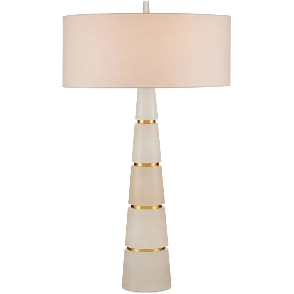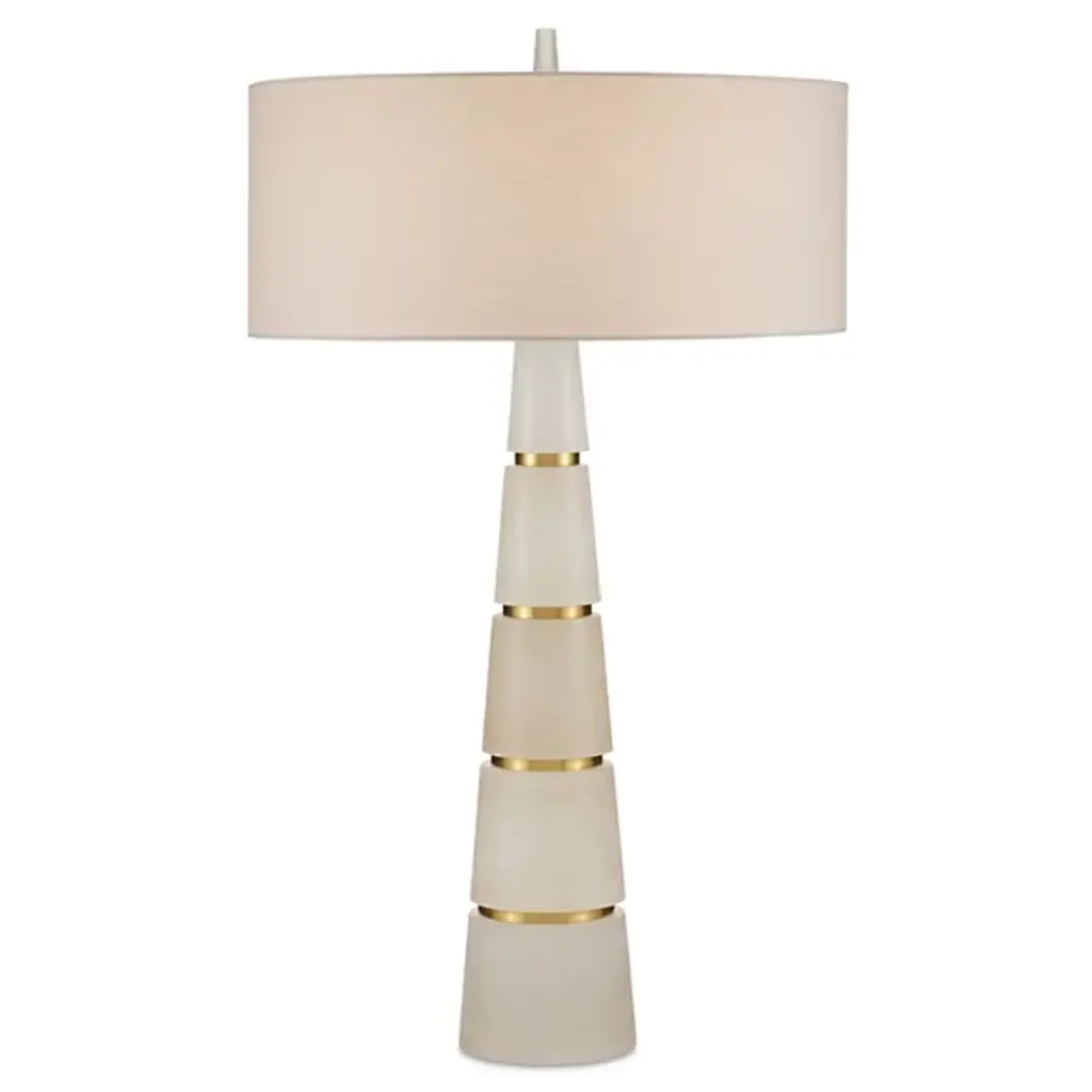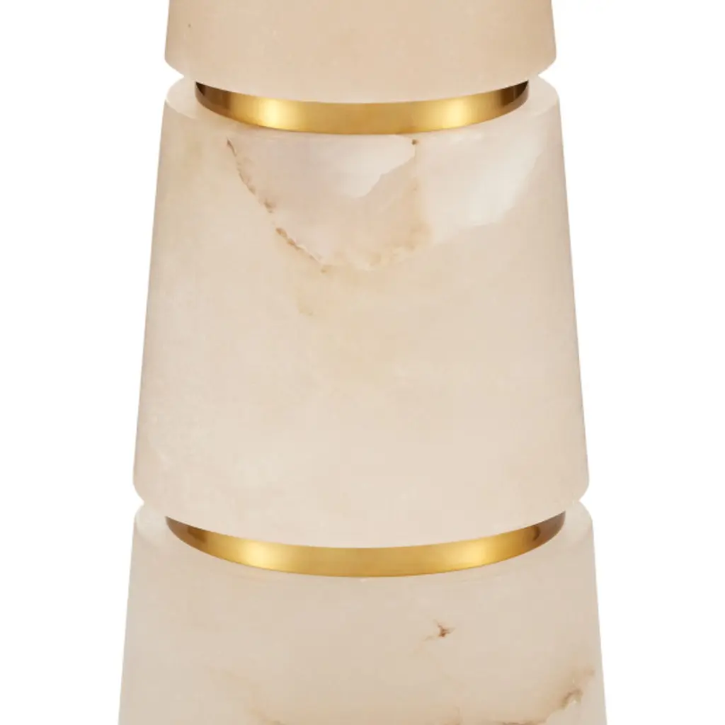 The Eleanora Table Lamp, designed by Tom Caldwell, has a modern feel that leans toward Hollywood glamour. Made of natural alabaster, the graduated segments of luminous material are cinched by brass rings that glow just as beautifully as the stone when the lamp is switched on. Design details of note are how the finial tapers as if it is an extension of the lamp's body, as well as the shallow profile of the off-white linen shade.