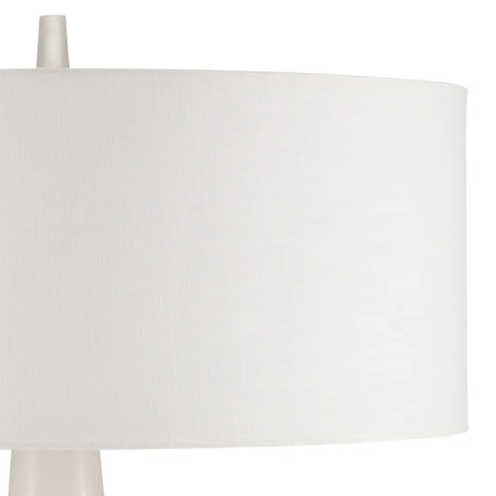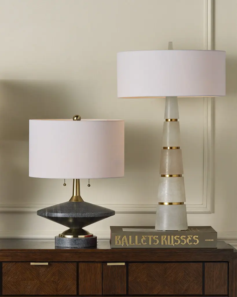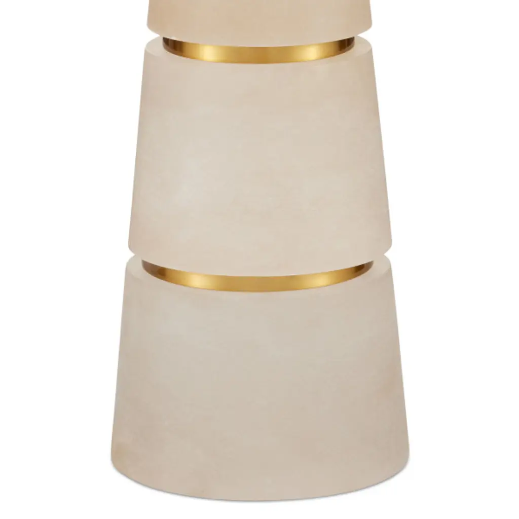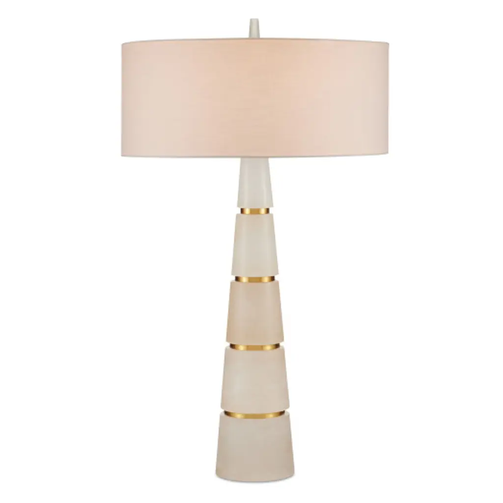 The Eleanora Table Lamp, designed by Tom Caldwell, has a modern feel that leans toward Hollywood glamour. Made of natural alabaster, the graduated segments of luminous material are cinched by brass rings that glow just as beautifully as the stone when the lamp is switched on. Design details of note are how the finial tapers as if it is an extension of the lamp's body, as well as the shallow profile of the off-white linen shade.