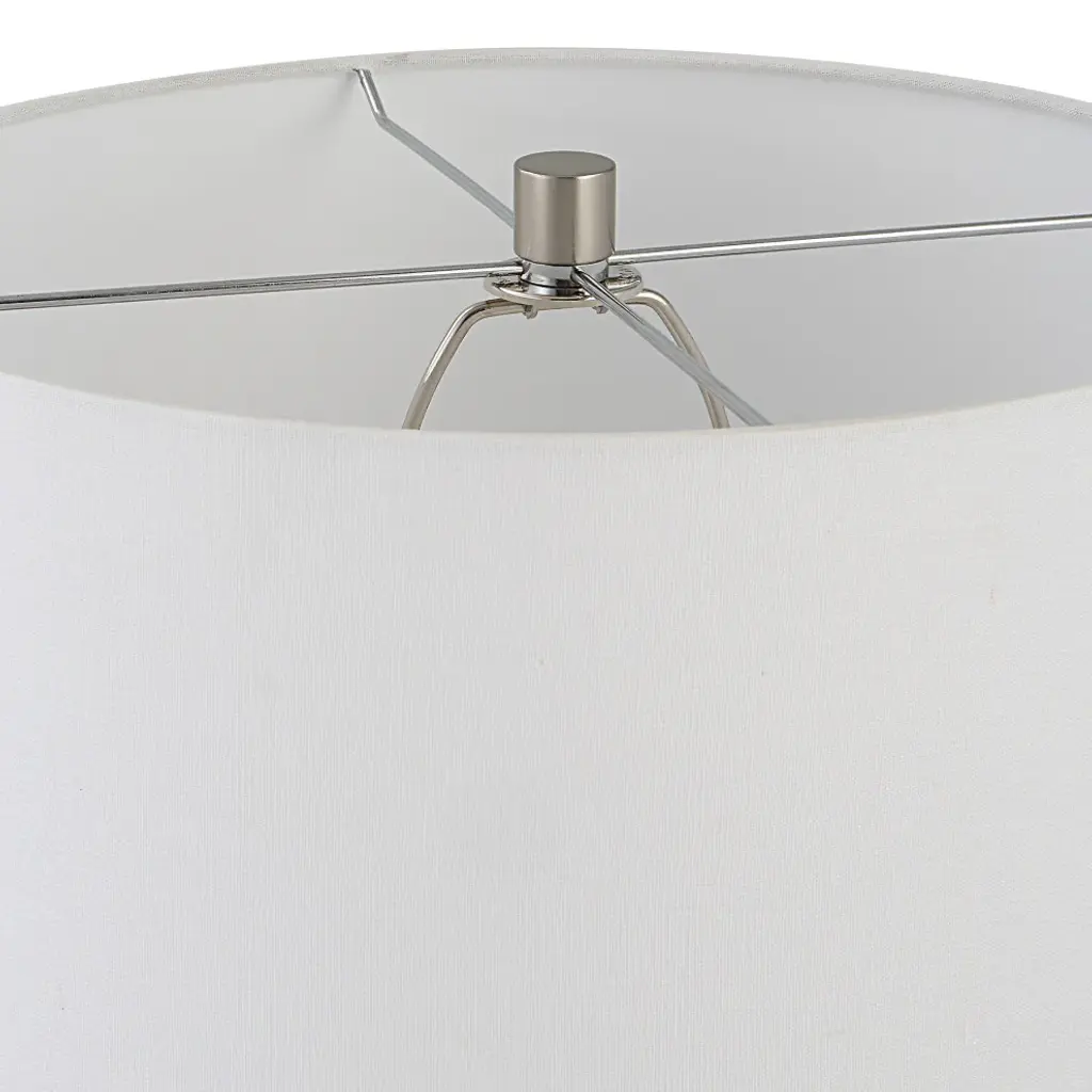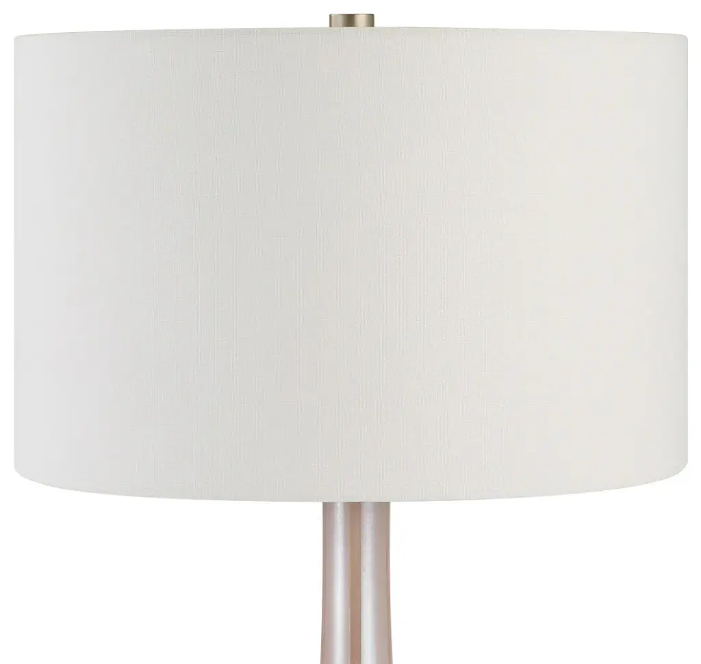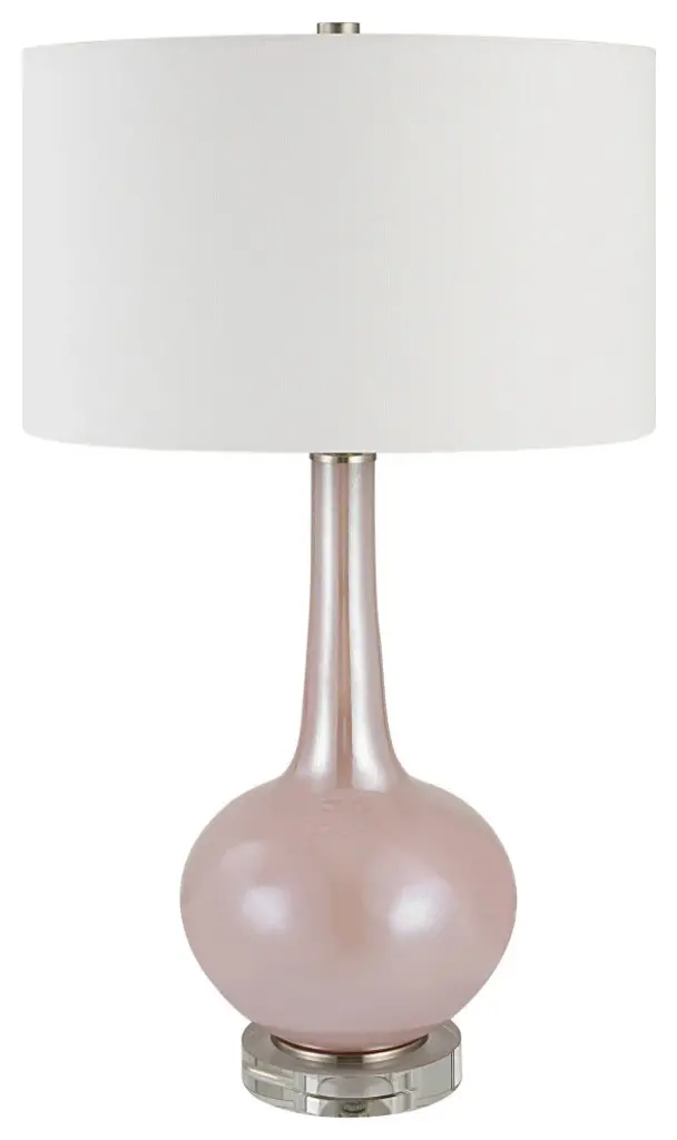 Elegant and sophisticated, this blushing beauty showcases a light blush pink glass base with brushed nickel and crystal details. The hardback drum shade is covered in a white cotton fabric.16"W x 16"D x 29"H. Weighs 14 lbs.Hand Finished Art Glass and Crystal. Fabric Cotton Shade.UL listed. Uses one max 150W Type A bulb (not included). 3 way socket switch.Heirloom Quality - Expertly hand crafted and hand finished. Due to the hand crafted nature of this piece, each piece may have subtle differences.