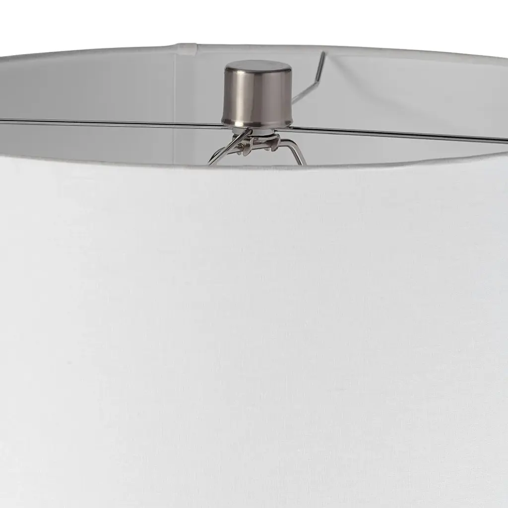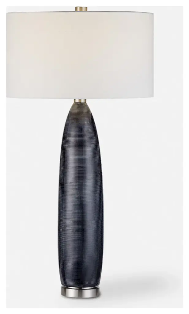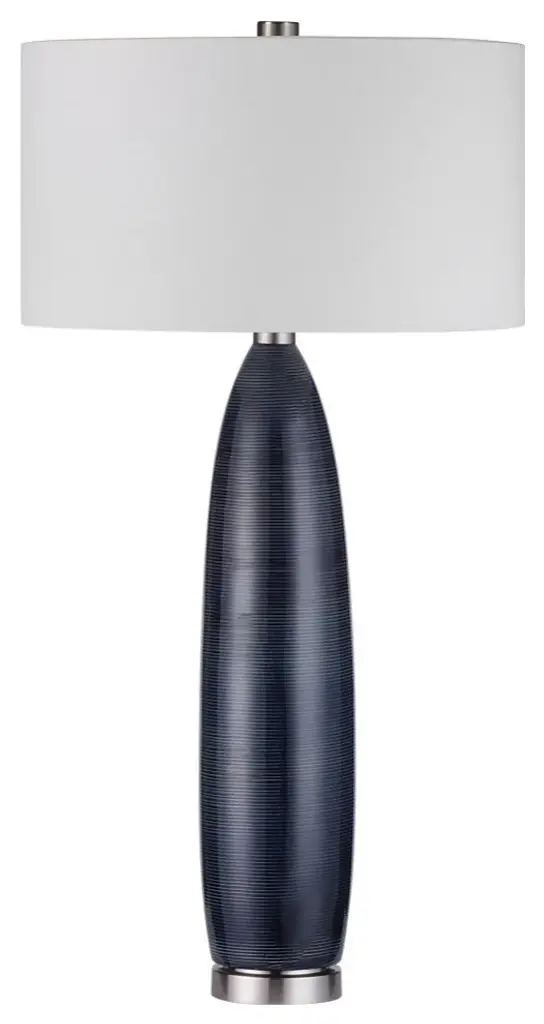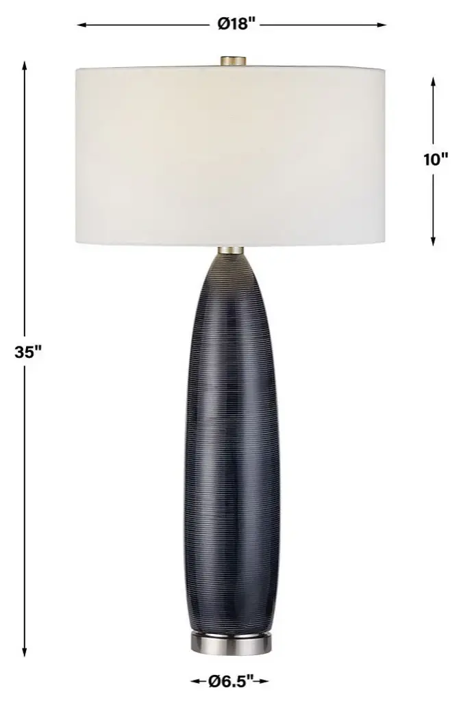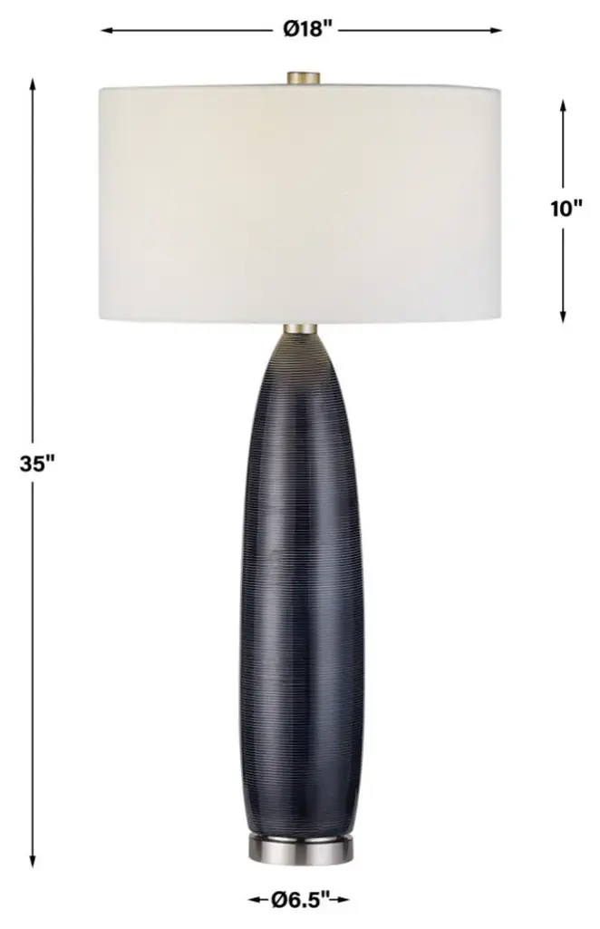 This handcrafted ceramic table lamp showcases an elevated look with a striped motif and a Prussian blue-gray glaze. Brushed nickel plated iron details accentuate the design. The hardback drum shade is covered in a white linen fabric.18"W x 18"D x 35"H. Weighs 16 lbs.Hand Finished Ceramic. Linen Fabric ShadeUL listed. Uses one max 150W Type A bulb (not included). 3 way socket switch.Heirloom Quality - Expertly hand crafted and hand finished. Due to the hand crafted nature of this piece, each piece may have subtle differences.