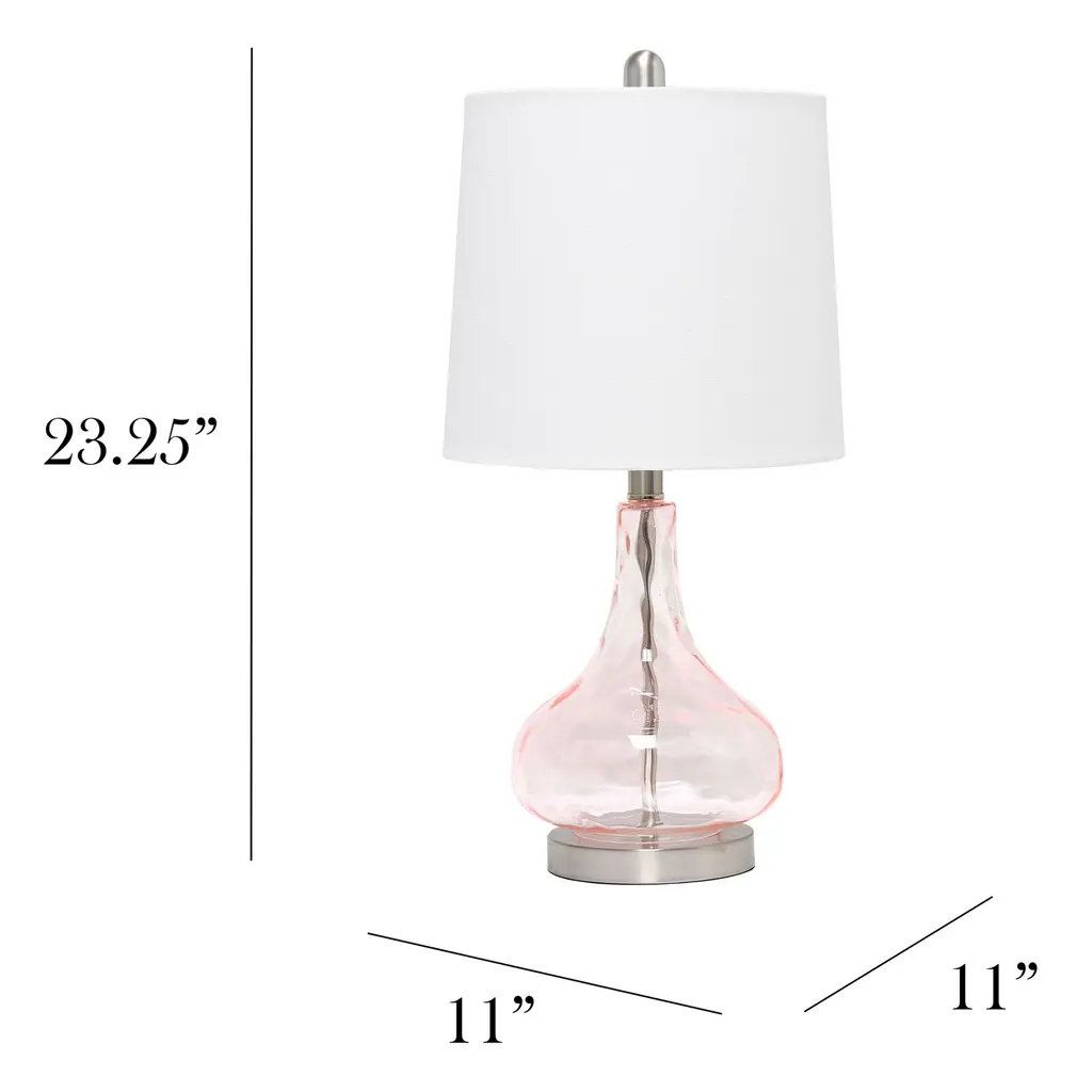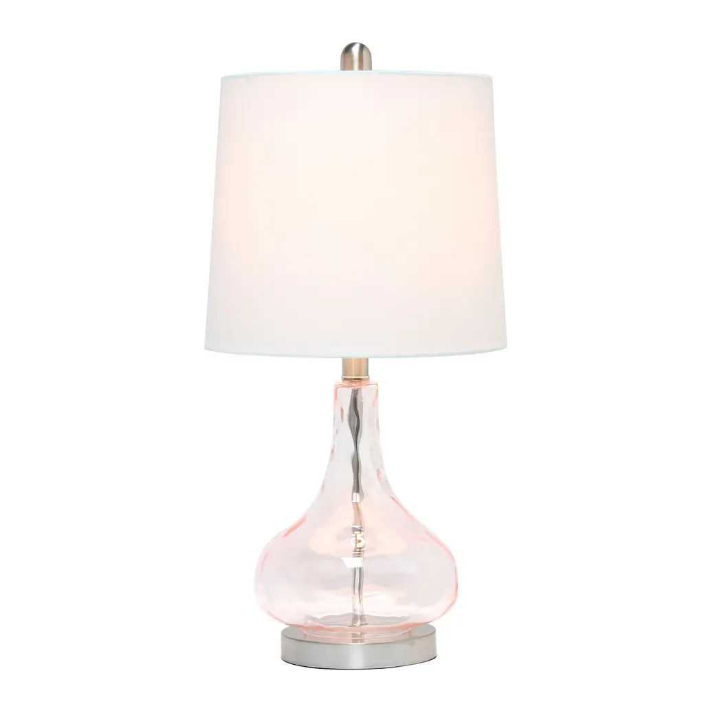 Beautify your home with this clear glass table lamp! Paired with a beautiful white fabric shade, its' see through base bends alongside chrome accents combines simplicity and the right touch of color. If you're seeking simplicity with a dash of uniqueness, this is the perfect lamp!Curvy clear rose quartz glass base. White tapered fabric shade. Easily accessible rotary switch located on the socketUses 1 x 60W medium type A base bulb (not included). 5' clear plug in cord . Elegant and contemporary lookProduct Dimensions: 11"Lx11"Wx23.25"H, Weight: 3.81lbsFinish/Color: Rose quartz. Primary Material: Glass, 47% TC fabric, 4% chrome plated steel, 48% glass, 1% plastic. Style: ContemporaryBulb Type: Incandescent (A19). Switch Type: Rotary. Switch Location: Socket. Number of Lights: 1. Maximum Wattage: 60. Cord Color: Clear. Cord Length: 60. Base Dimensions: L:6 X W: 6 X H: 1