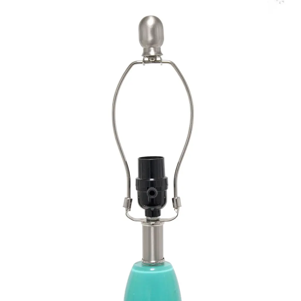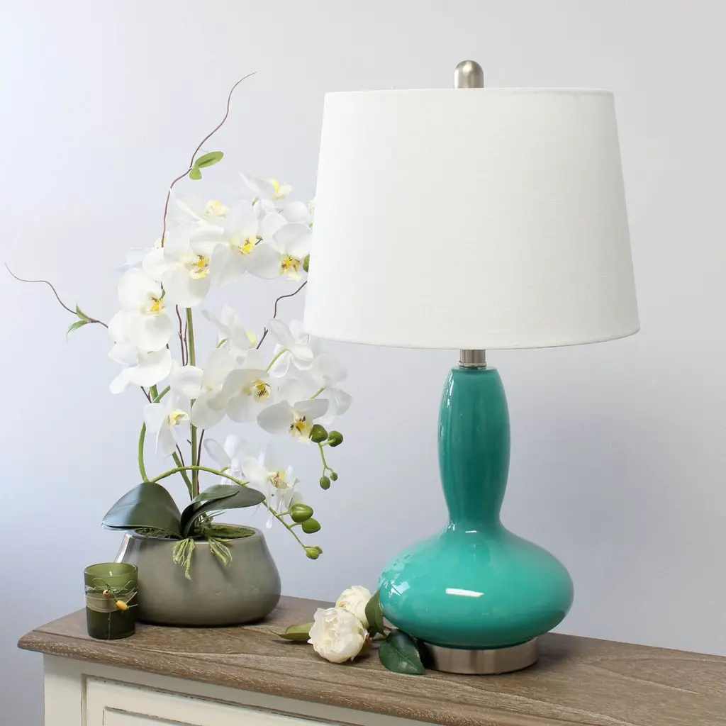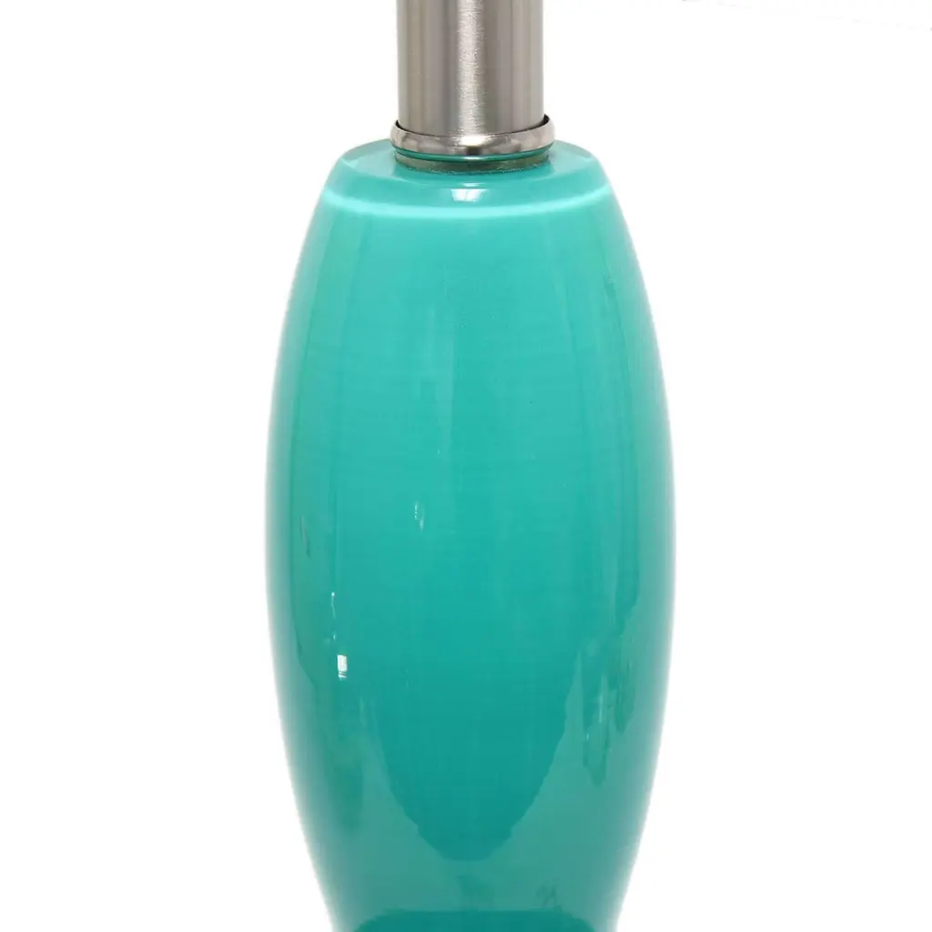 Description:Simple yet sleek, this table lamp will add the perfect touch of style to your home. With a smooth and contemporary shaped base in Teal, this lamp offers a sophisticated feel to top off your night stand, living room, bedroom or office. Accented with brushed nickel and a white fabric shade, this is the perfect fit for your home decorating needs! Material Breakdown: 48%, Fabric, 48%, glass, 3%, metal, 1% plastic, Lamp measures D: 13" x 23.50"Features:Teal glass base. White fabric shade. Style: Contemporary. Finish/Color: Teal. Primary Material: Glass. Shade Bottom Opening: 13. Cord Length: 65.Base Type: E26. Base Dimension: 8.8L x 8.8W x 16.5H, Height from Base to Socket/Shade: 13/9", Bulb Included: No. Shade Shape: Tapered.Easily accessible rotary switch located on the socket. Number of Light: 1. Maximum Wattage: 60. Shade Material: Fabric. Cord Color: Clear.Uses 1 x 60W medium type A base bulb (not included). Available in additional base color option. Shade Height/Slant: 9.Shade Security: Harp & Finial.