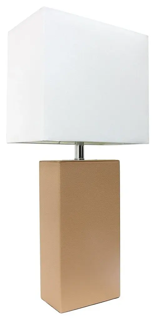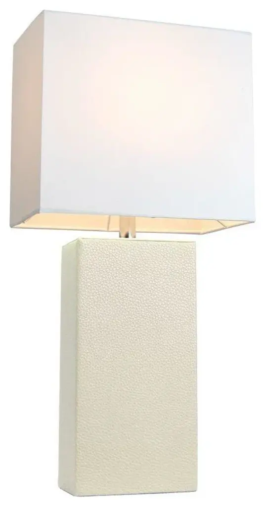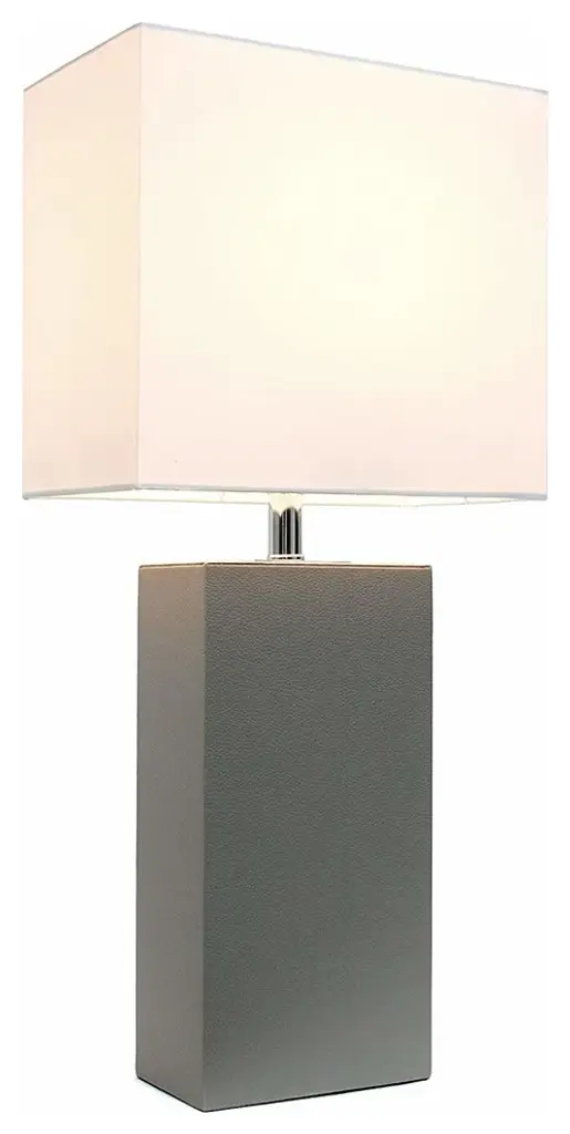 Elegant Designs Modern Leather Table Lamp with White Fabric Shade, Gray.This fashionable table lamp, with its leather body and white fabric shade, will add style and pizzazz to any room. We believe that lighting is like jewelry for your home. Our products will help to enhance your room with elegance and sophistication.Genuine leather wrapped baseWhite fabric shadeModern and stylish lookAssembled dimensions: L: 10" x W: 6" x H: 21"UL/CULBulb Type: IncandescentSwitch Type: RotarySwitch Location: CordShade Diameter: L: 10" x W: 6"Shade Height/Slant: 9Shade Security: Uno RingNumber of Lights: 1Maximum Wattage: 60Shade Material: FabricCord Color: ClearFinish/Color: GrayPrimary Material (Leather,Metal,Wood): MDFBase Type: E26Medium BaseBase Dimensions: L: 5.43" x W: 3.3" x H: 10.83"Height from Base to Shade: 12.5Bulb Included: No