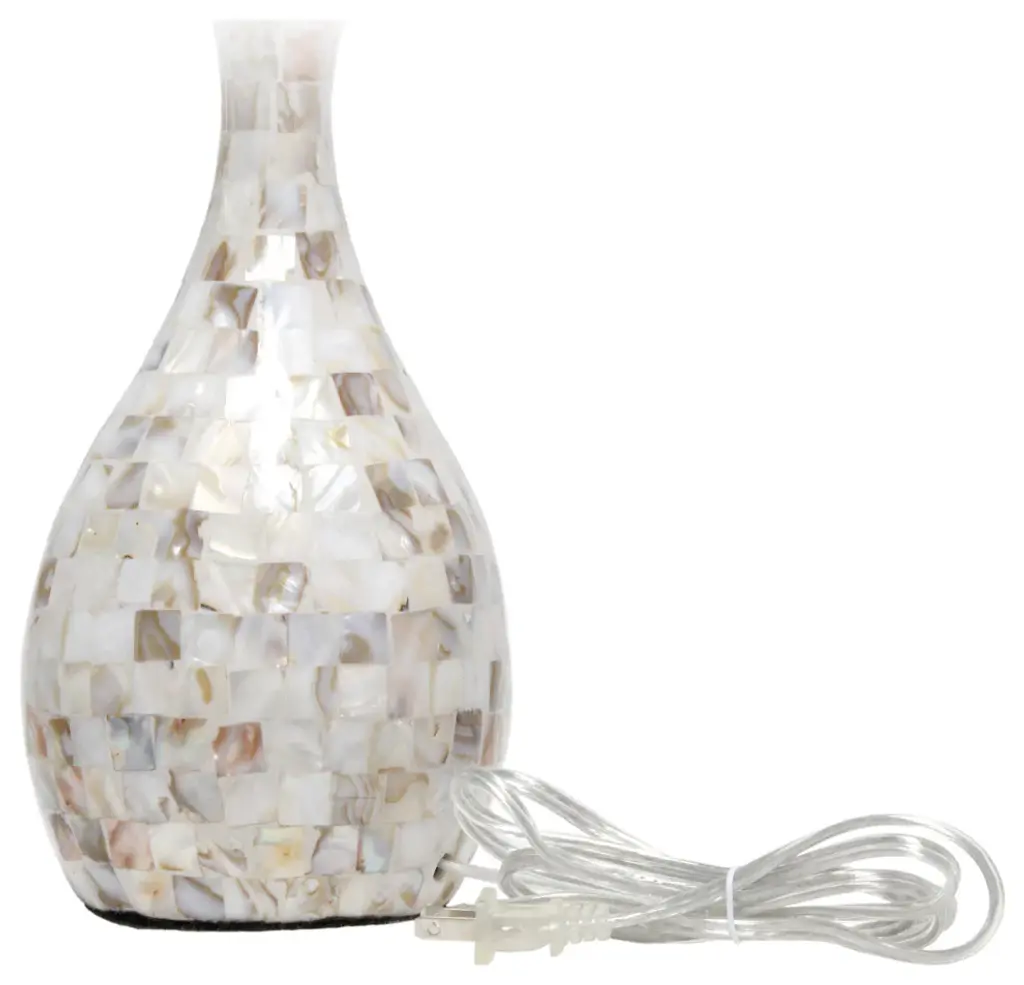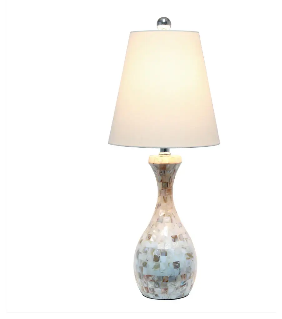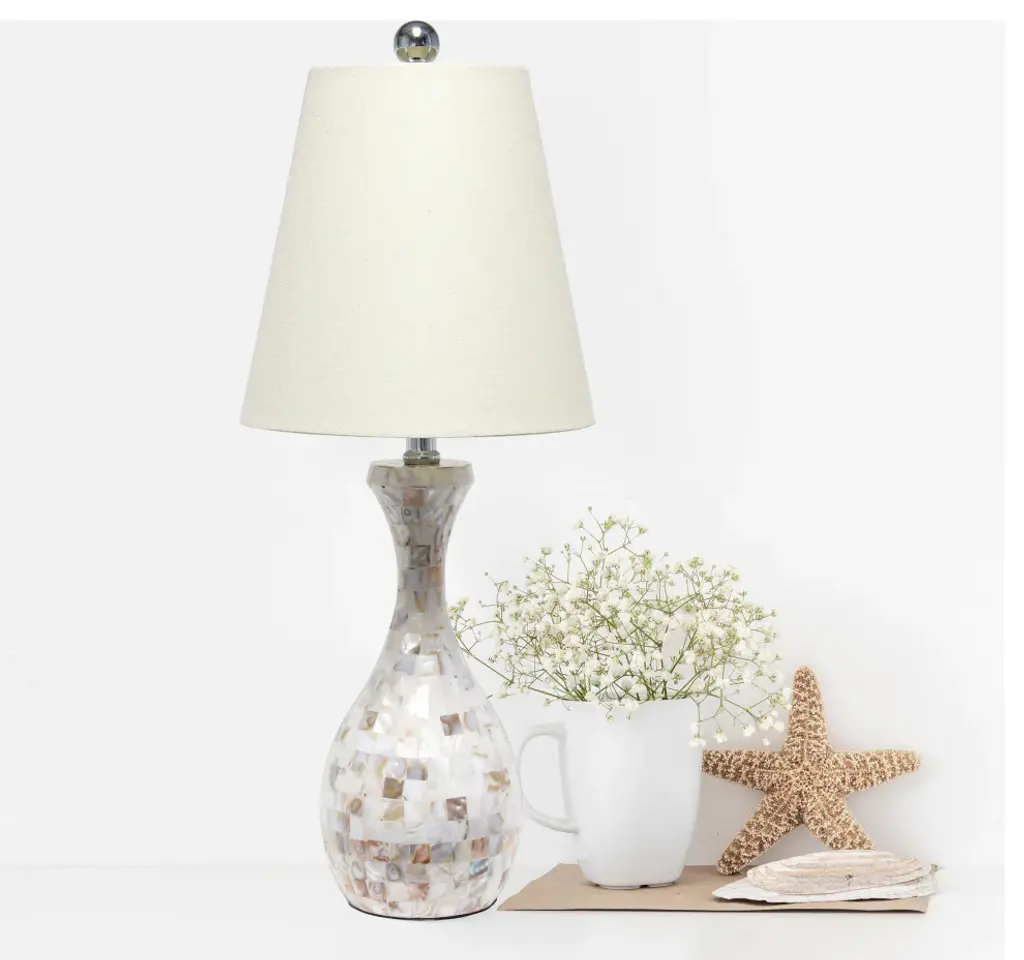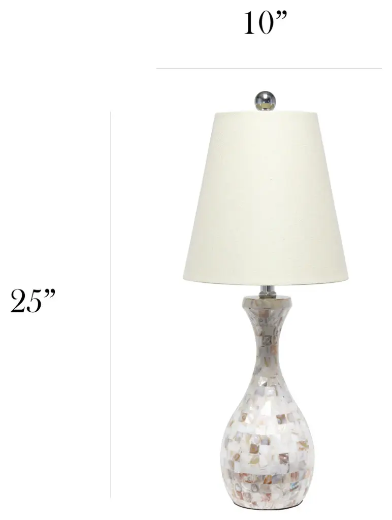 Elegant Designs Seashell Mosaic Look Table Lamp This fabulous table lamp features the stylish Capiz shell look tiled mosaic pattern. Beautifully constructed blending muted shades of coral, gray and white. It is accented with a flawless chrome finish and a cream fabric shade. These neutral tones and slightly iridescent tiles will add beauty and charm to any room. We believe that lighting is like jewelry for your home. Our products will help to enhance your room with elegance and sophistication. Cream fabric shadeFlawless chrome finish accentsCapiz shell tile look forms gorgeous mosaic pattern on curvy lamp baseHeight: 22.4" Shade diameter: 10"Coastal styleUses 1 x 2-Way 60W Type A Medium Base Bulb (not included)Finish/Colour :Mosaic ShellBulbs Included :noBulb Type :IncandescentShade diameter :10Number of Lights :1Maximum Wattage :60Shade meterial :FabricCord Colour :Clearcord Length :5'' ( measured 54.5")Product Dimension(L x W x H) :10 x 10 x 25Base Dimensions :W: 5.5" D: 5.5" Height: 13.5"