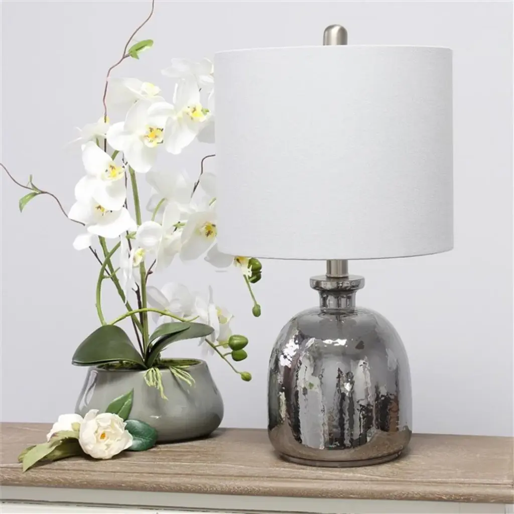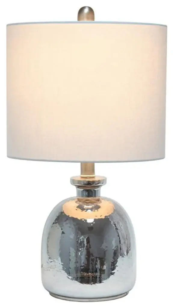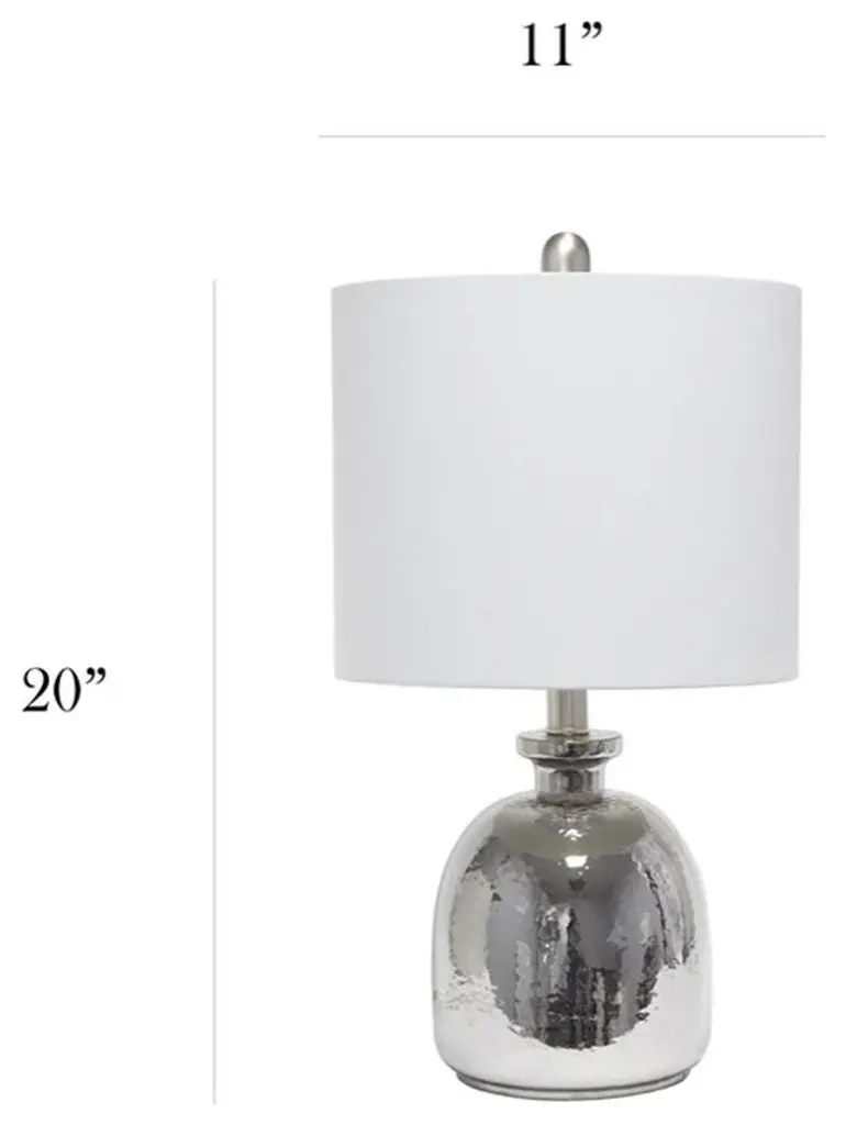 Elegant Designs Silvery Glass Table Lamp with Light Gray ShadeIf you are looking to add a little modern flair to your home, this silvery glass table lamp with a light gray fabric shade is just what you need. This lovely table lamp is crafted with a textured glass base and open bottom, matched with a gray fabric drum shade. This table lamp is the perfect accent piece that will blend all of your contemporary decor to your pictureque vision. Silvery dome glass baseLight gray fabric drum shadeEasily accessible rotary switch located on the socketUses 1 x 60W medium type A base bulb (not included)Lamp measures D: 11" x 20"Finish/Colour :Metallic Gray/ GrayBulbs Included :NoBulb Type :Type A19IncandescentShade diameter :11Number of Lights :1Maximum Wattage :60Shade meterial :FabricCord Colour :Clearcord Length :64.75Product Dimension(L x W x H) :11 x 11 x 20Base Dimensions :L:7 x W:7 x H:13.5