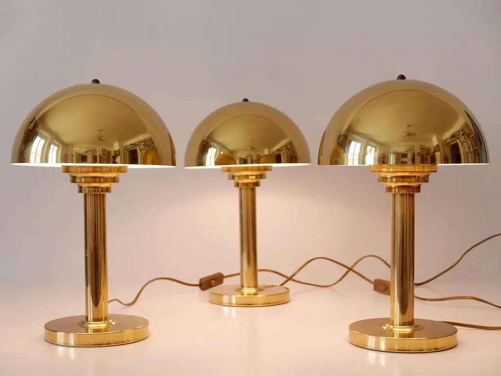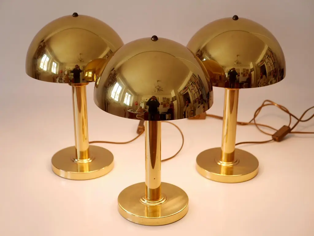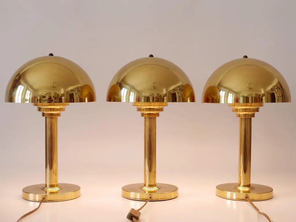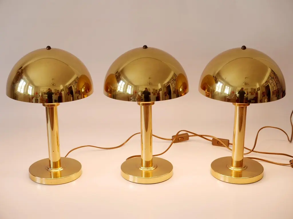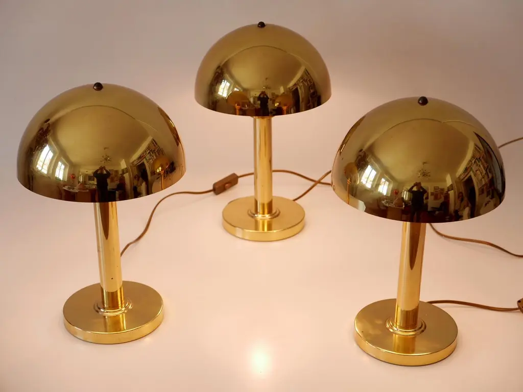 Elegant and highly decorative Mid-Century Modern brass table lamps. Designed and manufactured by WSB, Germany, 1960s.Three identical lamps are available. Price per item.Executed in polished brass sheet and tube, each lamp comes with 1 x E27 / E26 Edison screw fit bulb socket, is wired, in working condition and runs both on 110 / 230 volt. Max. 60 Watt each. Delivery without bulb.Our lights are checked, cleaned and are suitable for use in the USA. For usage in US you would only have to change the plug or get a holiday converter if needed.Condition:Good original vintage condition. Wear consistent with use and age. Please see all images for its condition.Measurements:Dm: 9.85 in (25 cm)H: 15.75 in (40 cm)Weight each ca. 2 KG