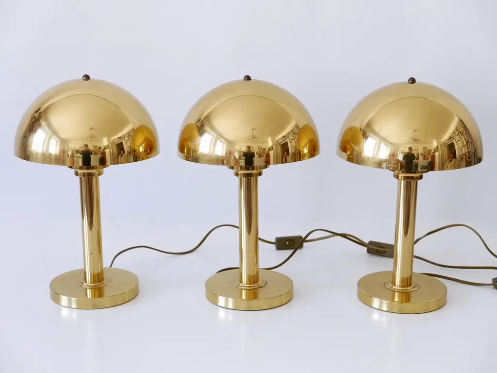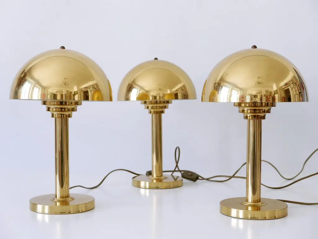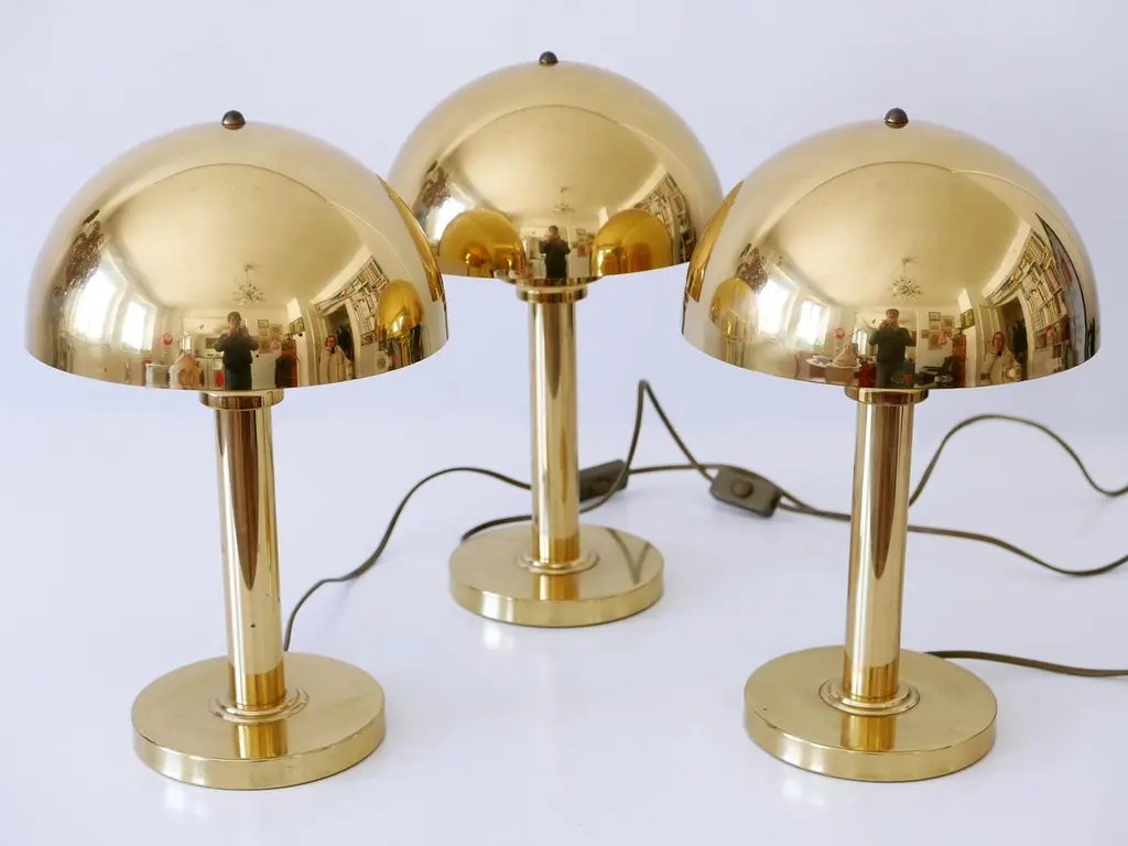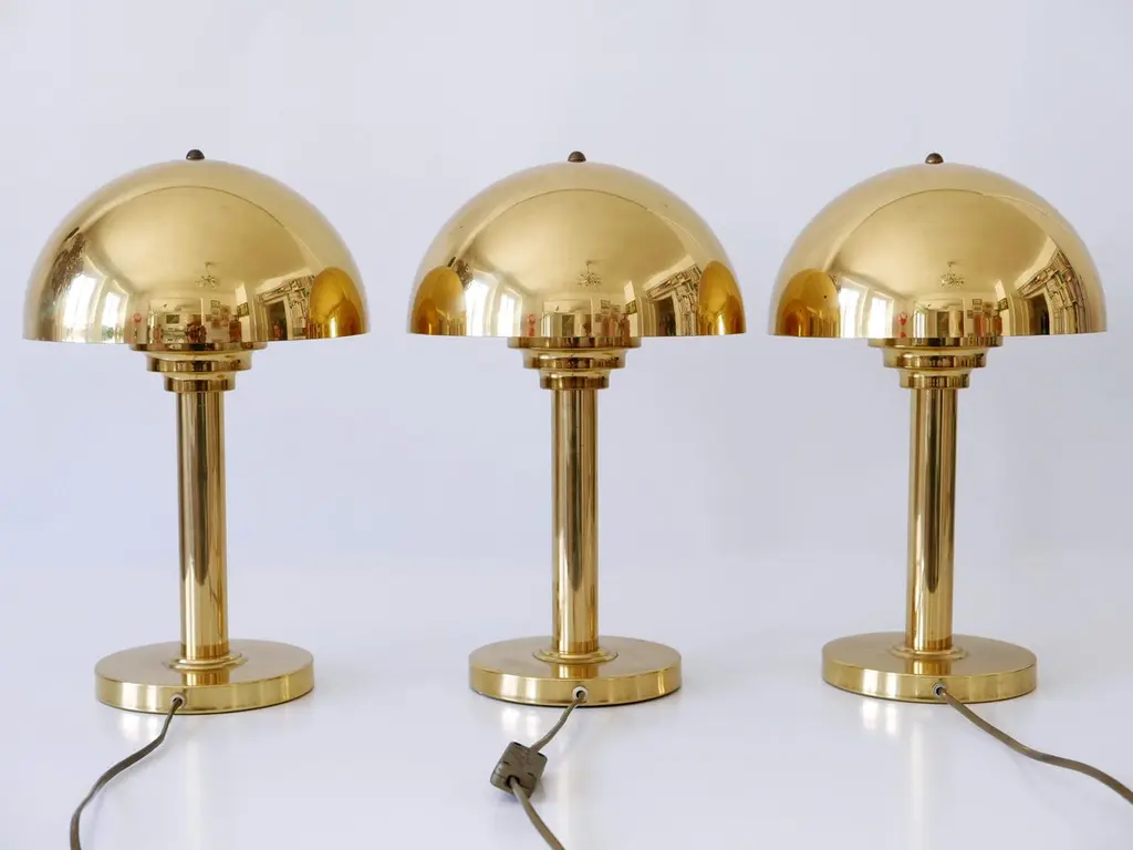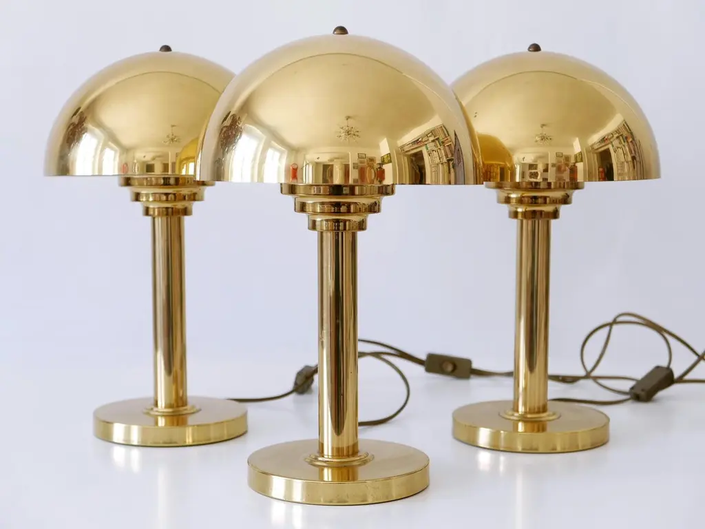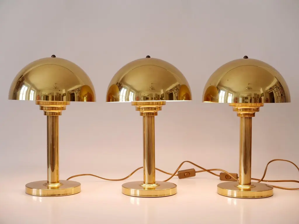 Elegant and highly decorative Mid-Century Modern brass table lamps. Designed and manufactured by WSB, Germany, 1960s.Three identical lamps are available. Price per item.Executed in polished brass sheet and tube, each lamp comes with 1 x E27 / E26 Edison screw fit bulb socket, is wired, in working condition and runs both on 110 / 230 volt. Max. 60 Watt each. Delivery without bulb.Our lights are checked, cleaned and are suitable for use in the USA. For usage in US you would only have to change the plug or get a holiday converter if needed.Condition:Good original vintage condition. Wear consistent with use and age. Please see all images for its condition.Measurements:Dm: 9.85 in (25 cm)H: 15.75 in (40 cm)Weight each ca. 2 KG