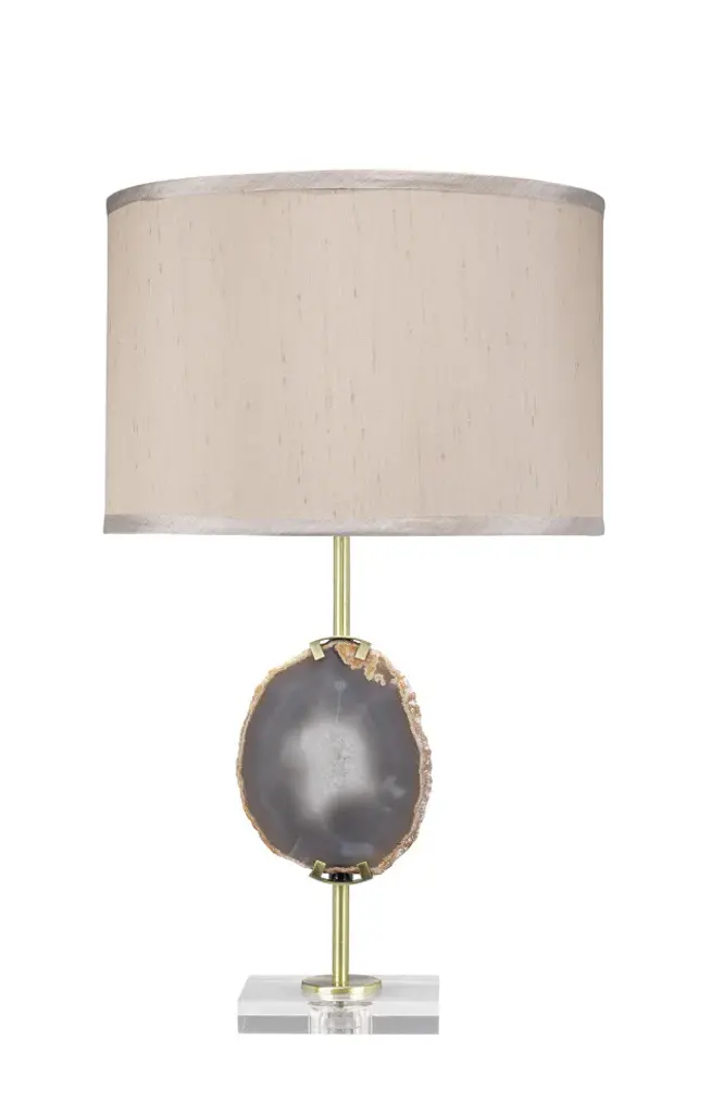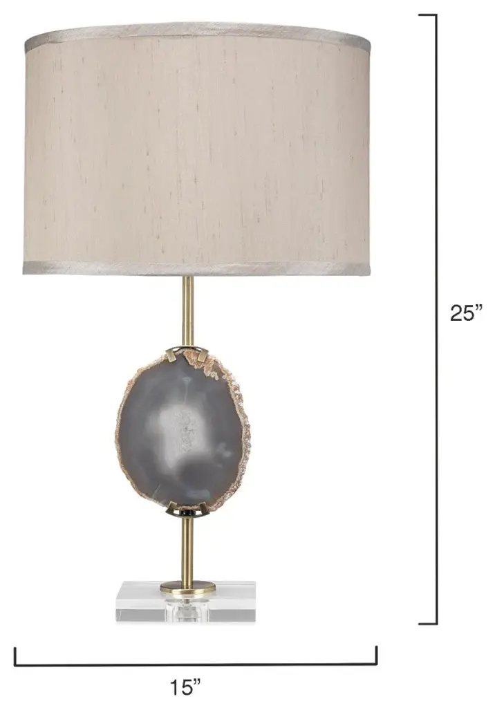 A modern piece with elegant and organic simplicity. The Agate Slice Table Lamp brings its gorgeous stone base to the front of your attention. This semiprecious stone belongs to the quartz family and is often cited to have properties that diffuse negative energy. Made of natural agate stone. Each stone is unique, colors will vary and no two will be identical. Each agate piece will vary in size.• 25"H x 15" dia. Weighs 4 lbs.• Hand Finished Agate, Crystal, and Metal with Faux Silk Shade• UL Listed. Uses 1 max 100W standard Type A bulb (not included). 3 way socket. 8 ft clear cord inch cord.• Heirloom Quality - Expertly hand crafted and hand finished. Due to the hand crafted nature of this piece, each piece may have subtle differences.