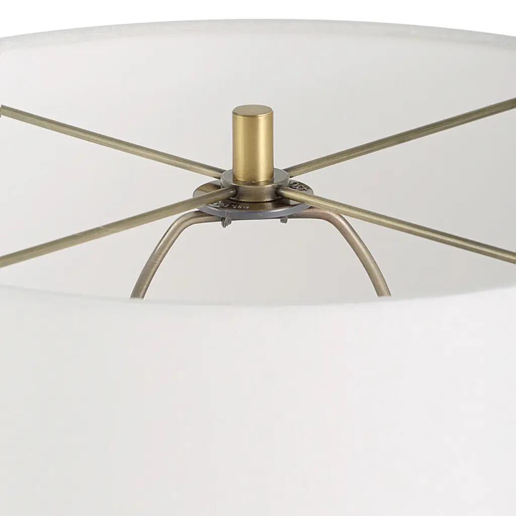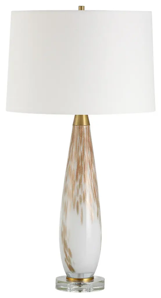 This sleek and slender glass base features a brilliant white background with spotted metallic gold detailing displayed on a thick crystal foot and paired with plated brushed brass accents. The slightly tapered round hardback shade is covered in a crispy white linen fabric.15"W x 15"D x 29"H. Weighs 11 lbs.Hand Finished Glass and Metal. Linen Fabric Shade.UL listed. Uses one max 150W Type A bulb (not included). Three way switch at socket.Heirloom Quality - Expertly hand crafted and hand finished. Due to the hand crafted nature of this piece, each piece may have subtle differences.
