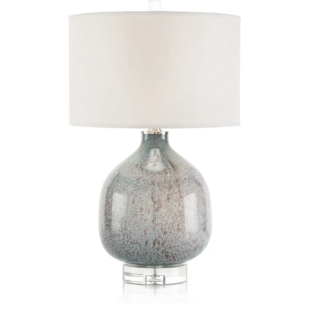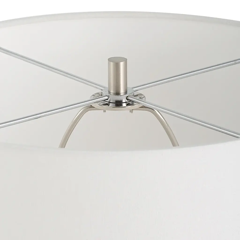 This sleek and slender glass base features a brilliant white background with mottled gray and metallic silver details displayed on a thick crystal foot and paired with plated brushed nickel accents.15"W x 15"D x 29"H. Weighs 13 lbs.Hand Finished Art Glass and Crystal. Linen Fabric Shade.UL listed. Uses one max 150W Type A bulb (not included). Three way switch at socket.Heirloom Quality - Expertly hand crafted and hand finished. Due to the hand crafted nature of this piece, each piece may have subtle differences.