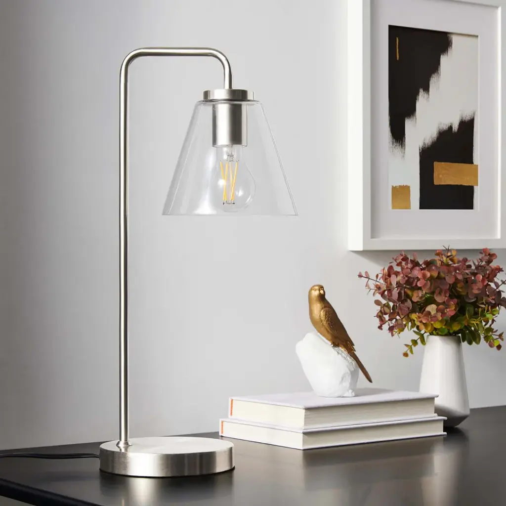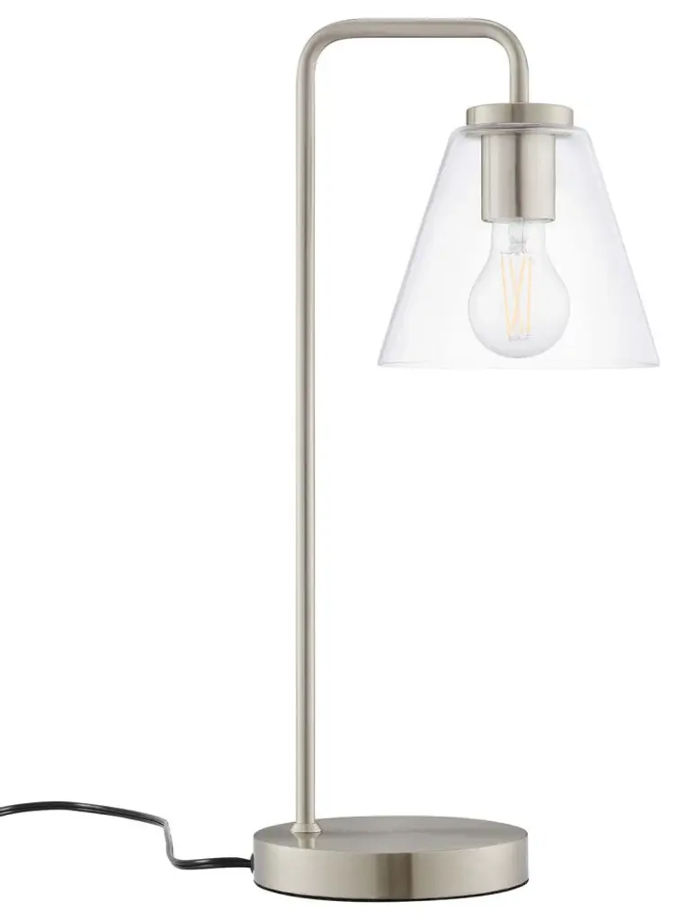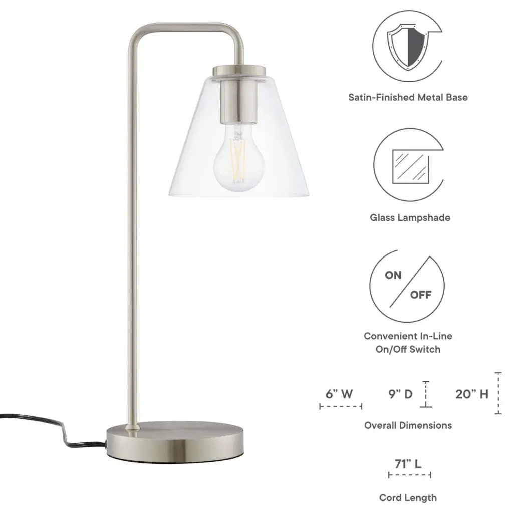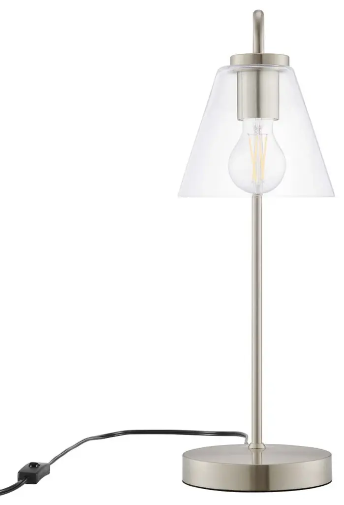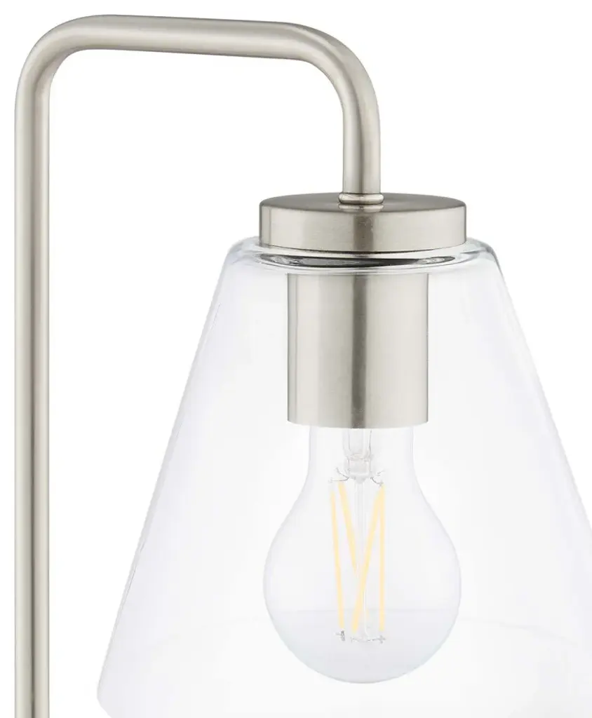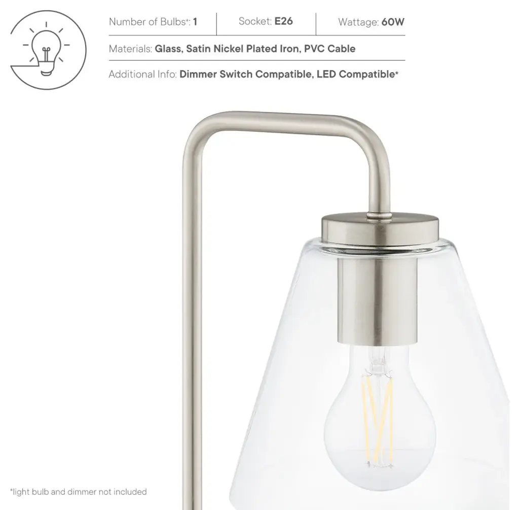 The Element Glass Table Lamp accentuates your home dcor in the living room, bedroom, office, or study room with its distinctive mid-century modern aesthetic. This side table lamp brings farmhouse appeal to mid-century modern, contemporary, rustic, or eclectic decors, boasting a classic transparent glass cone shade. An ideal desk lamp for the home office, Element is solidly constructed with a bent-pipe arm and a round iron base. This dimmable coffee table lamp is equipped with a black power cord and a convenient on/off switch. Requires 1 E26 60W max bulb or LED equivalent (not included). Compatible with dimmer switches (not included). Assembly required. Clean with a soft, damp cloth.Set Includes:1 - ElementTransparent GlassIron BaseBlack Power Cord With On/Off SwitchBulbs: 1 E26 60W Max (Not Included)LED Compatible; Assembly RequiredDimmable (Switch Not Included)Clean With Soft Damp ClothProduct Color : Satin NickelAssembly Required : YESOverall Product Dimensions: 9"L x 6.5"W x 20"HShade Dimensions: 6.5"L x 6.5"W x 5.5"HBase Dimensions: 65"L x 65"WProduct Weight : 4 lbs.Product Materials : Transparent glass shade, iron base and tube, Black PVC cable, 1800MM cord