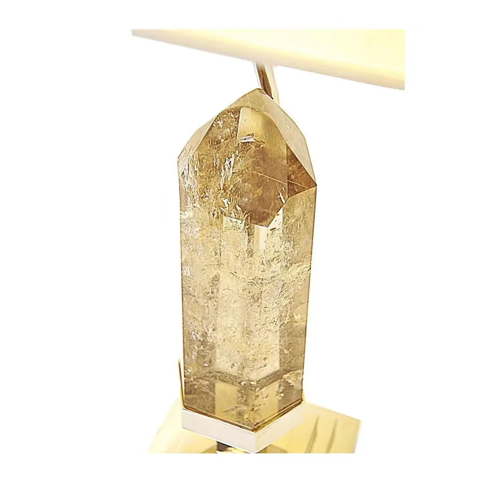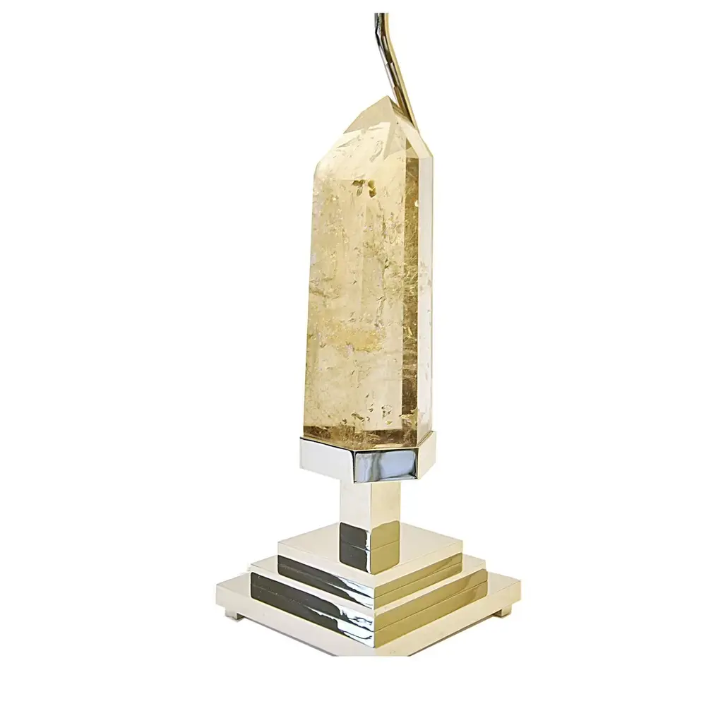 This lamp is perfect for adorning a living room, bedroom or even a sophisticated office environment. An irregularly hand-cut piece of light Smokey Quarts is Elevated on a pyramid like structure in nickel plated brass which was meticulously hand crafted. This striking material comes from Madagascar and is a powerful stone often used to remove negative energies and to restore harmony in any setting. The shade of this lamp is in a creamy white and its brass base can be adjusted in its size according to customer needs.