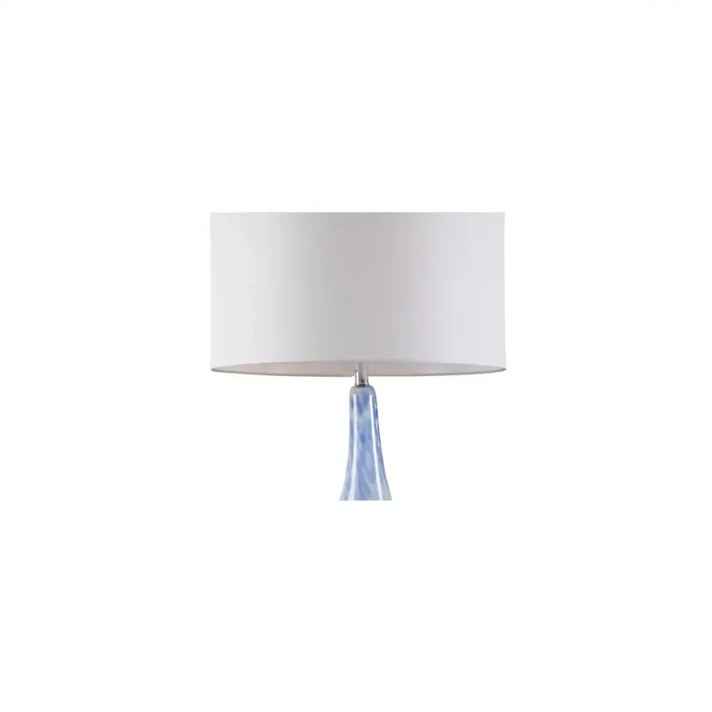 A simple shape gives a clean and airy look to the elio lamp. Its opaque white and light blue glass sits atop an acrylic base with a white shade and brushed nickel details.Hand blown. Natural variations in color and slight imperfections in the glass.