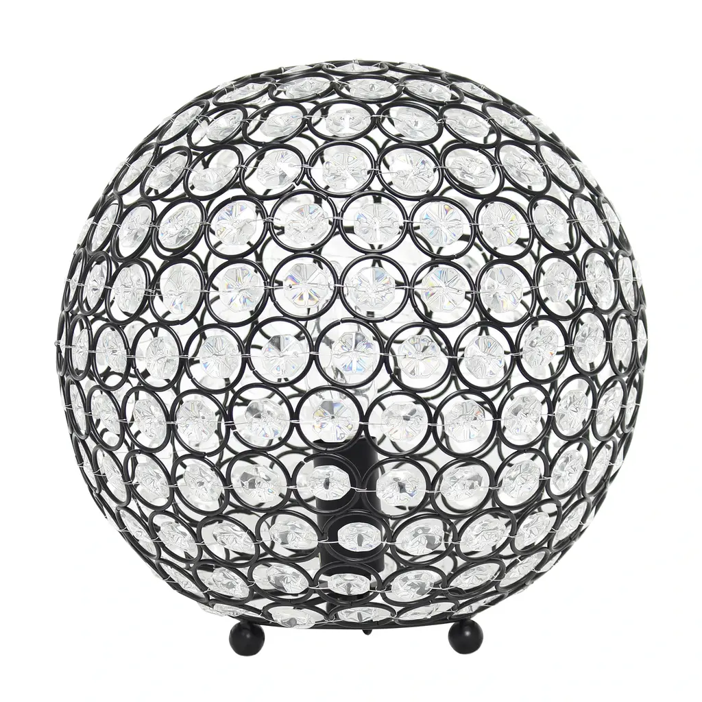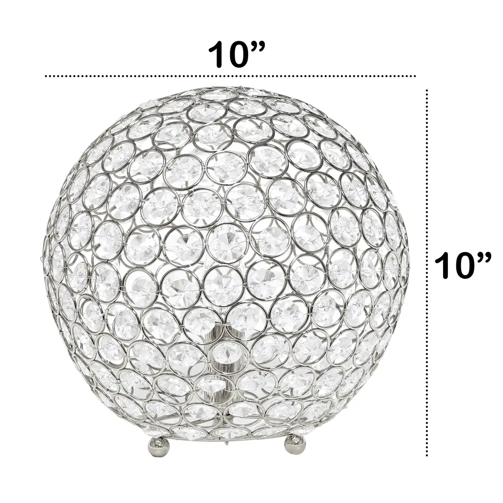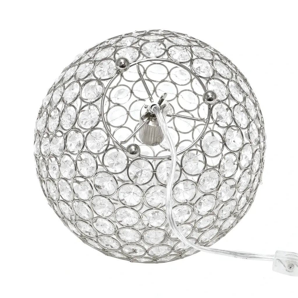 This 10" sphere shaped table lamp is a designer's dream with its gorgeous shimmering crystals surrounding the rounded metal frame, available in a number of finish options ranging from a classic gold, to a modern chrome. With the turn of a gear (rotary) switch on the cord of the lamp, a rich glow shines through the crystals, leaving your space breathtakingly illuminated.Features: